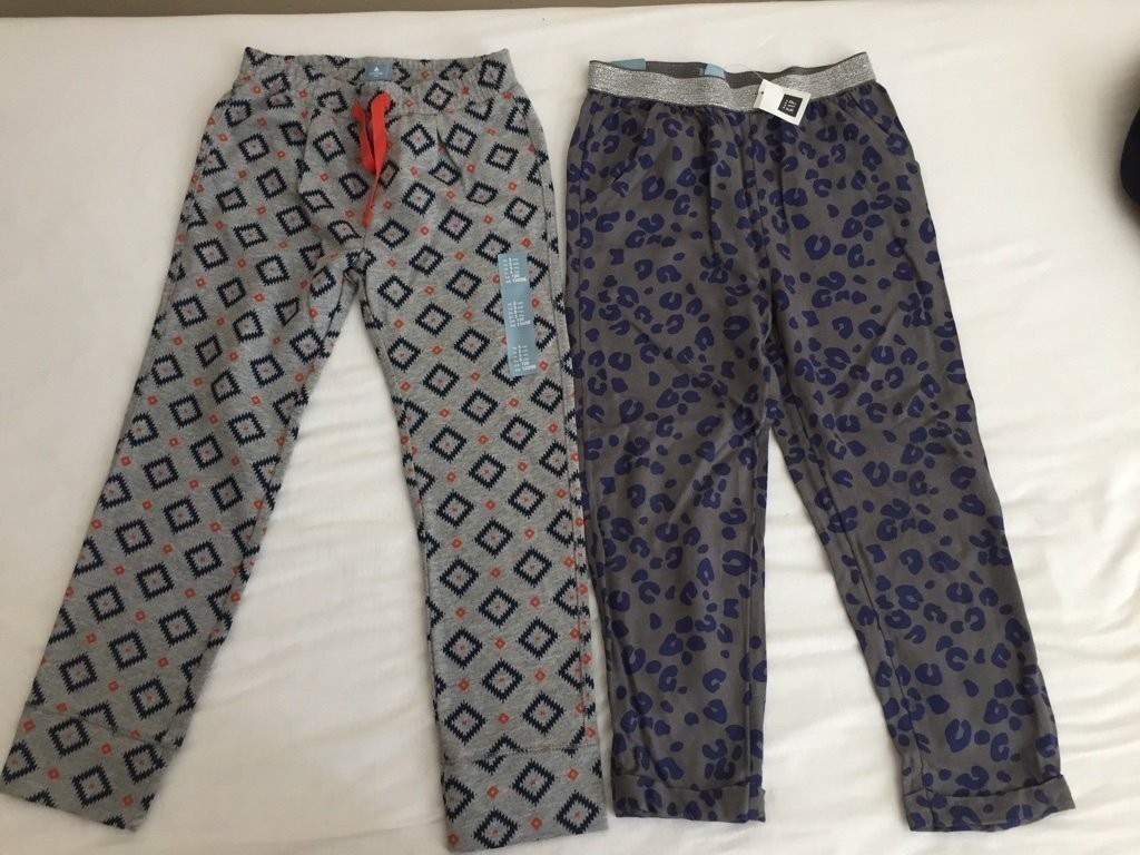 Nove s visackami, uvedena velkost 5/120cm ,no skor ako 4/110 cm v pase na gumu. Jedny su french terry, druhe rayon/ viskoza padave a tenke. Su z USA .
