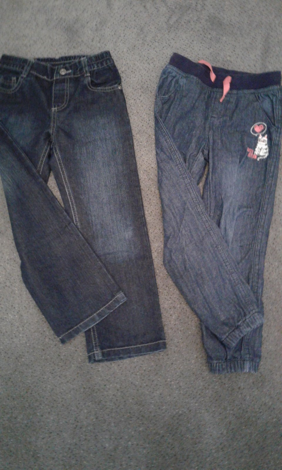 Tmavo modre rifle - 116, aj pre chlapcov, aj pre dievcata. Rifle s obrazkom - 110 - dievčenske. Výborný stav. Aj osobitne.