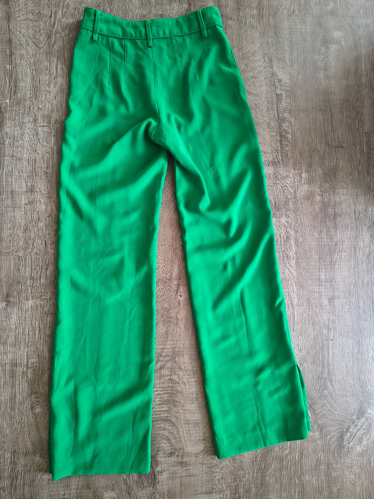 Super stav. Nohavice 7/8nové s pukmi, v páse od bokov dozadu guma,vpredu šnúrka na viazanie. Vpredu vtecka, vzadu falošné. Pohodlný strih. Farba sa mi ťažko fotí. Taká bledšia hrášková. Pás v kľude...