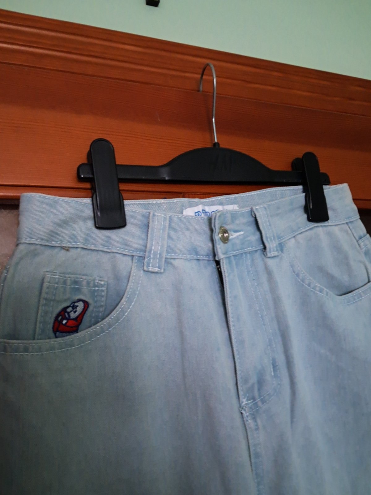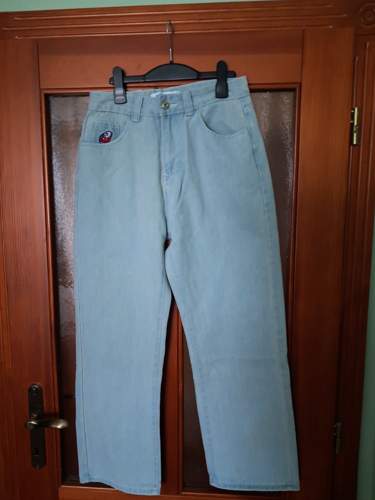 Úplne svetlomodré, takmer bielo sivé. Ani raz neboli použité, nesadla veľkosť. Rifľovina. Rozmery: pás 73 cm, celková dľžka 96 cm, šírka nohavice v strede stehna: 53 cm, šírka nohavice na spodnom okraji: 46 cm.