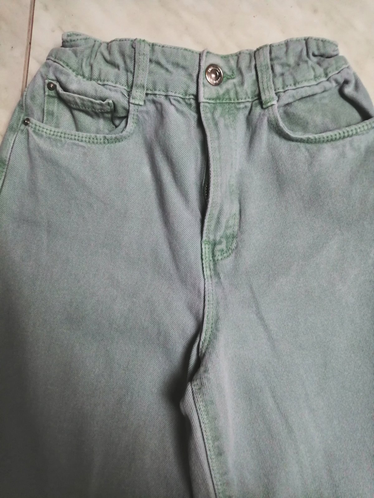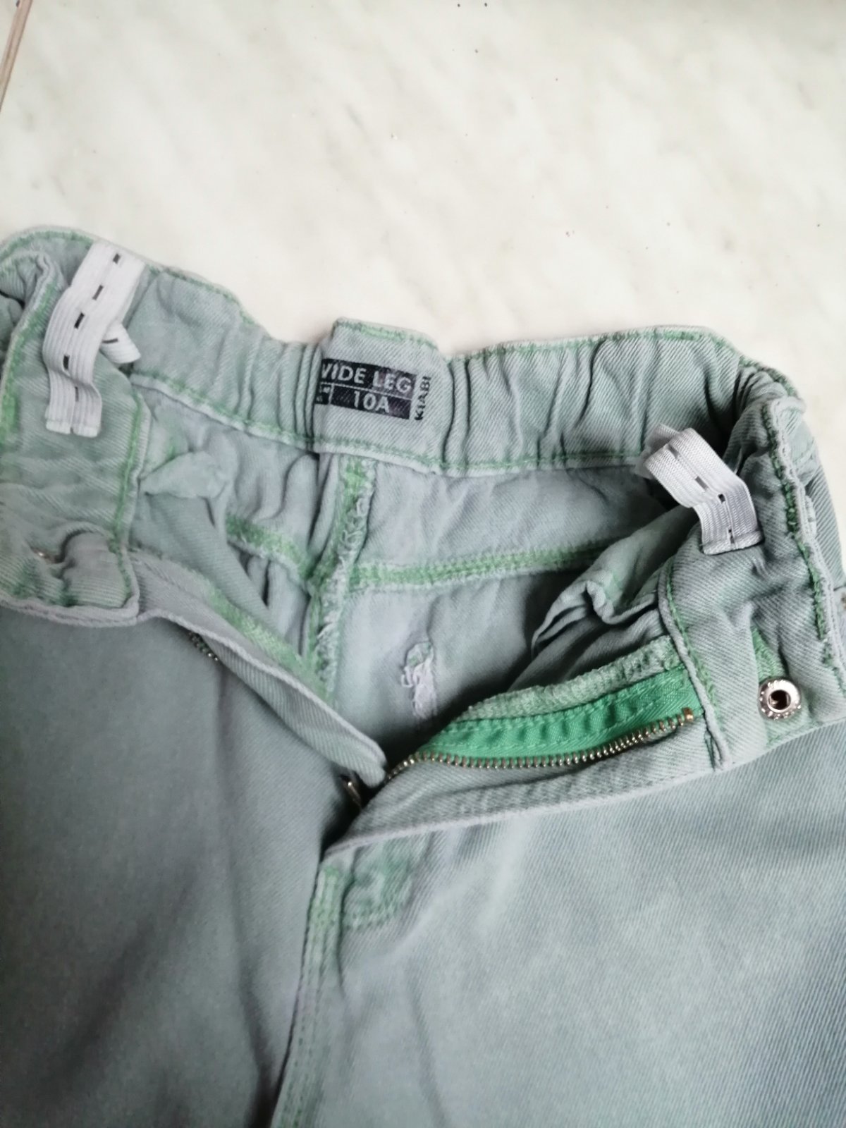Rifle pre dievčatka olivovej farby, pas je na posuvnu gumicku, obvod pasa je 60 cm, da sa upraviť a dĺžka je 81 cm