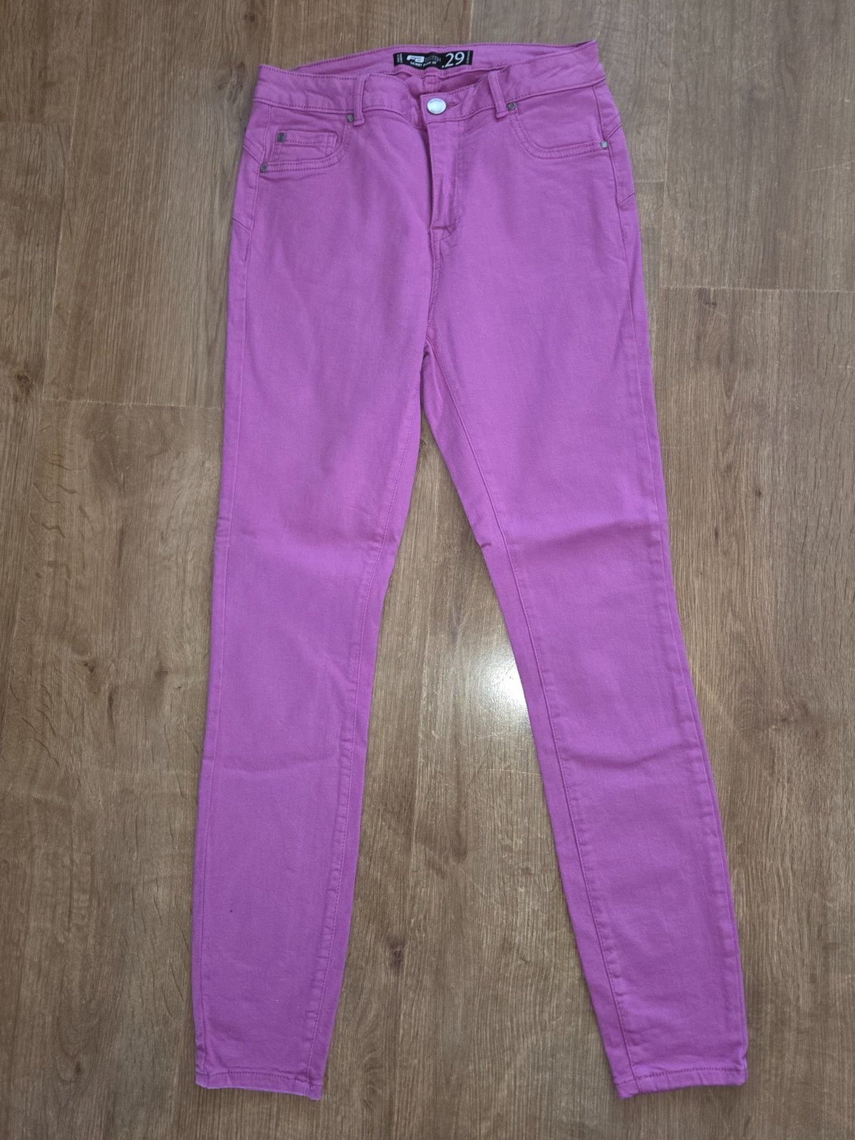 Predám malo nosené elasticke skinny rifle, veľmi pekná ruzovofialova farba ako na foto. Vel. 29, S.