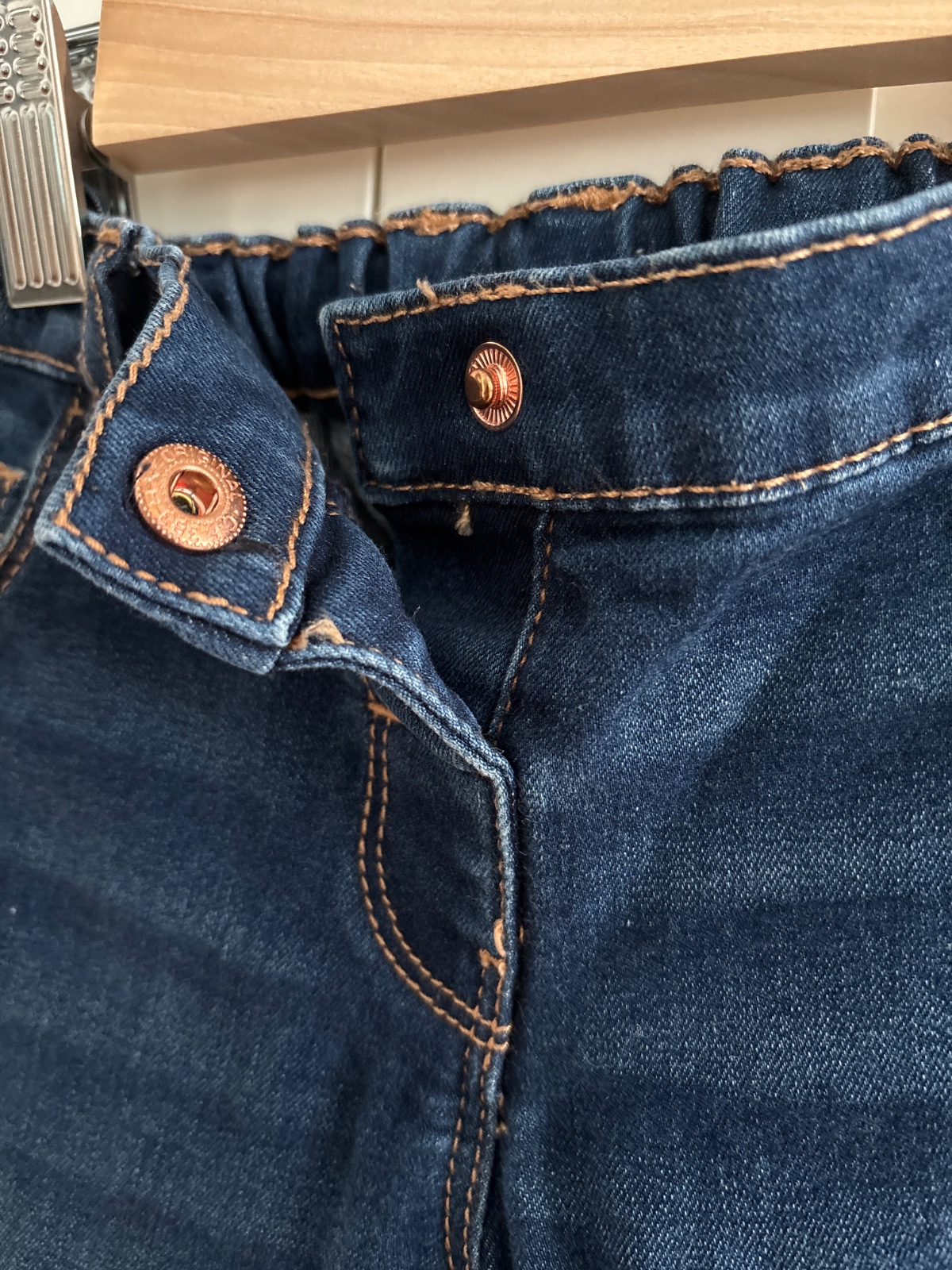 Tmavomodré rifle zn.Next,veľkosť 116, nastaviteľný pás,zapínanie bez zipsu.Žlté prešívaním.Nosené príležitostne.Top stav-ako nové.Po jednom dieťatku.
