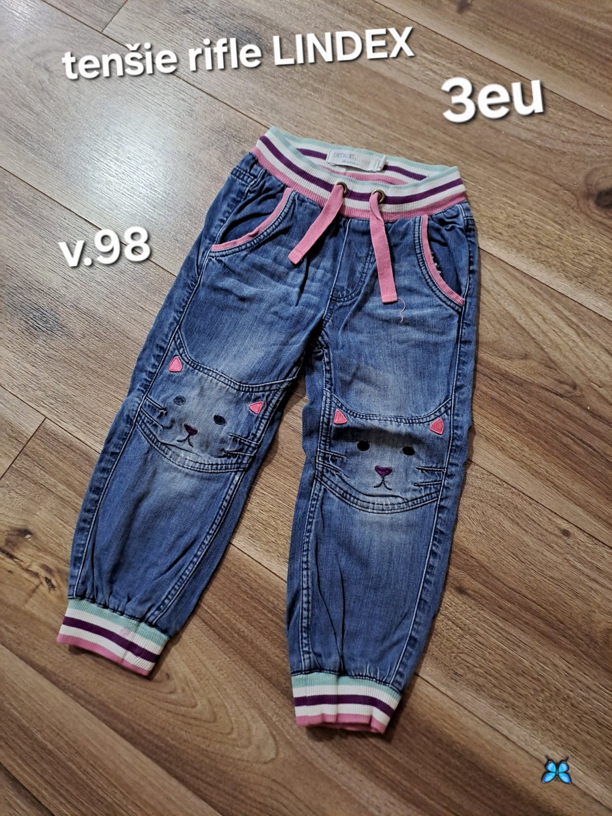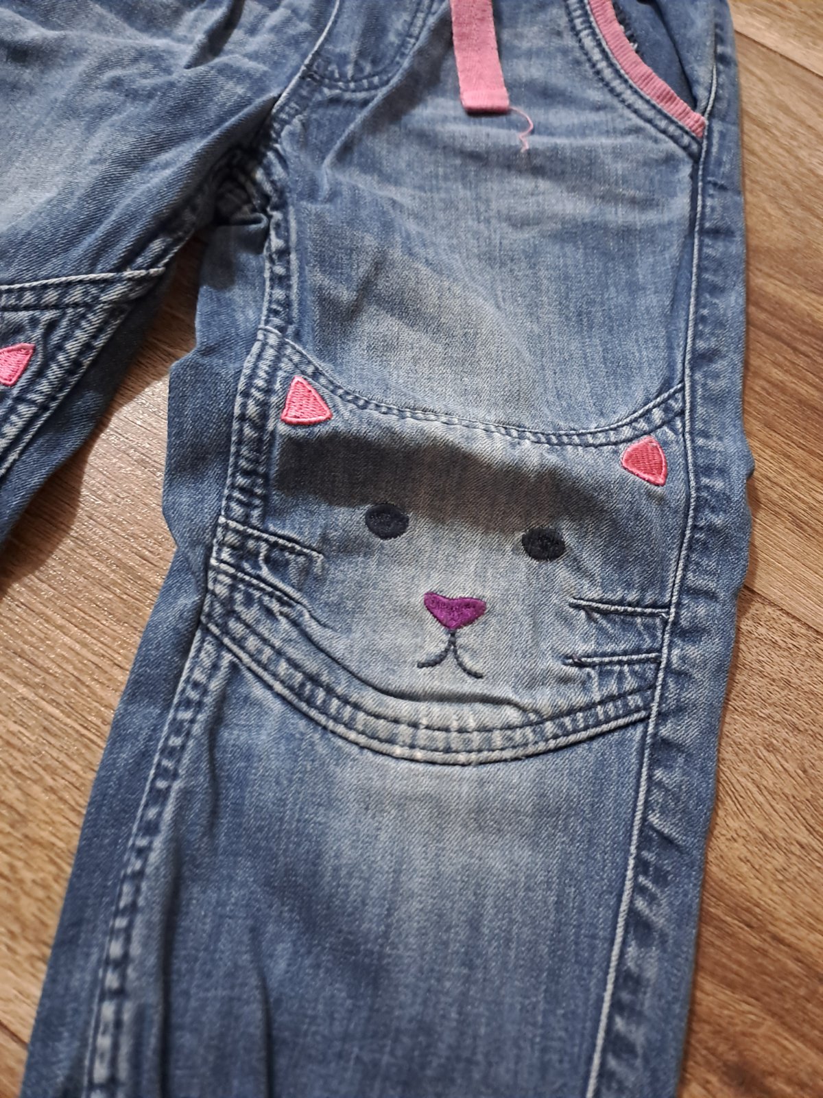 Krasne rifle s aplikaciami maciciek a ozdobnym vyhnutim. Su z kvalitnej hrubsej rifloviny a vo vybornom stave. Na nohavici v pravo slabucko vidno dva fliaciky, podarilo sa mi ich vyprat, takze noha...