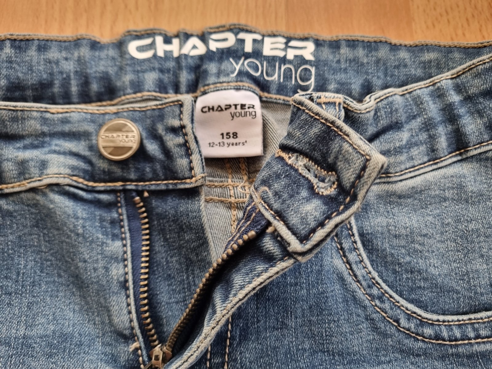 Chlapčenské rifle zn. Chapter Young, veľkosť 158 /12-13 rokov/, modrej farby so zapínaním na zips. Dĺžka 96 cm, obvod pása 66-78 cm /v páse je guma, dá sa prispôsobiť, aj stiahnuť na štíhlejšiu postavu/.