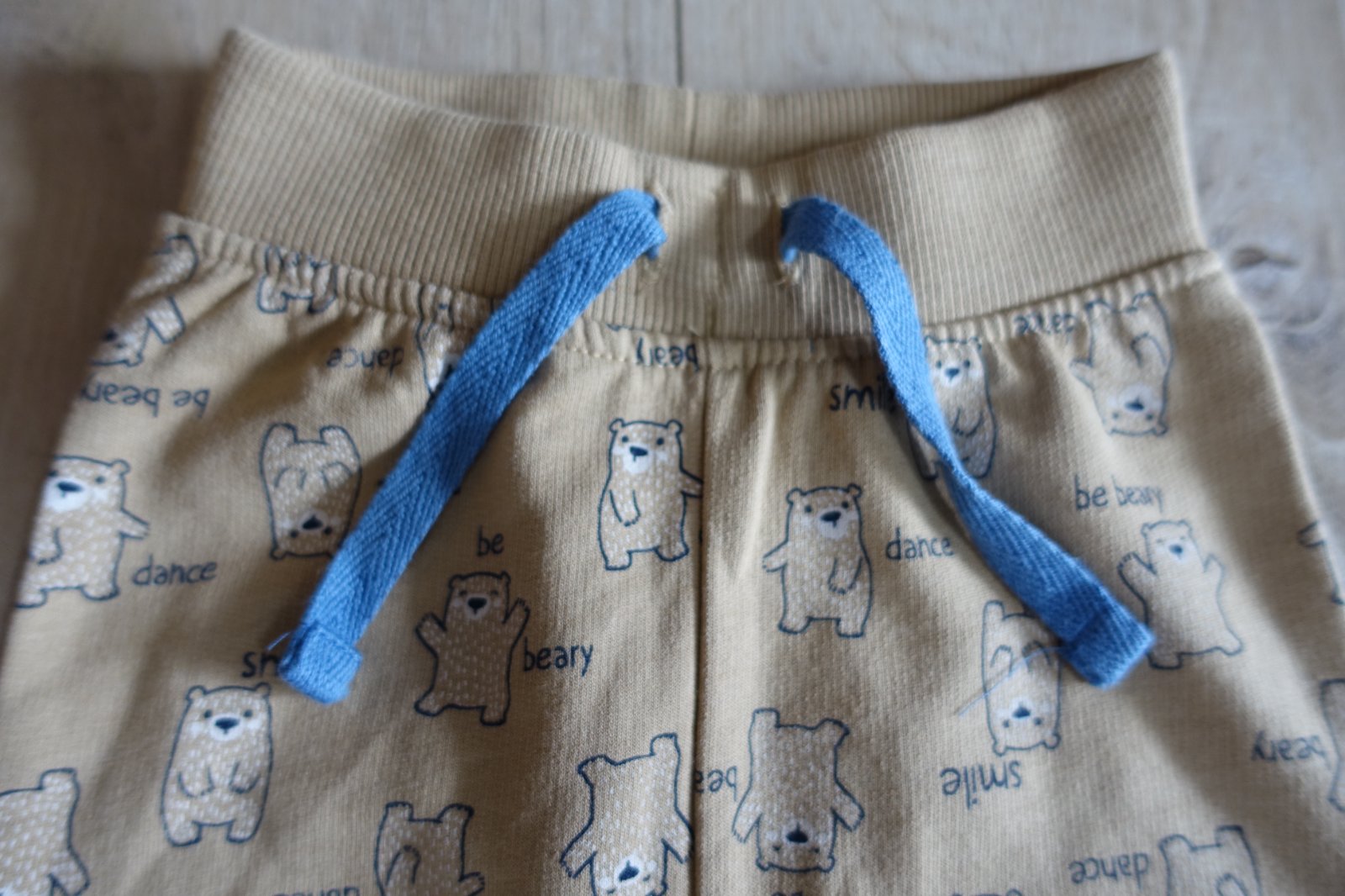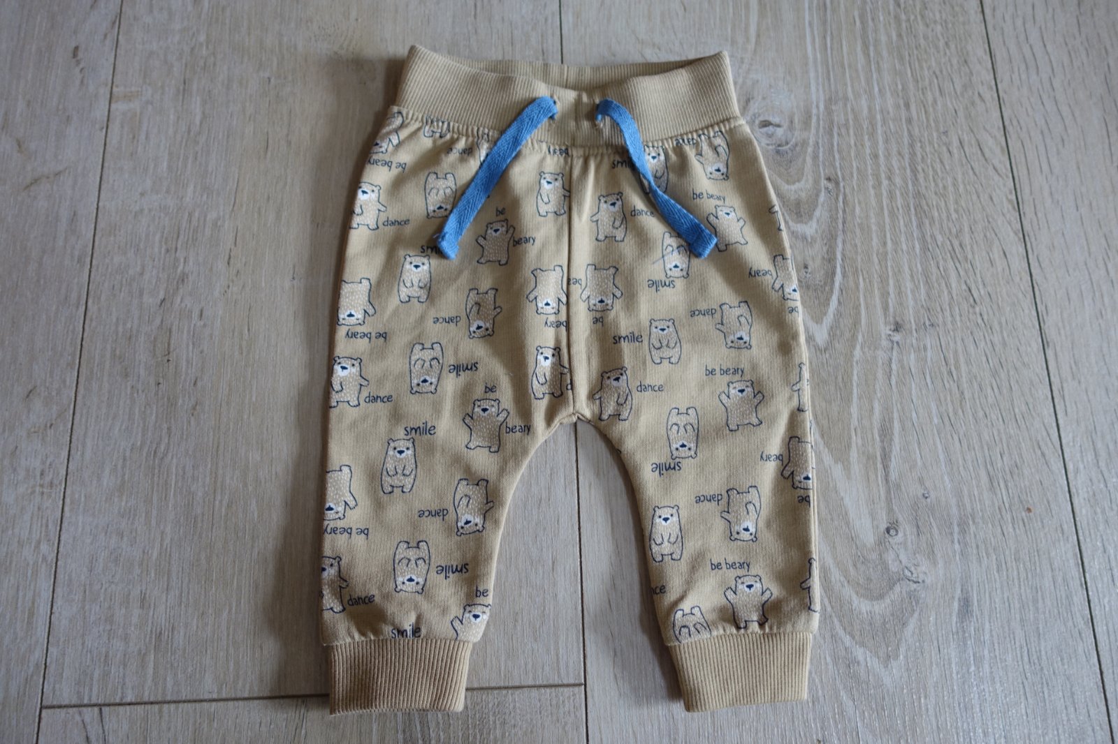 Predám krásne, mäkké a pohodlné podteplené tepláčiky s mackami. Mali sme ich pár krát, žiaľ už pri naklonení, akoby sa chcel tvoriť už chĺpoček z prania, ale nie sú žmolkavé. Celková dĺžka tepláčikov je 34 cm. Šírka pásu v kľude je 17,5 cm. Šnúrky sú nefunkčné, sú iba na okrasu. (B)