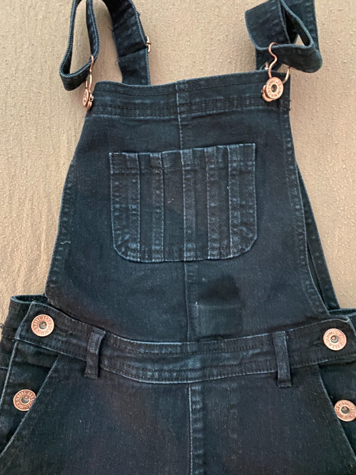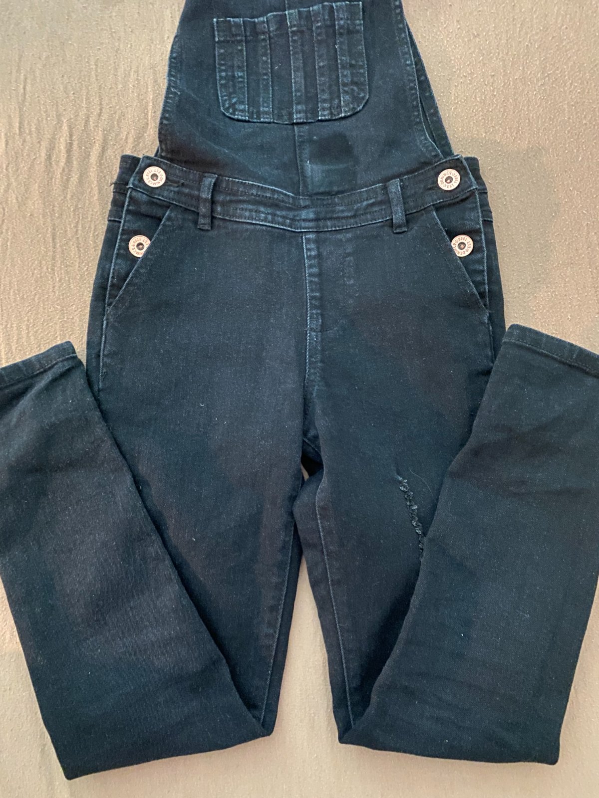Čierne rifle na traky, na obidvoch stranách sa zapínajú na dva riflové gombíky, vrecká sú vpredu, vzadu aj na živôtiku, nohavice sú rovného strihu, dĺžka od pása je 77cm a od rozkroku 59cm.