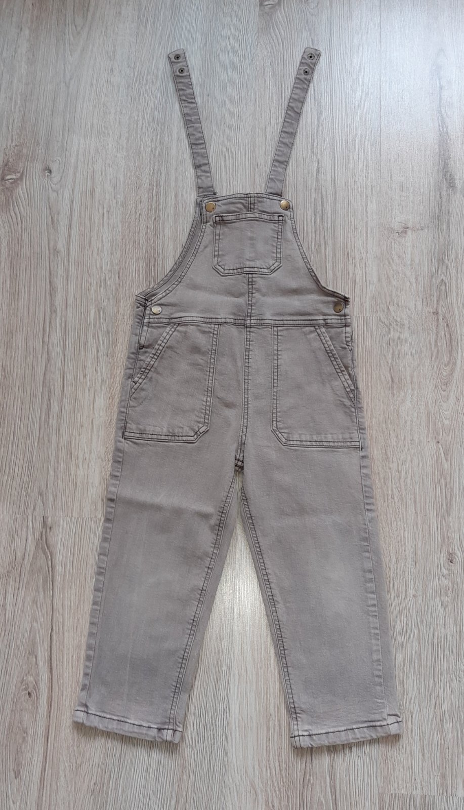 Chlapčenské rifle na traky s vypraným efektom vo veľmi dobrom nosenom stave (bez dierok, fliačikov a žmolkov; jemne spraté (detail viď foto č. 1 a 2)). Nohavice majú klasický strih, nastaviteľné traky (2 možnosti nastavenia pomocou odopínacích patentov) a 4 otvorené vrecká (jedno náprsné, dve bočné a jedno zadné vrecko). Materiál: bavlnená látka s prímesou elastických vláken. Značka: Reserved; veľkosť: 104 (3 - 4 roky).