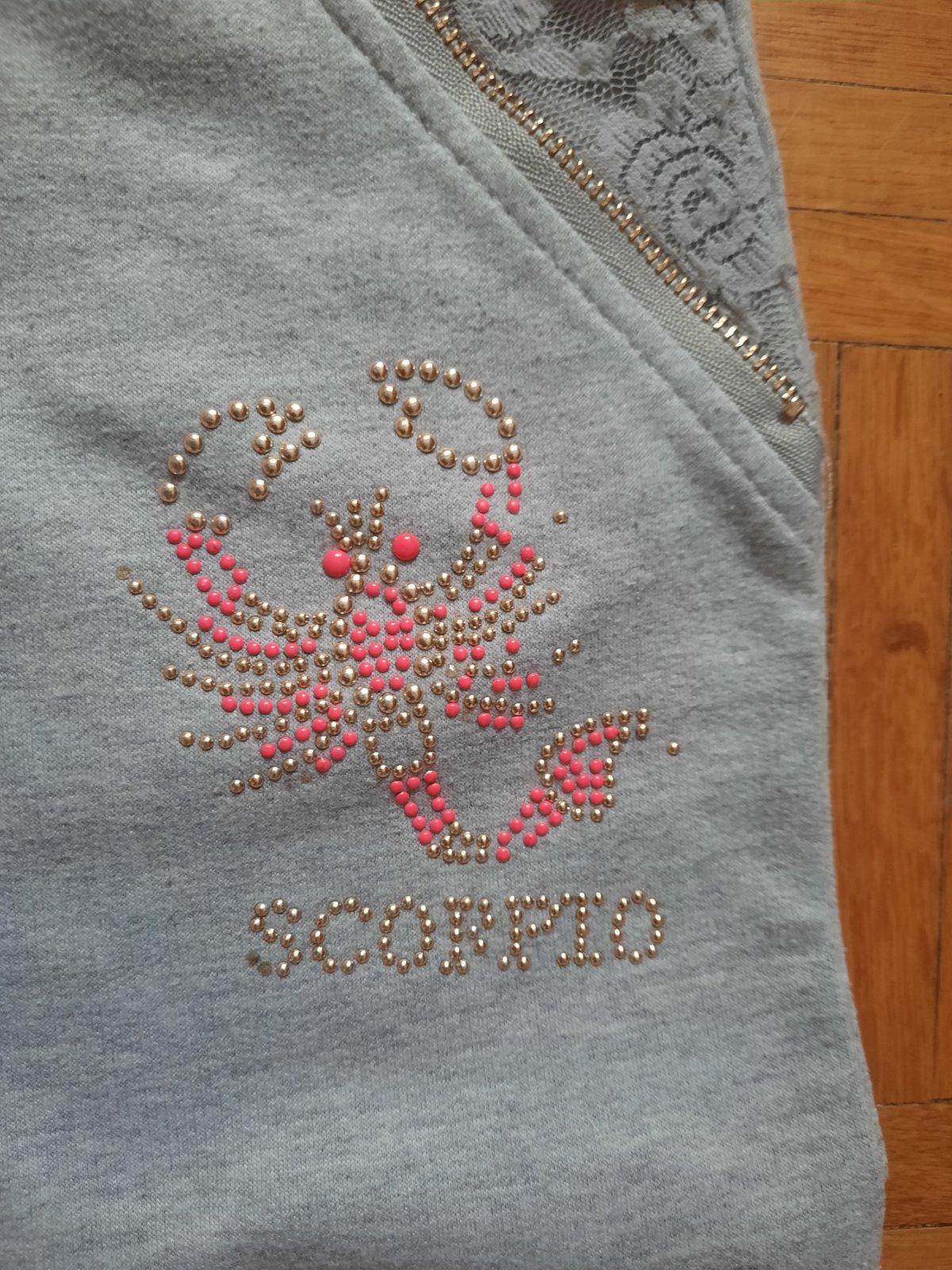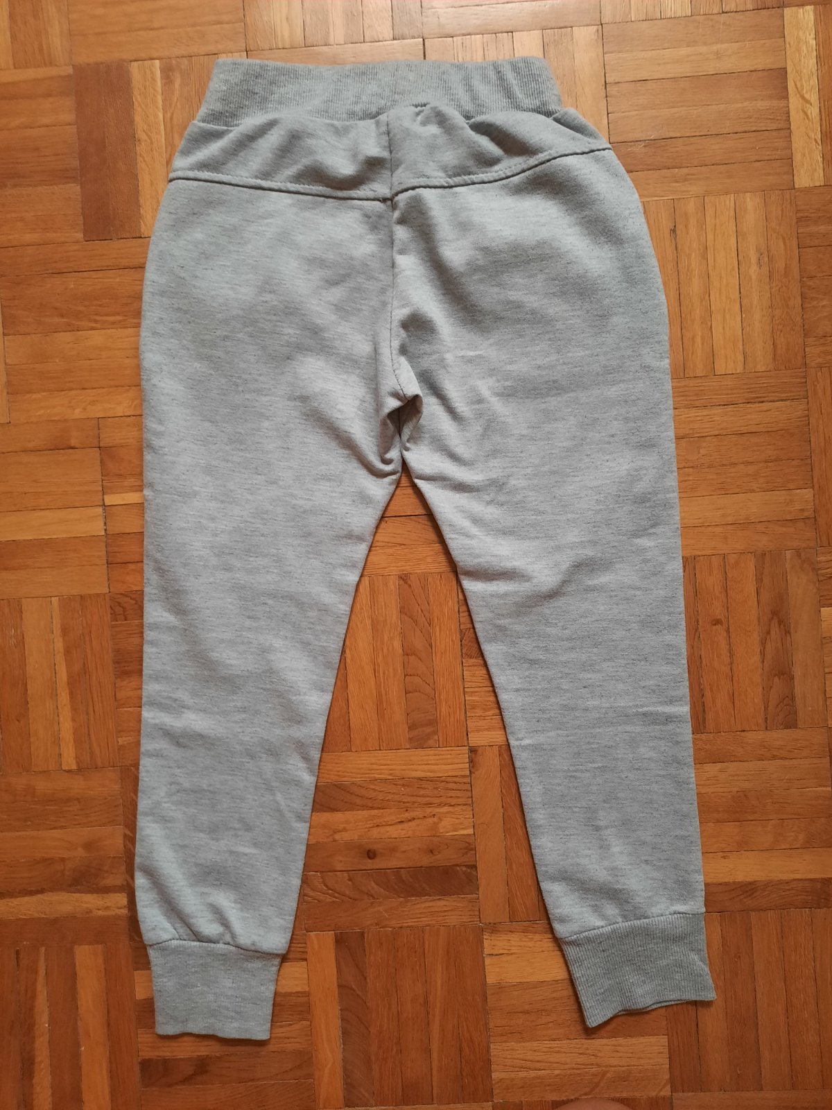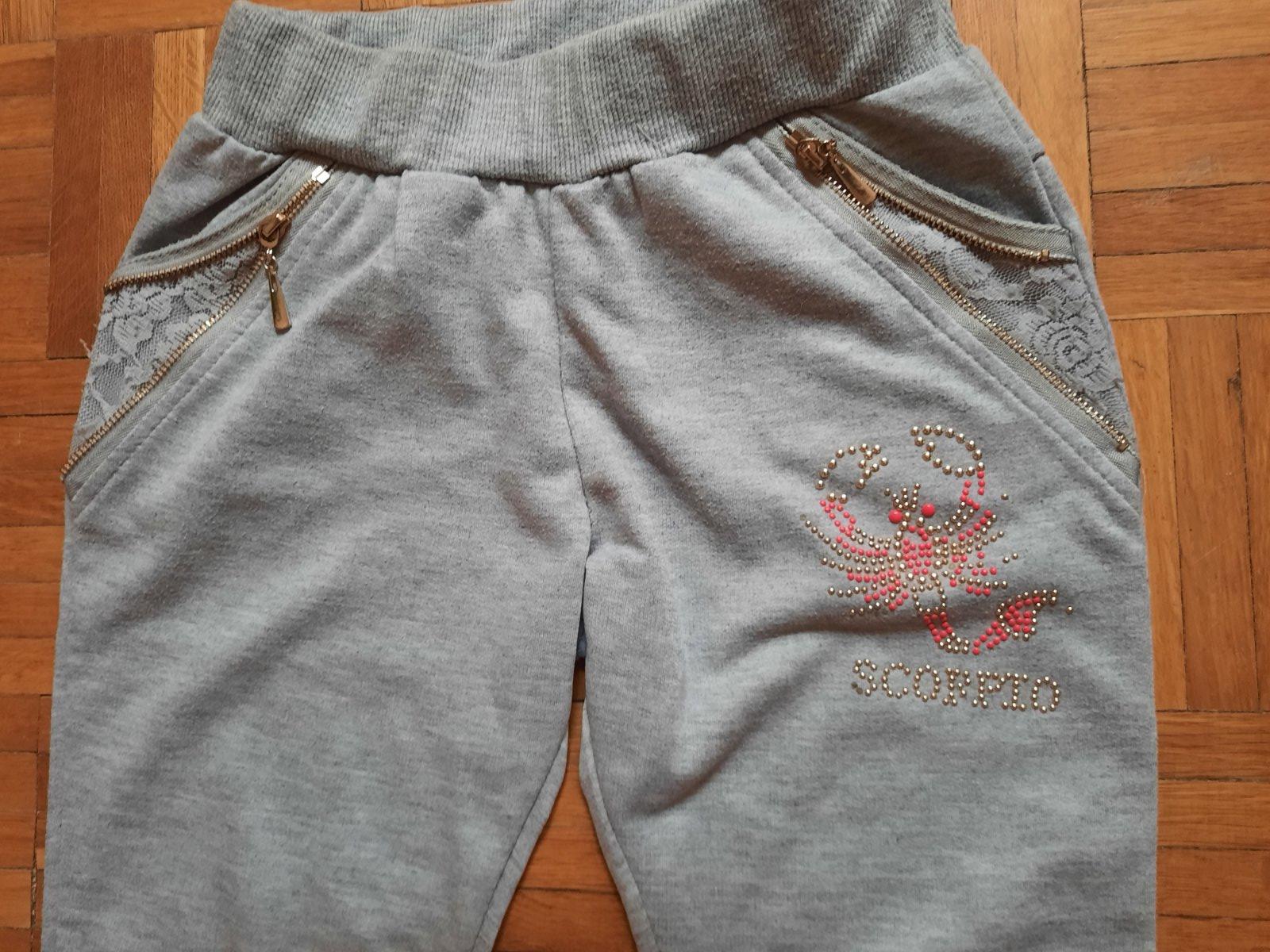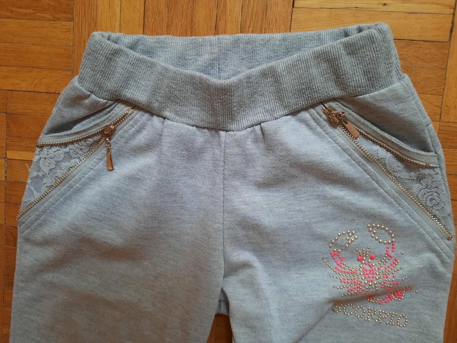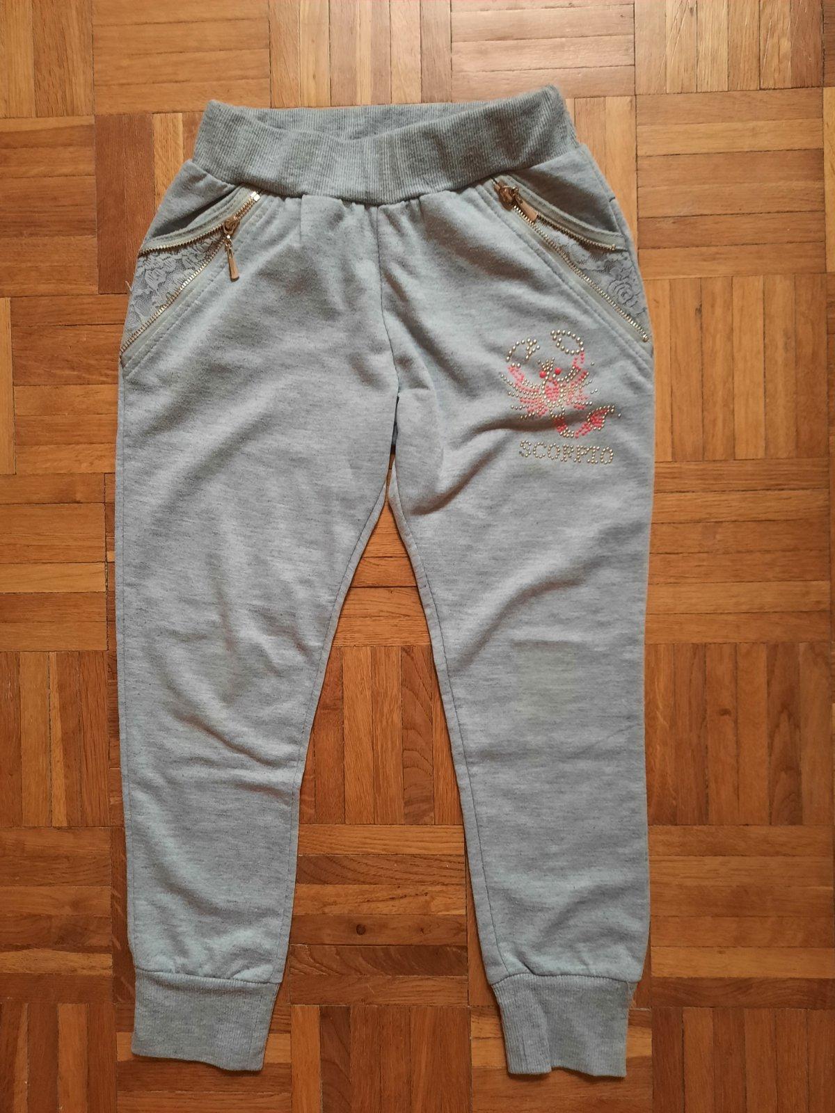 Dievčenské tepláky s ozdobnými vačkami. Pás je na gumu. Veľmi pekný stav.