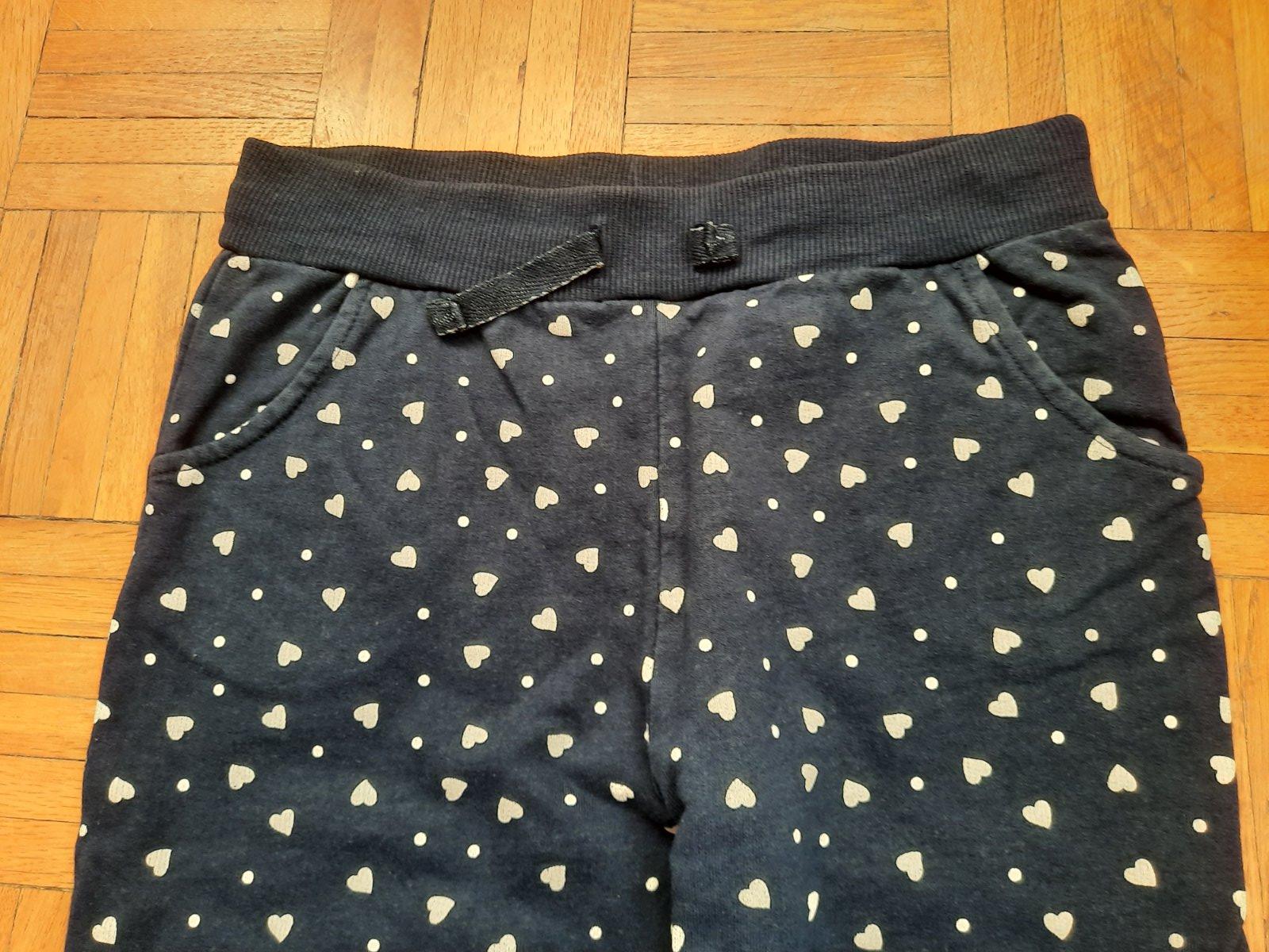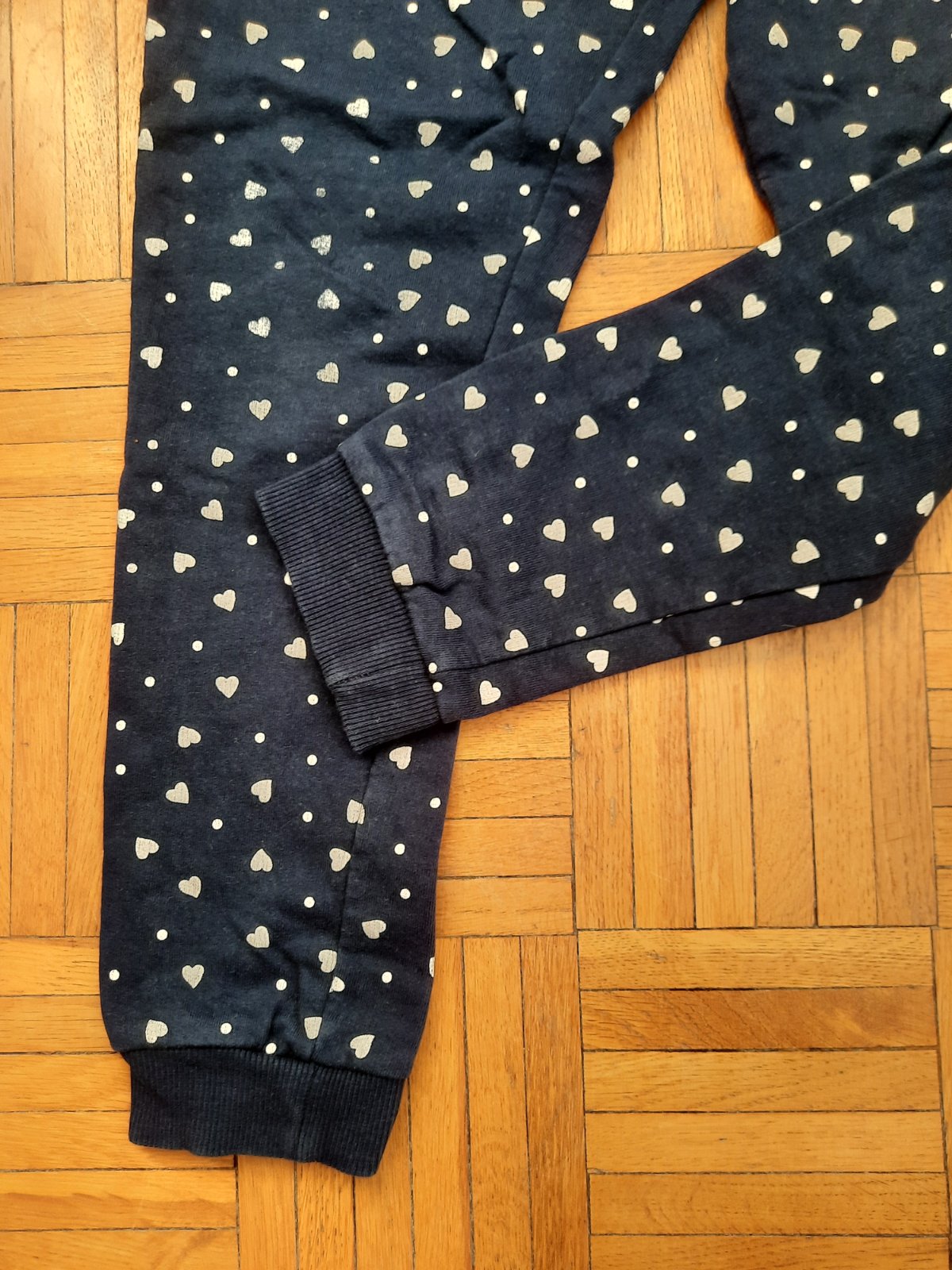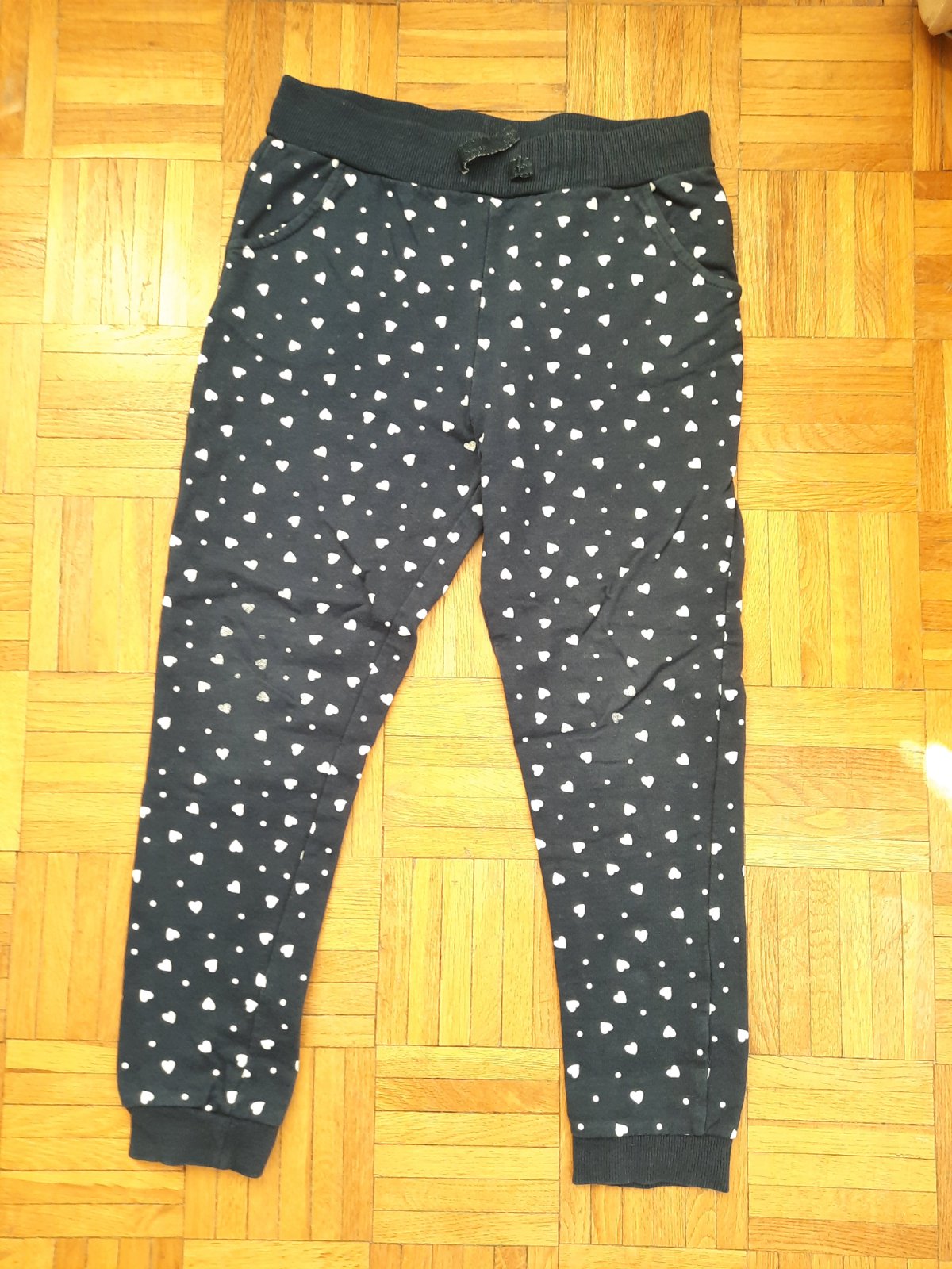 Pekné tmavomodré tepláky s bielymi srdiečkami. Dole sára na manžetu, pás na gumu. Vpredu sú vačky. Pekný stav.