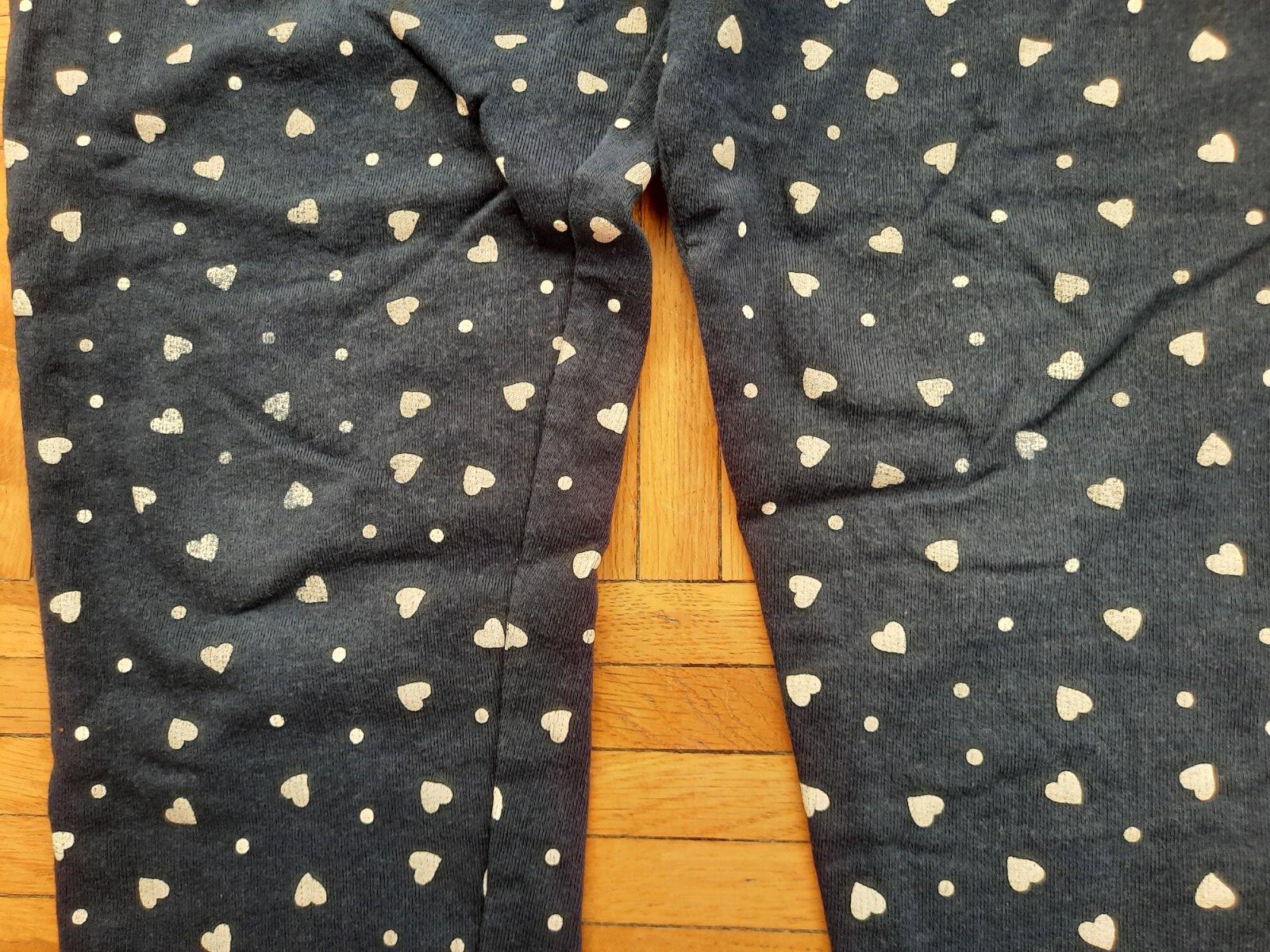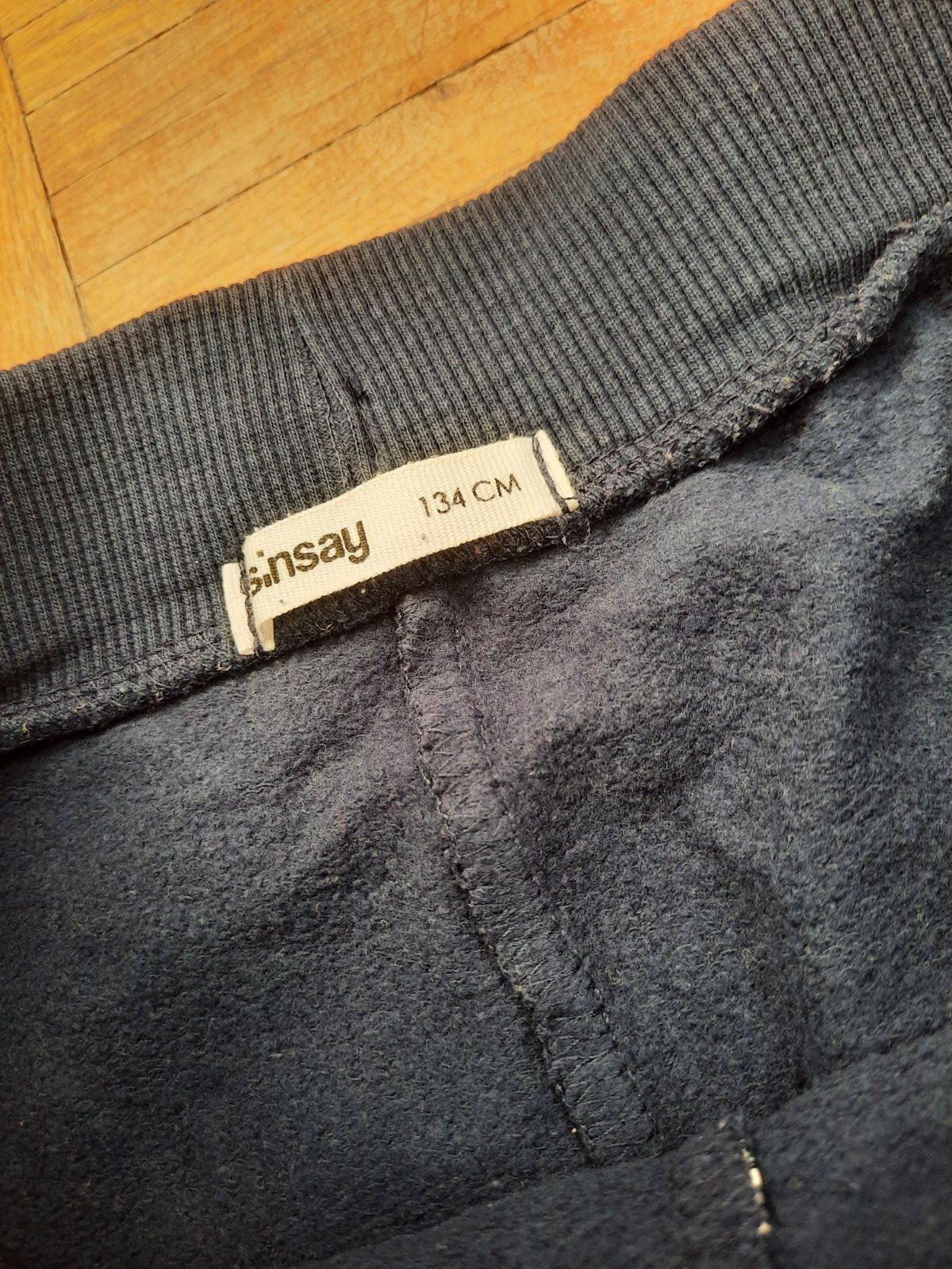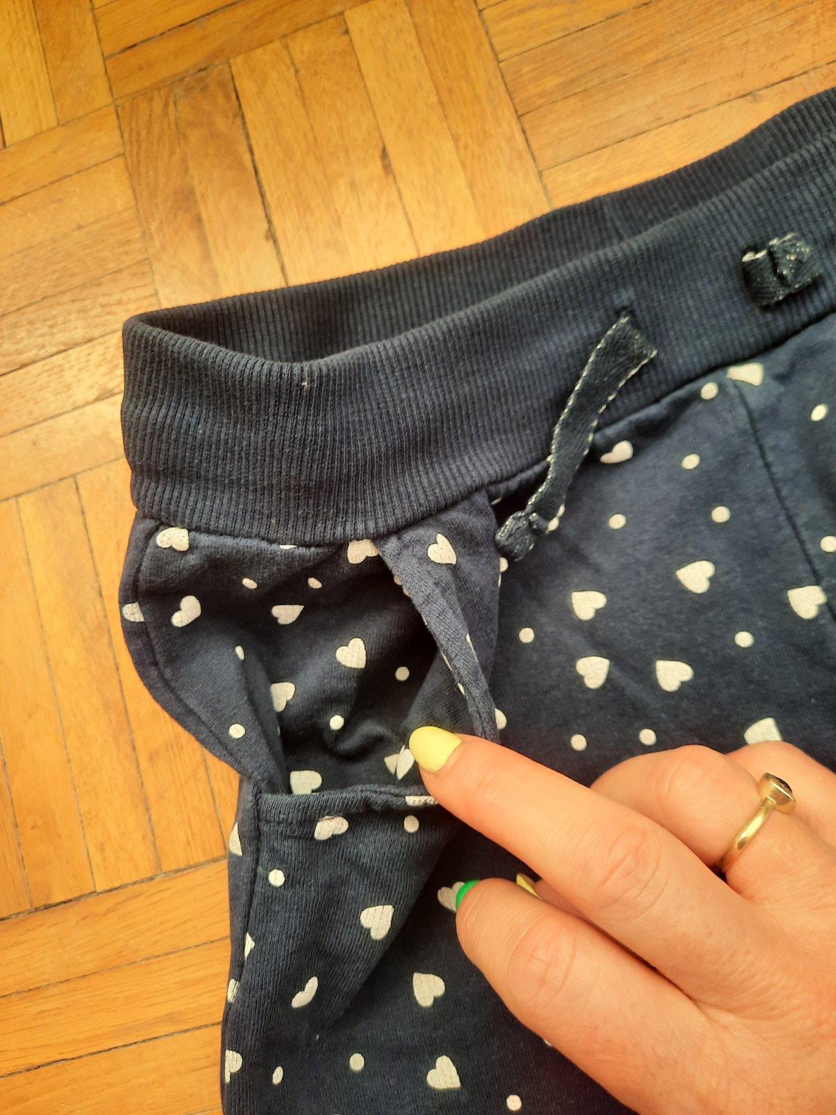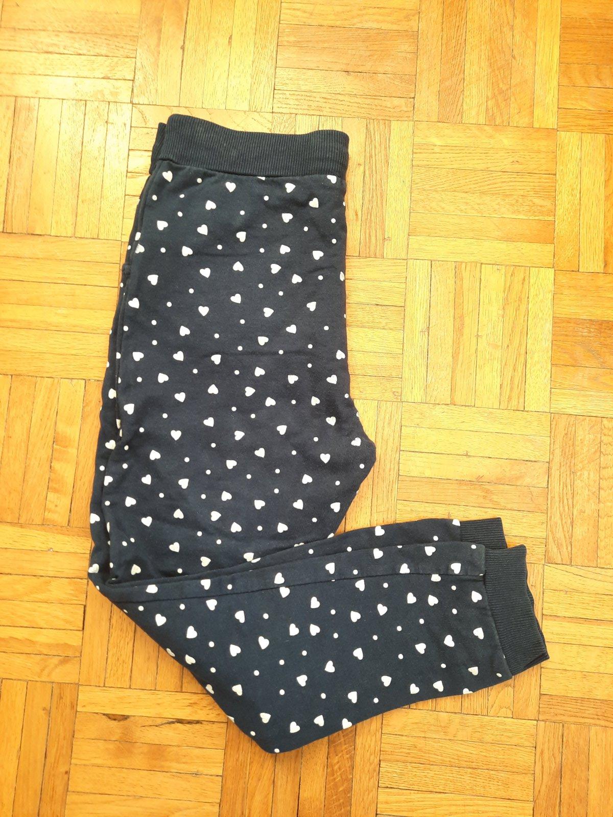Pekné tmavomodré tepláky s bielymi srdiečkami. Dole sára na manžetu, pás na gumu. Vpredu sú vačky. Pekný stav.