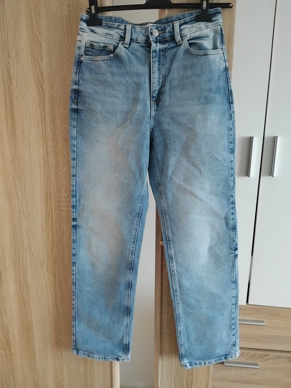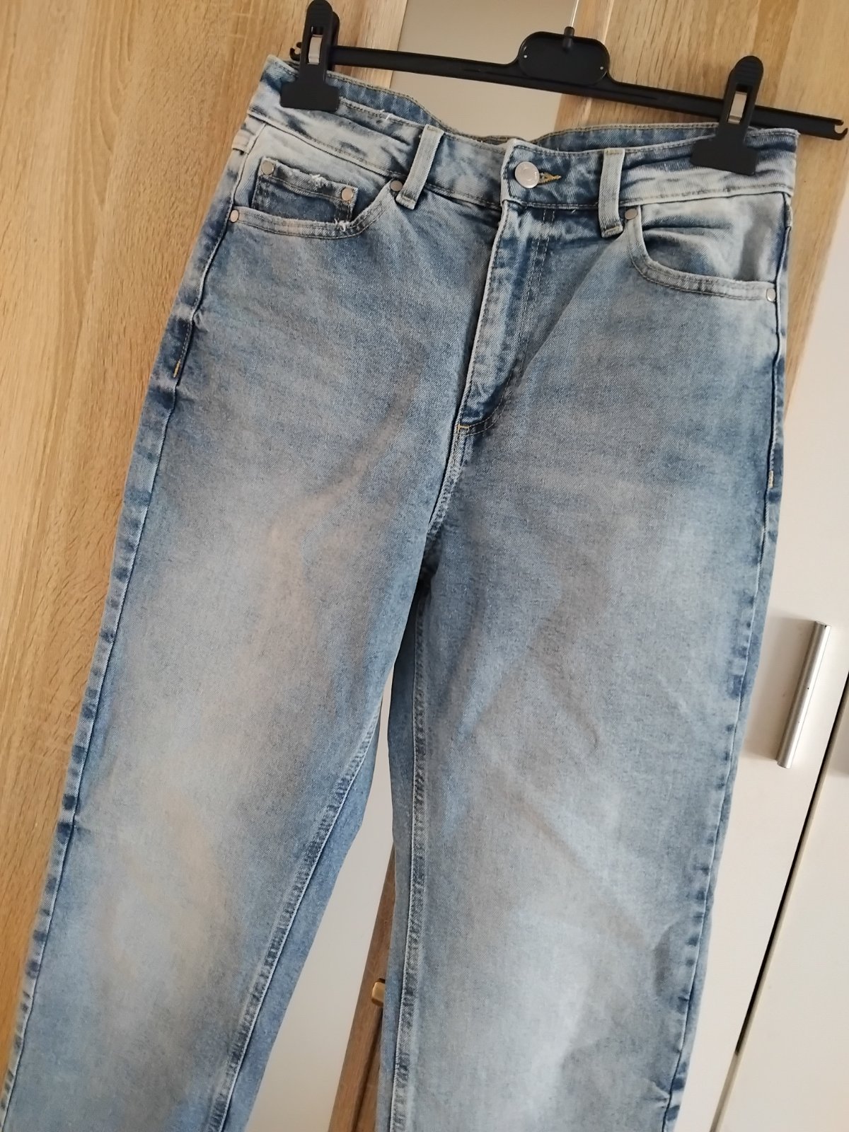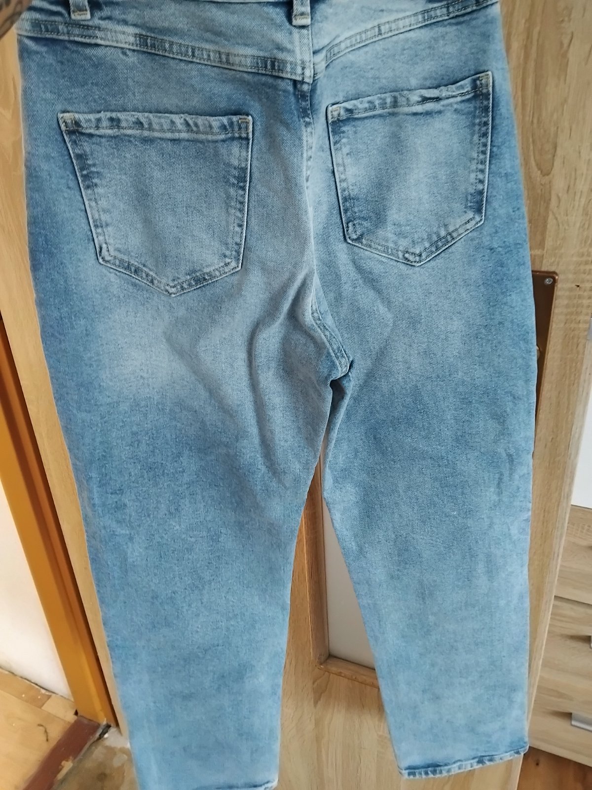 Predám džínsy s vysokým pásom. Nosené, bez poškodení, rozstrapkanie na vreckách a spodku nohavíc je robené naschvál a bolo tam už pri kúpe. Majú kratšiu dĺžku a preto sú super na leto/prechodné obd...