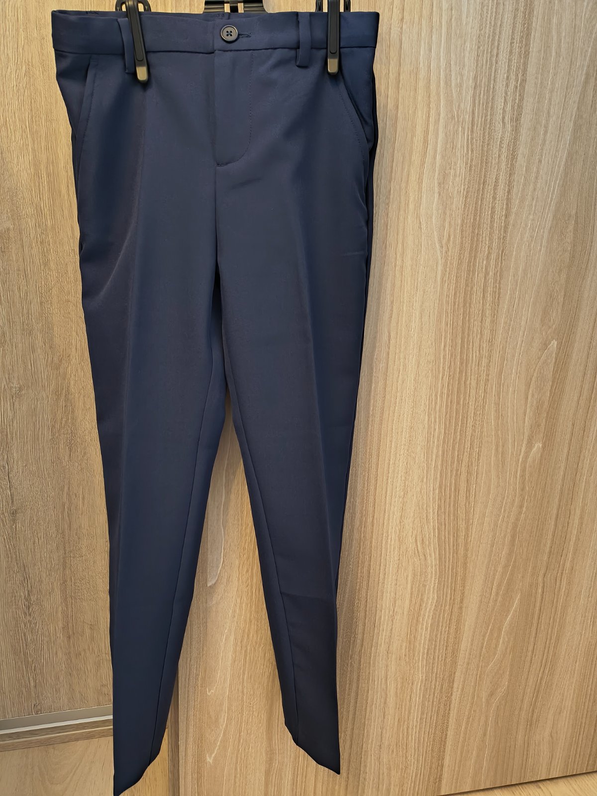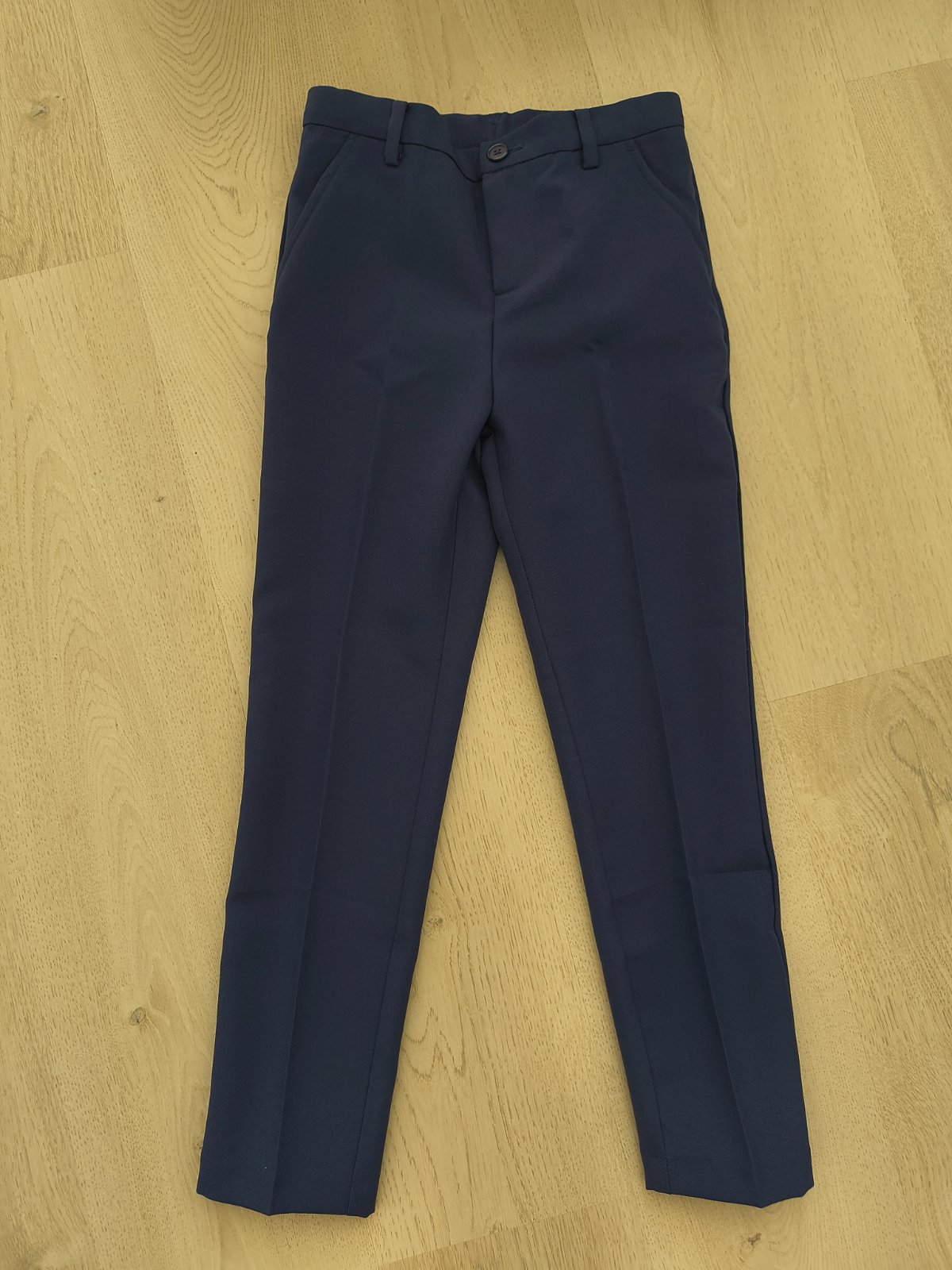 Predame 1x oblecene tmavomodre elegantne nohavice s pukmi H&M, slim fit, na slavnostnejsiu prilezitost, v stave ako nove, len bez visacky. Maju nastavitelny pas, gumicky nevytahane, vsetko v top stave, bez akychkolvek poskodeni, straty farby a pod. Sedia na vysku 134-140, ako je pisane aj na visacke, co je zvacsa vek 9-10rokov.