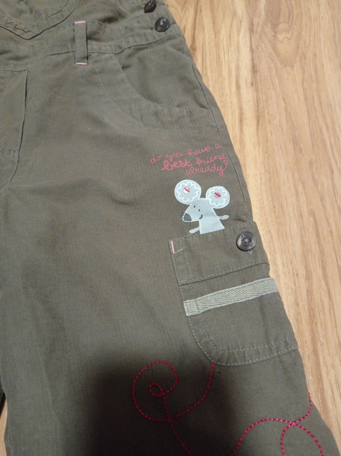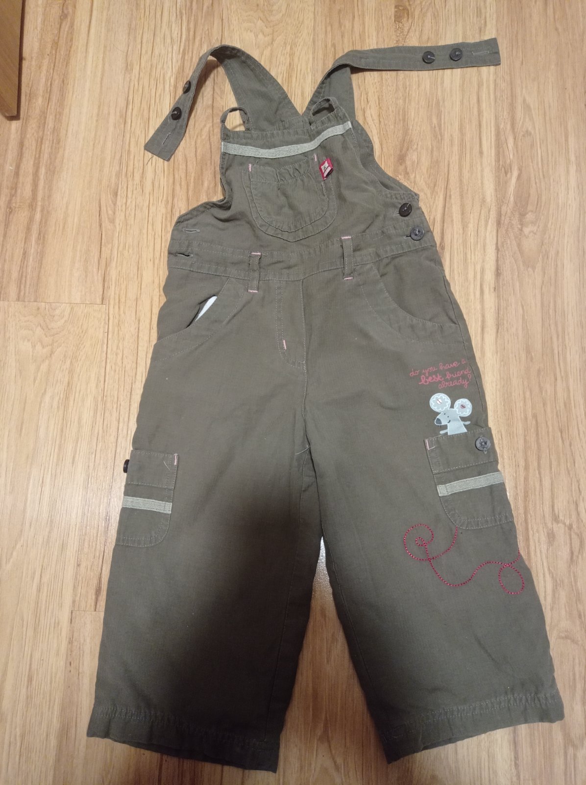 Nohavice podsite bavlnou. Velmi dobry noseny stav. Dlzka:58 bez trakov. Traky 2 velkosti nastavenia. Pas:27 cm.