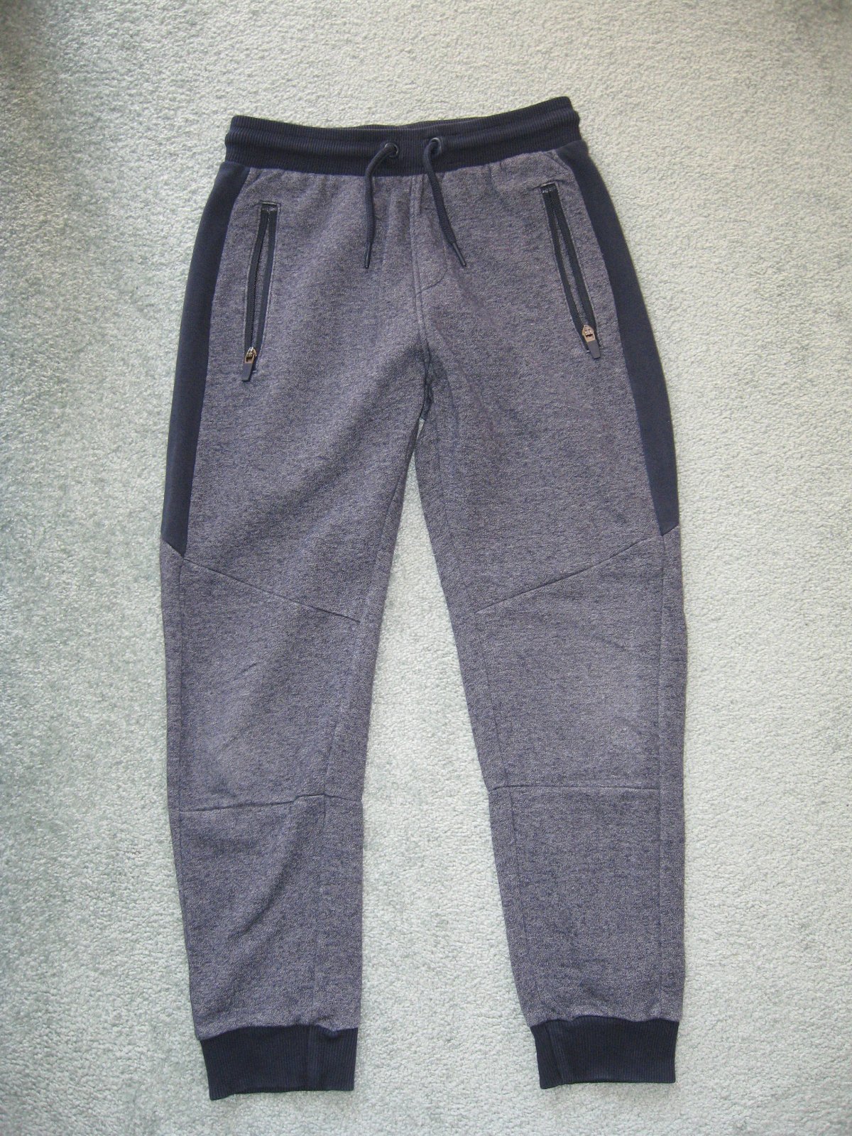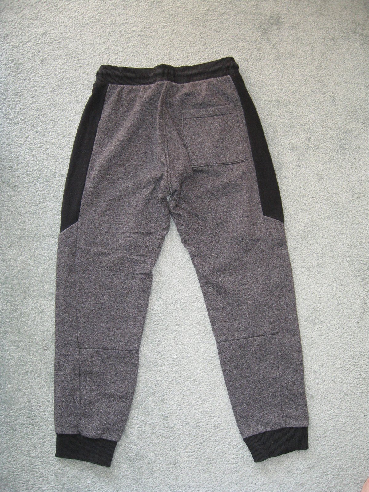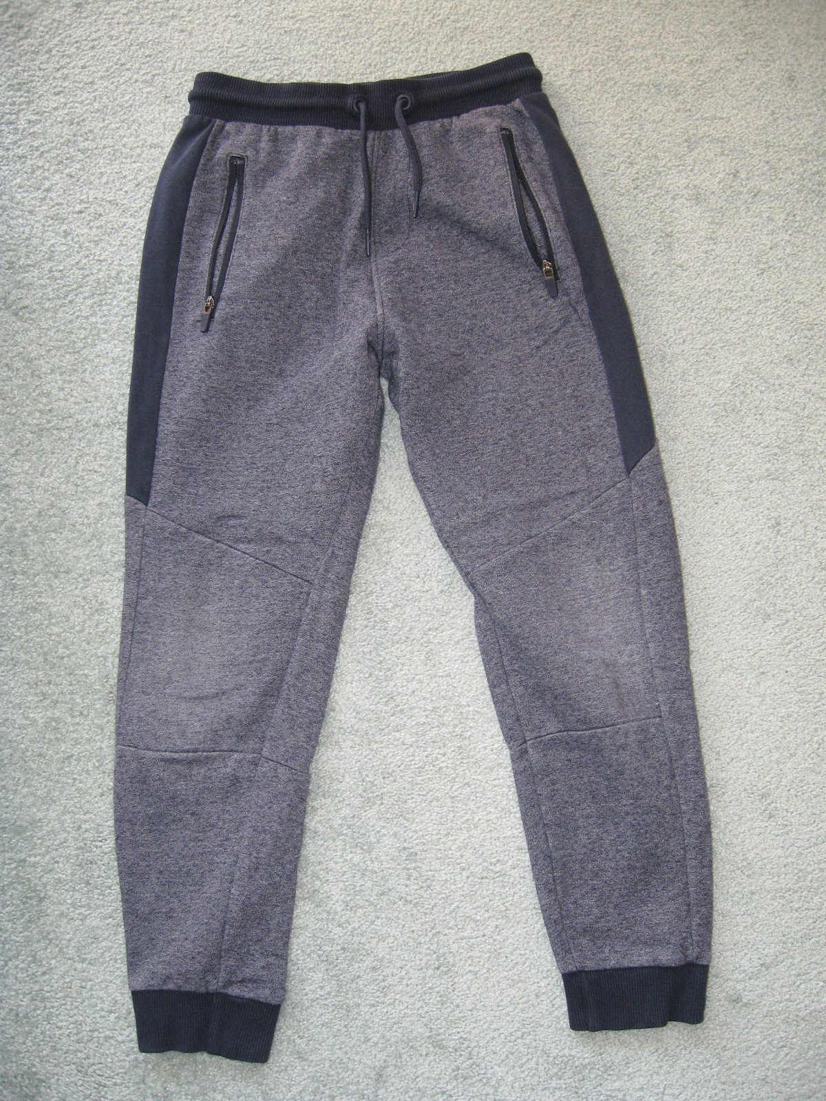 tepláky sú v dobrom nosenom stave po jednom dietati, na kolenách vidiet nosenie viac, ale nie sú prederavené, sú len na kolenách mierne oslabené..na niektorých miestach sú minižmolky.. veľkosť je 140-146, rozmery sú dĺžka 85cm, v páse majú 32cmx2, natiahnu sa do 34cm, v páse je tiež guma a dajú sa stiahnut šnúrkou, cena je 2eur za ks