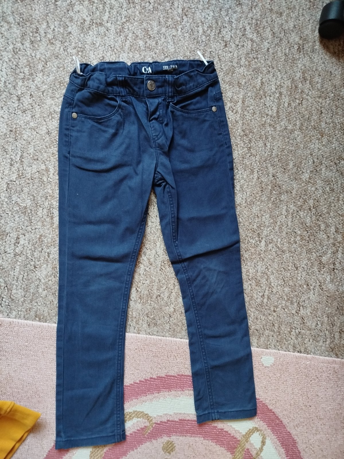 Hnedé 134ky skrátene u krajcirky na veľkosť 122, sú trosku teplejšie vid fotku - jeseň - zima, rifle 128ky skrátene na 122ky. Obe bez flakov a poškodení s regulovaciou gumičkou v pase. Dĺžka 67-6...