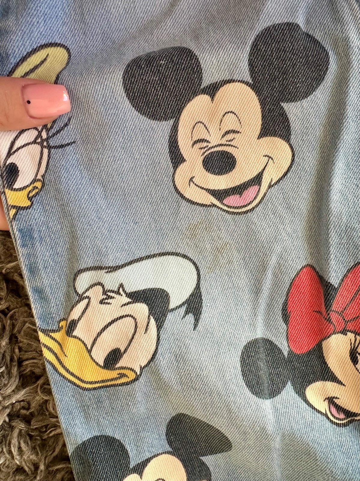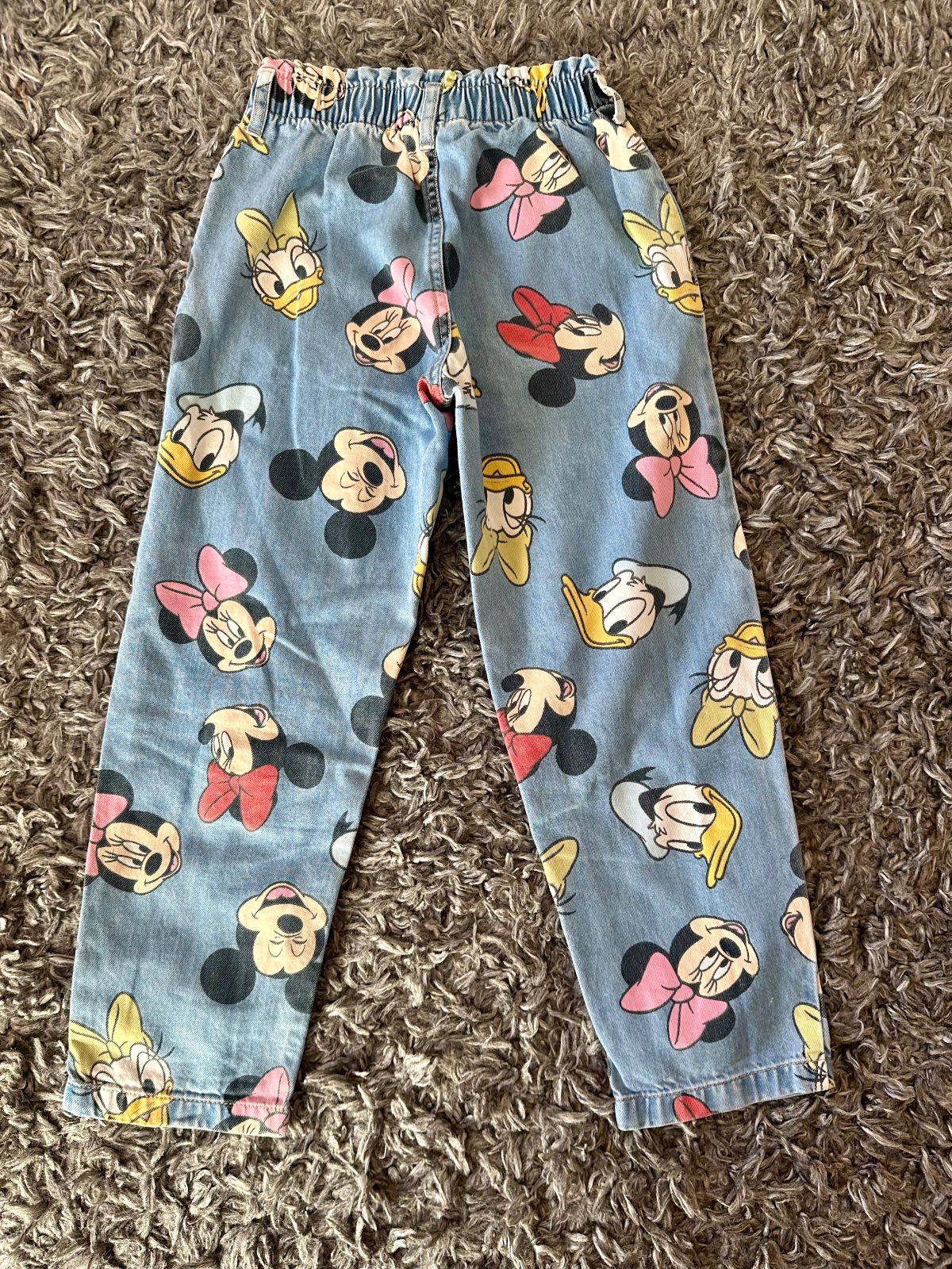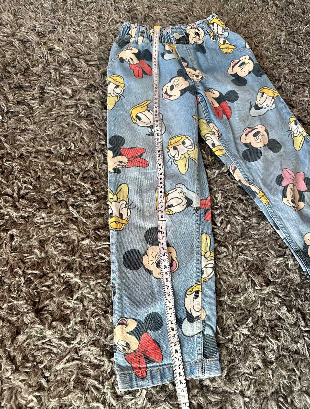 Široké mom jeans, naspodu málinko zrovnané. Velkost 128, úplne čisté. Majú gumu v páse, zips vpredu je len akože (bez zipsu). Bez vreciek vzadu. Mám k nim do páru mikinku 122/128 - píšte. Mini tienik na kolene - na fotke.
