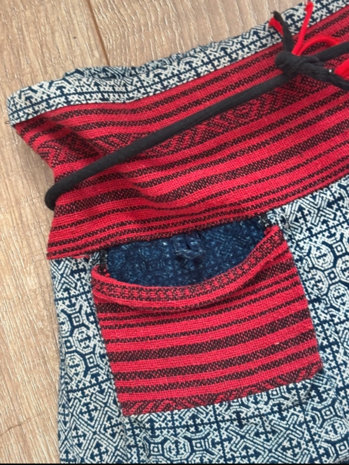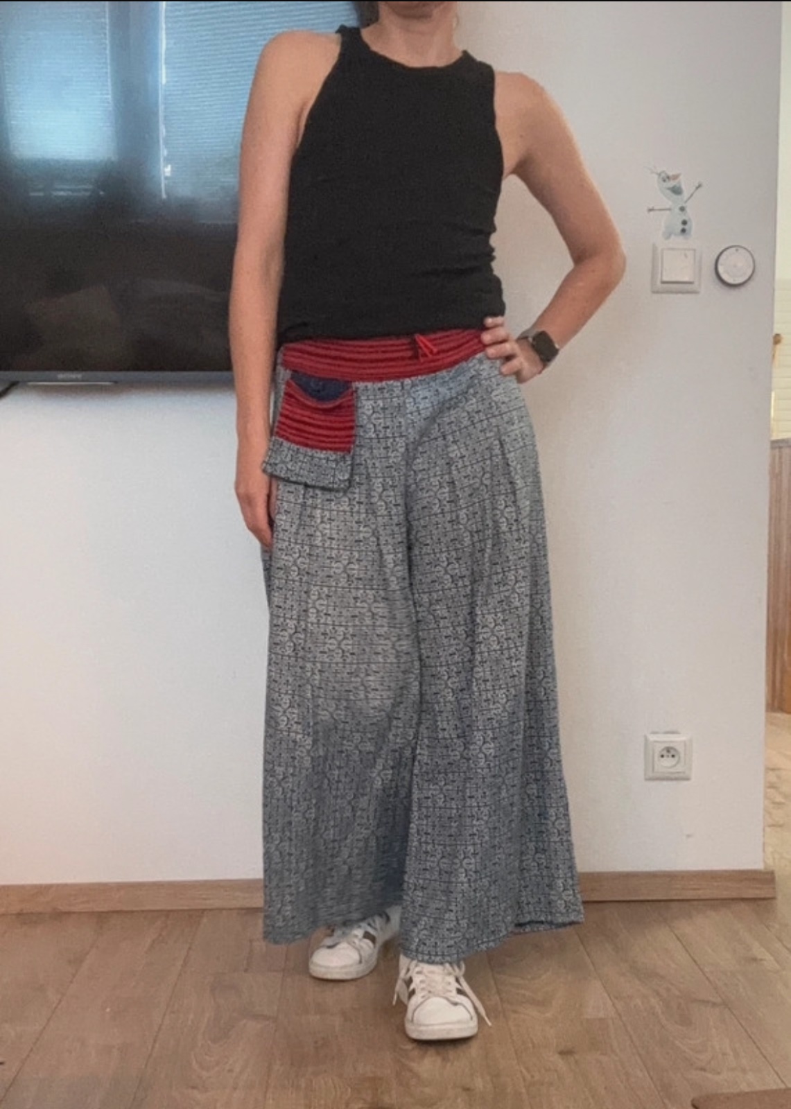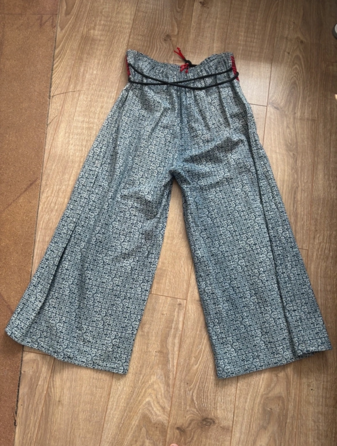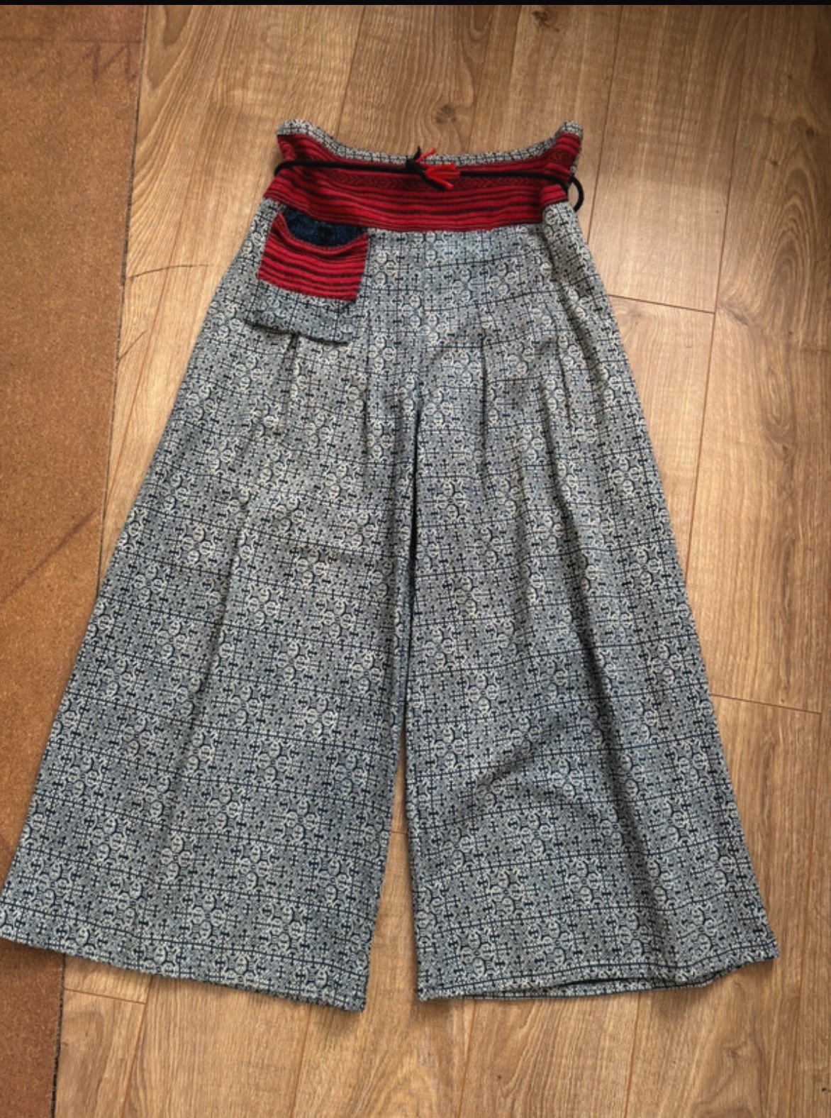 Siroke bavlnene nohavice, vzadu nazberkana guma, voredu ozdobny vysivamy pas, zavazovanie na snurku. Sedia na M, aj L. Kupovane v Thajsku. Vzor je akoby modrotlac. Je to pevnejsia, avsak vzdusna bavlna.