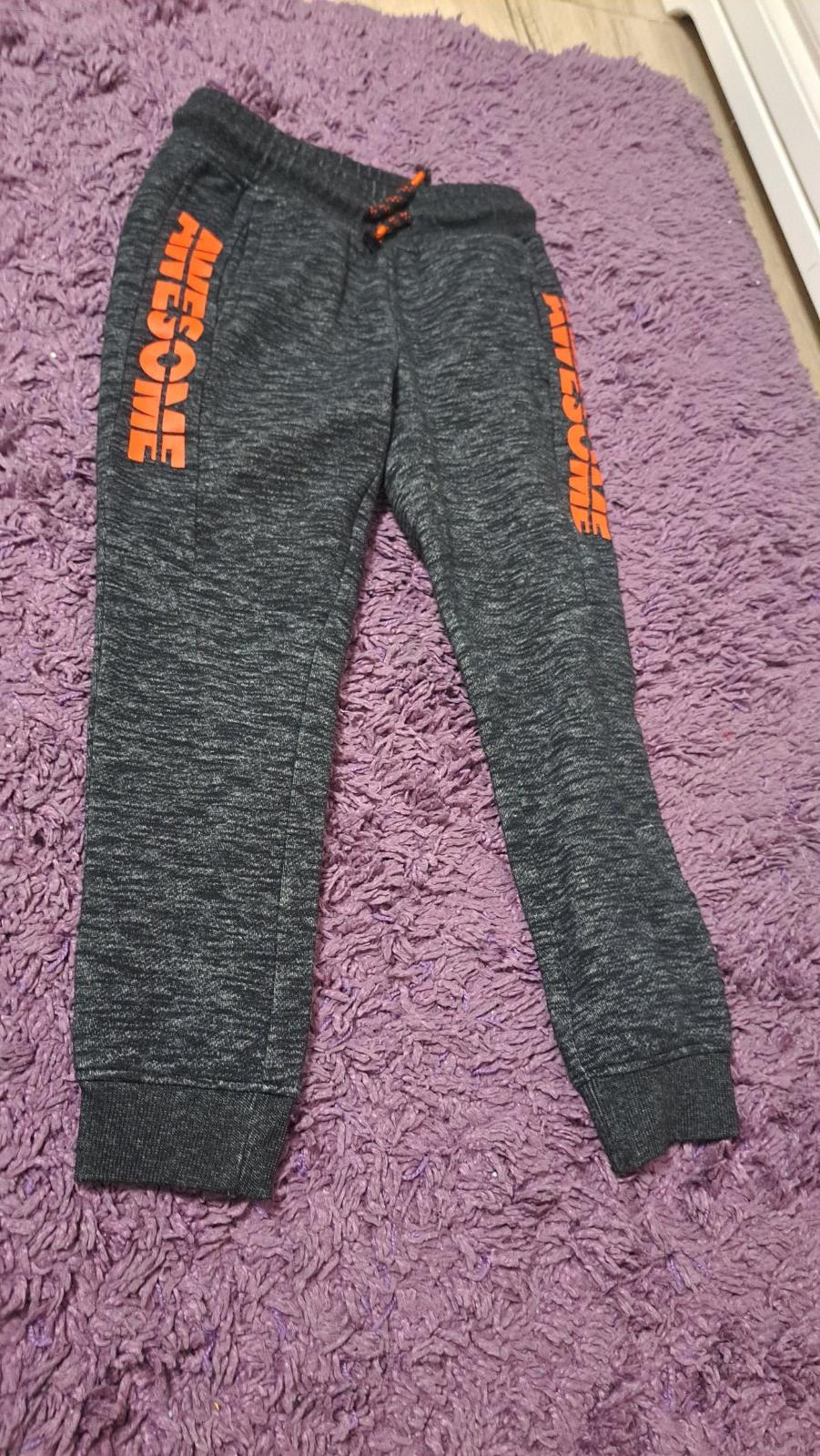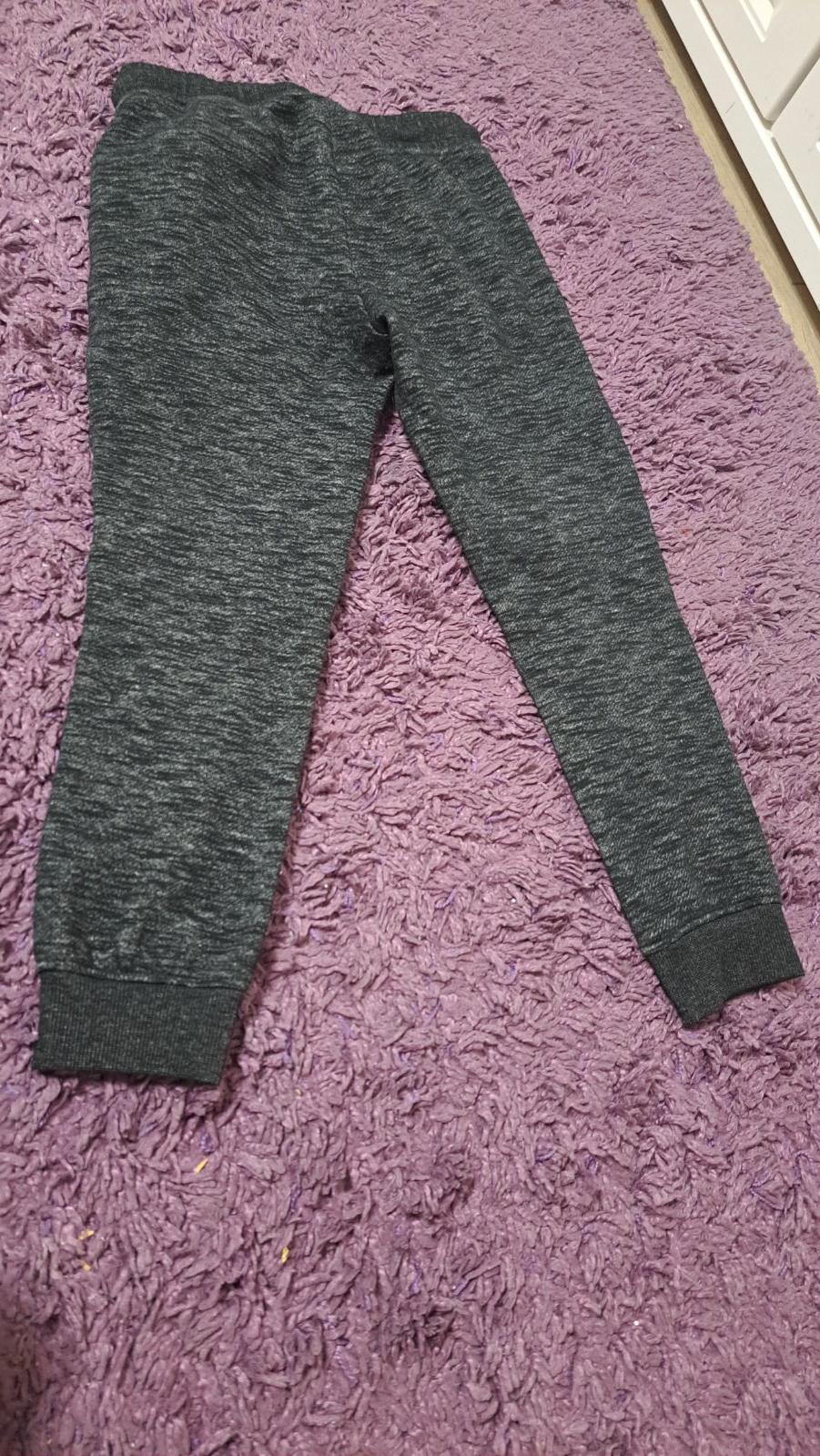 Zachovalé teplaky, so zmolkamy, no bez dier. V páse natiahnutá guma , lebo môj syn je chudučky, veľkosť je písaná 122/128, no nosil v čase veľkosti 128/134. Vnútorná dĺžka 56, vonkajšia 76cm.