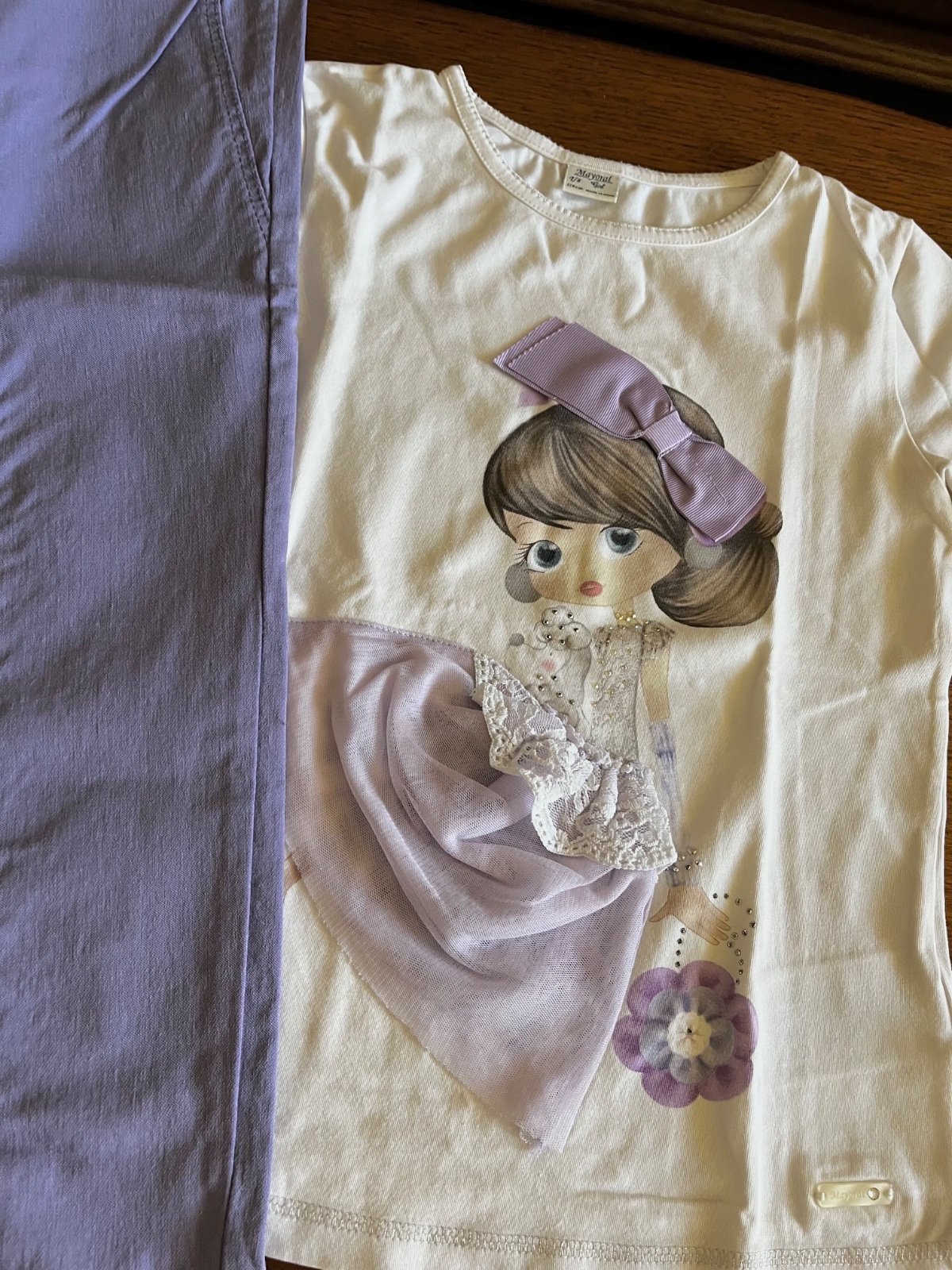Ku jegginsom máme na dokombinovanie tričko Mayoral v ladiacich farebných odtieňoch (viď posledné detail fotky).