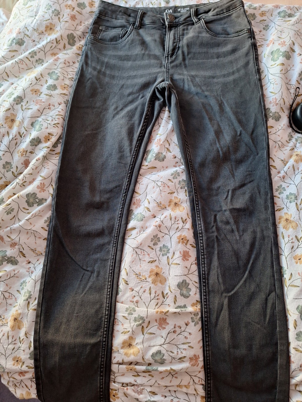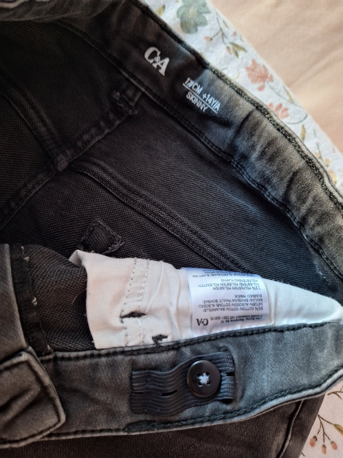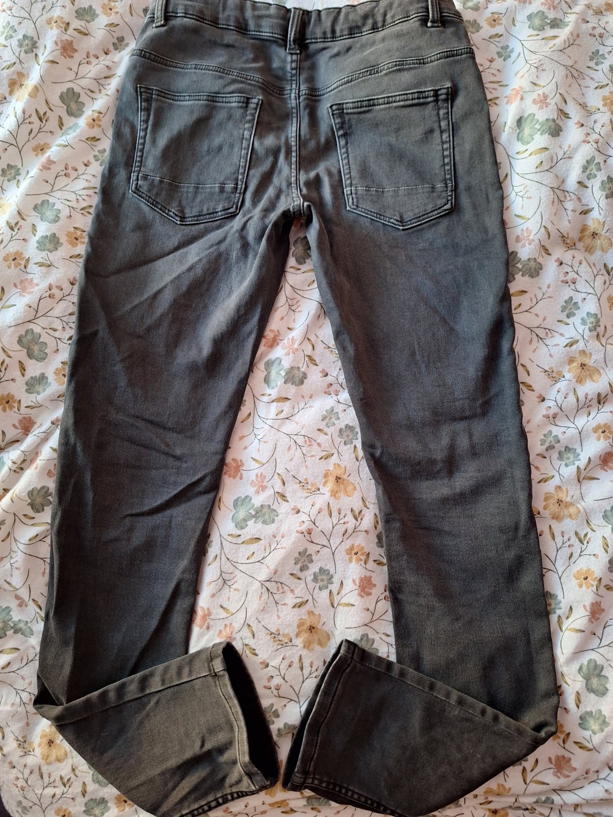 chlapčenské rifle,tmavošedé,nosené,bez poškodenia,cena 5,0€ + poštovné dlžka 102cm, dlžka od rozkroku 80cm, pás 38cm x 2 a je tam posuvná gumička