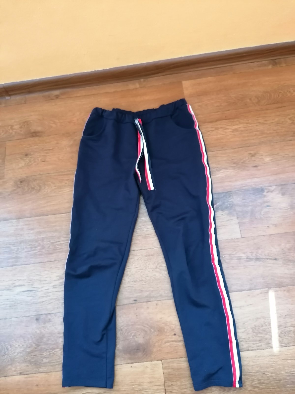 1xoblecene, su mi volne velkost 40, dlzka 104cm, sirka stehno pri rozkroku 29cm vnutorna d. 79cm vyzera skoro ako riflovina, nie su tenke na leto, elagantno sportovy styl