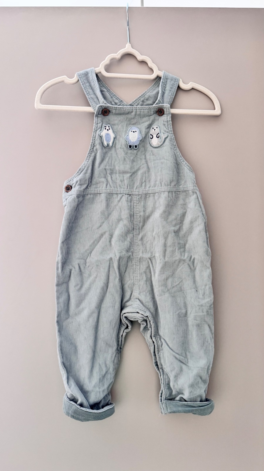 nohavice na traky s 2 možnosťami zapínania, rastúce hore sú vyšitý traja tučniačikovia, dajú sa podhnúť, sú trošku hrubšie čiže ideálne jar / jeseň uvádzaná veľkosť 9 až 12 mesiacov ale vynosíte aj na dlhšie farba je bledučko modrá. využili sme málinko.