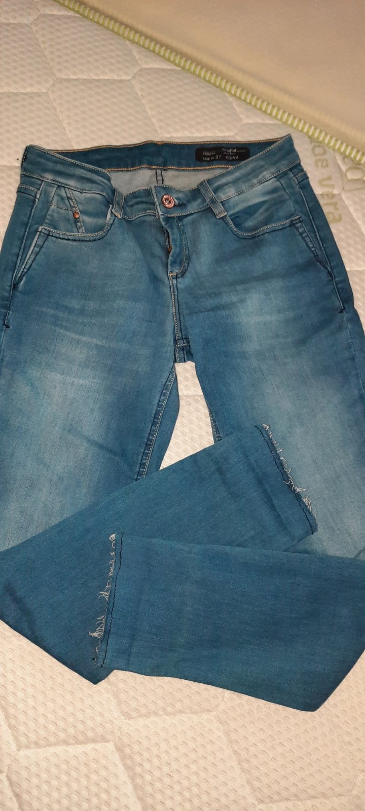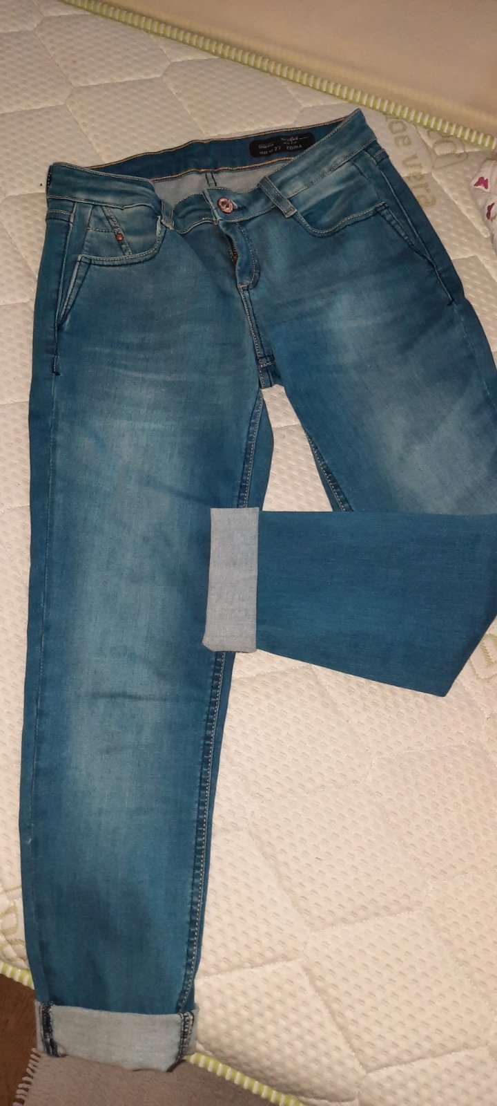 Pekné rifle málo nosené, bez poškodení, len nohavica na spodku sa od nova trochu točí...ináč sú super. Farba ako na hlavnej fotke.