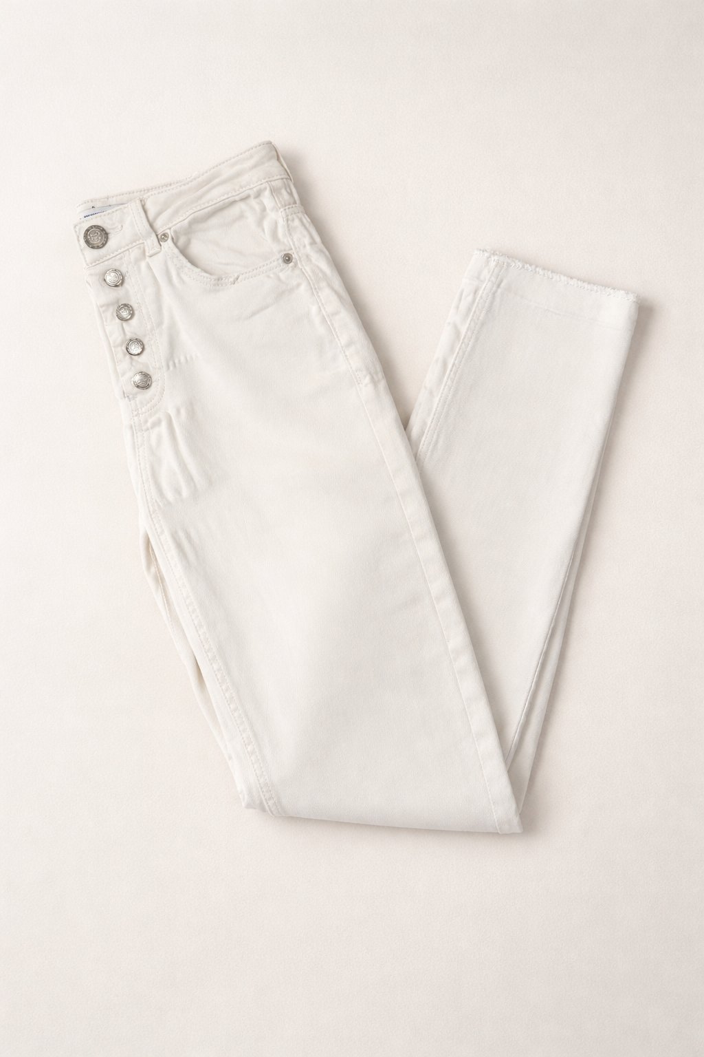 Biele rifľové nohavice v minimalistickom strihu, ideálne na bežné nosenie aj elegantnejšie kombinácie. Majú vysoký pás a zapínanie na gombíky, ktoré pekne zvýrazní siluetu. Materiál je príjemný, pevný a pohodlný na nosenie.