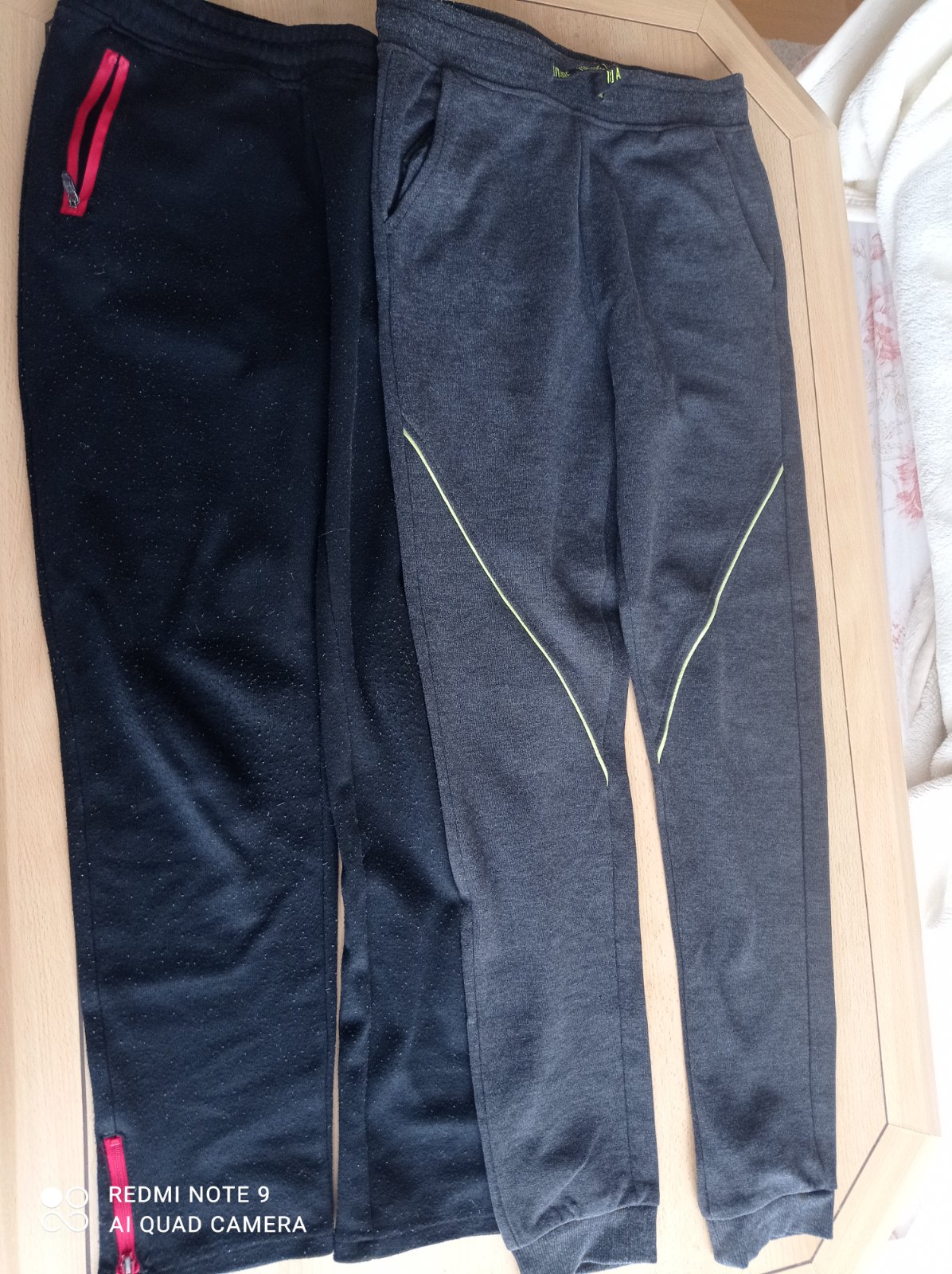 Tmavo sivé tepláky, nosené ale určite ešte poslúžia, dierka medzi nohami v sve, čiže nie je problém zašiť a hotovo, veľkosť 146/152, dole pánty, hore už šnúrka nie je v pase