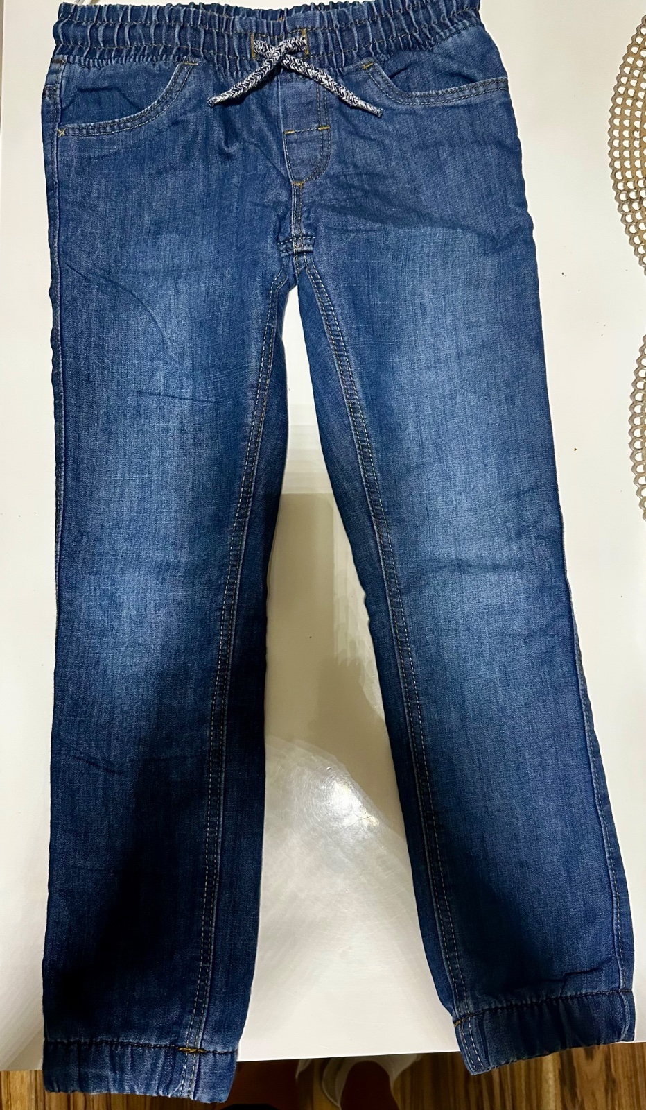 Pekný noseny stav bez poškodenia, dajú sa vyhnúť a ponosit dlhšie, dĺžka 82 povoliť sa dá ešte o 5cm, pás na posuvnu gumu max31x2 a dá sa zmenšovať..
