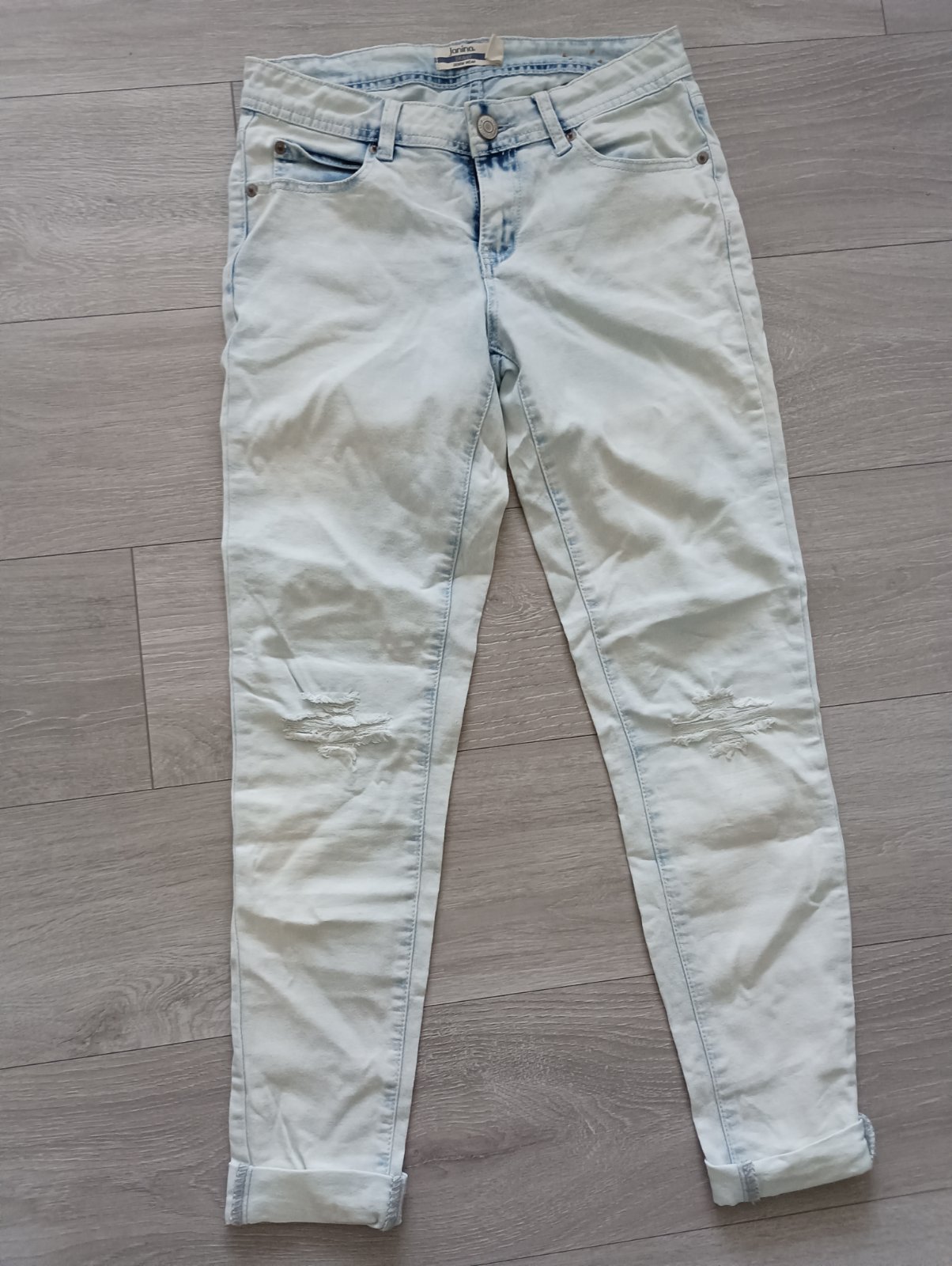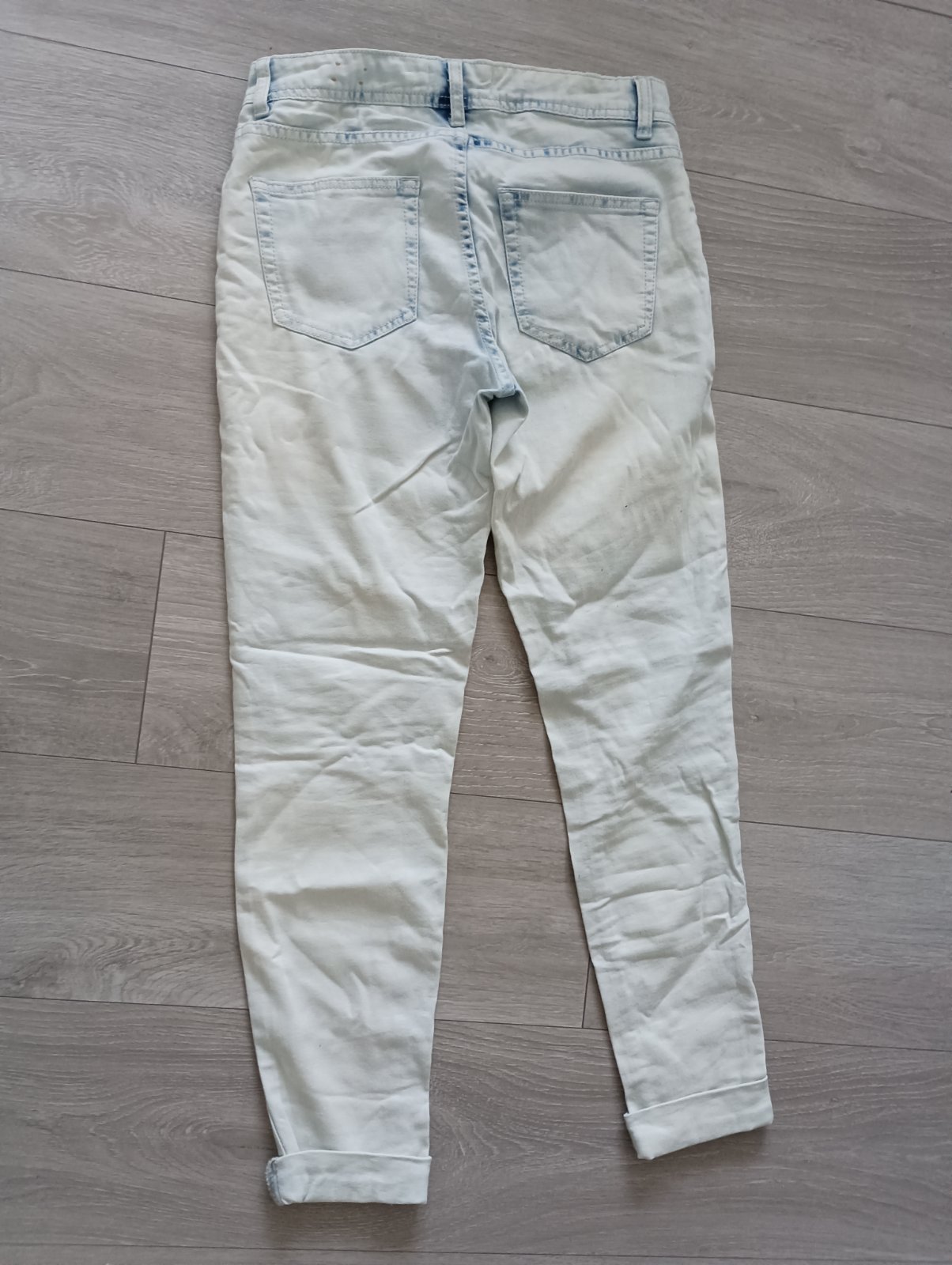 Bledomodré rifle rovného strihu. - nepoškodené, 2x oblečené. Veľkosť: je značená 40/L, ale sedí skôr na 38/M. ✂️ROZMERY📐berte ich prosím cca 1/2cm +/- 🖤 Pás - cca 38cm (odfotené) Dĺžka - cca 10...