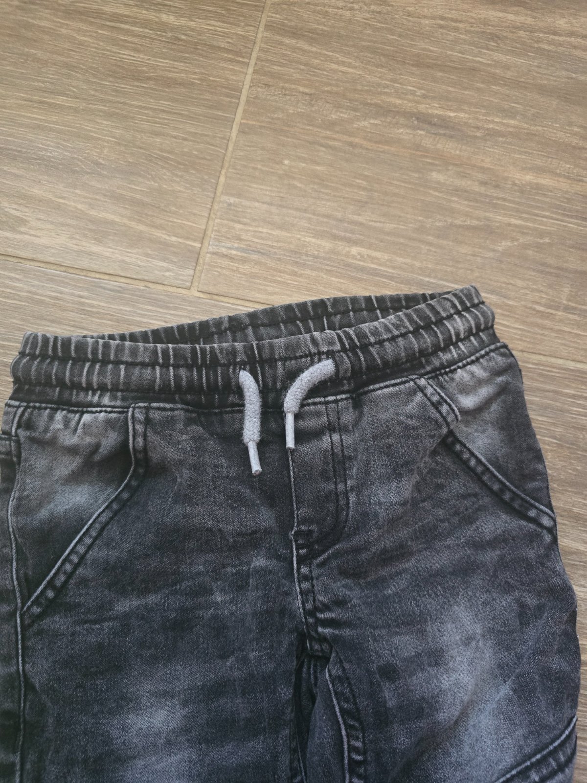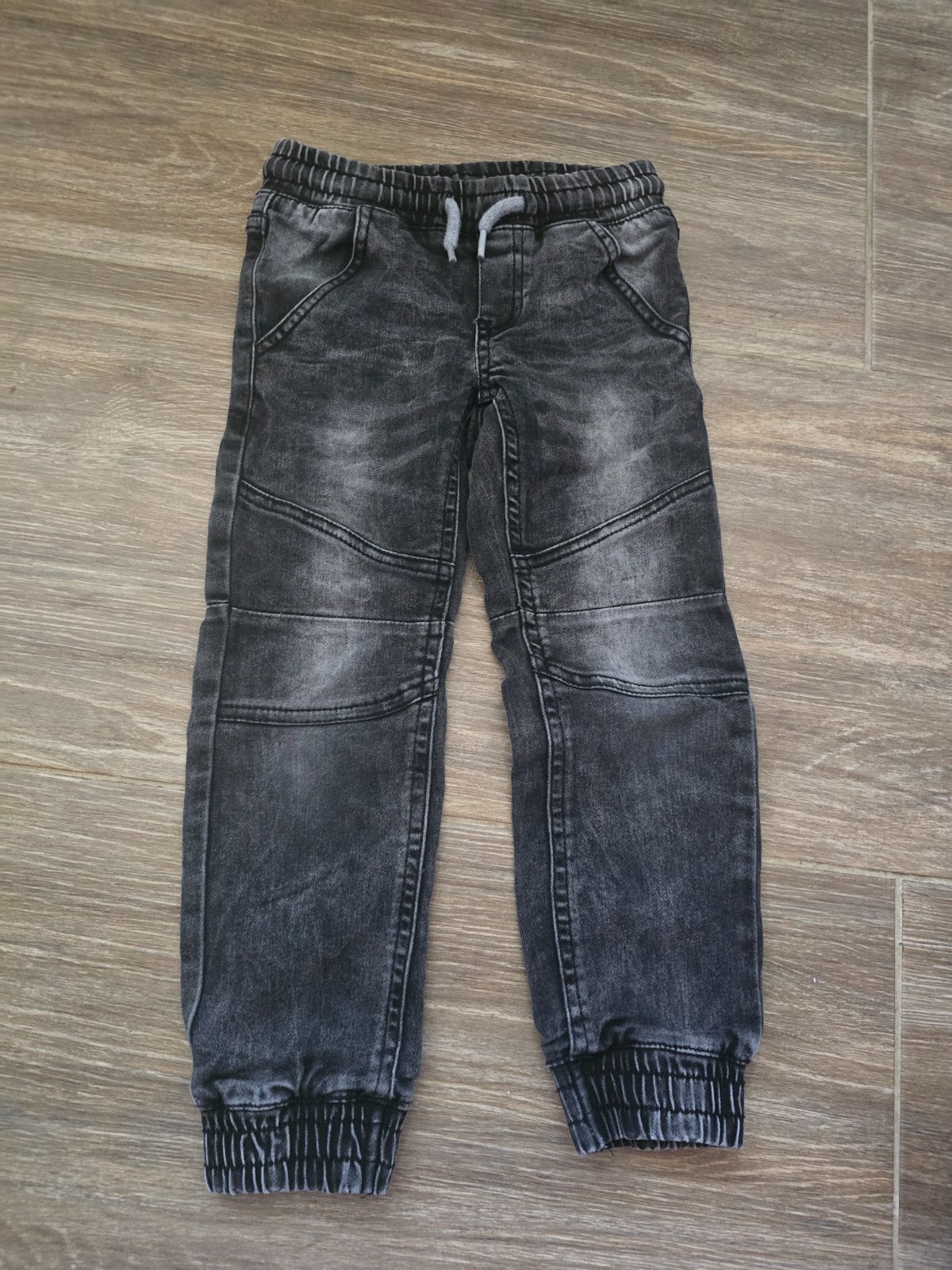 chalanské rifle tmavej modrej farby, jednoduchý strih, falošný zášev na zips a gombík, pás na regulovateľnú gumičku, po bokoch aj vzadu vrecká materiál: bavlna veľkosť: 3 - 4 roky rozmery: od pásu ...
