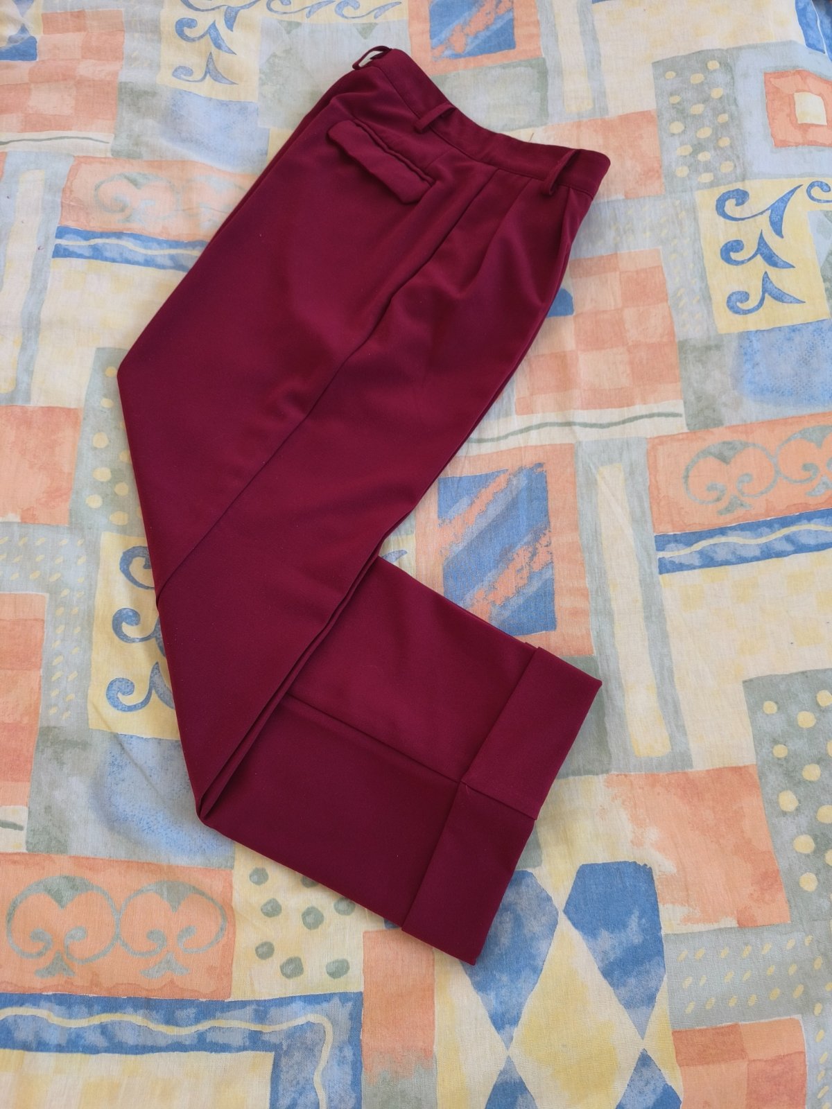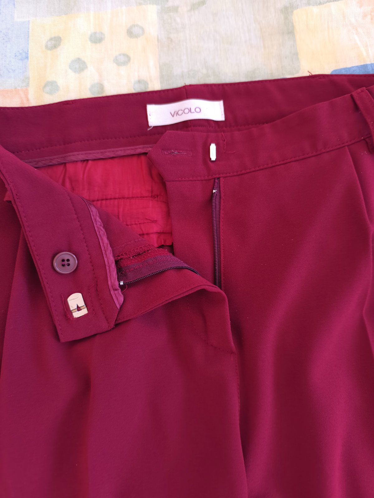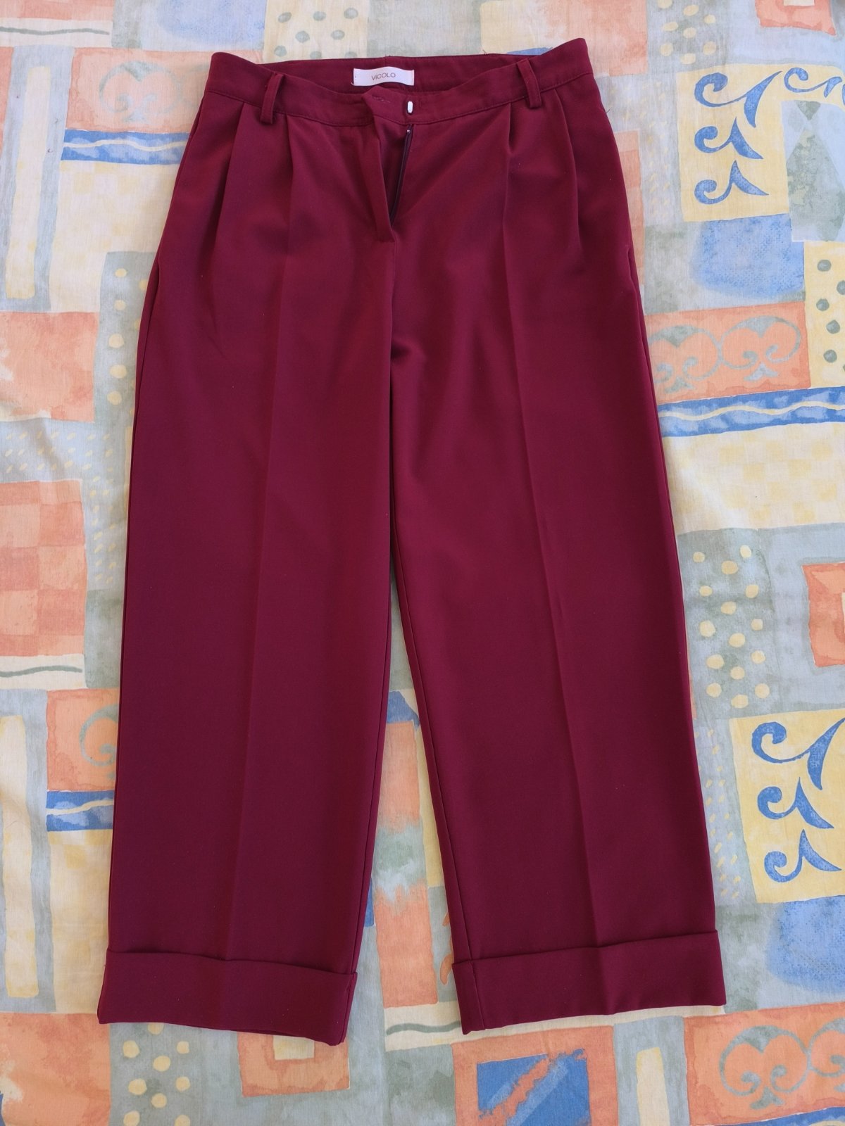 Široke nohavice voľného strihu so zažehlenými pukmi z hladkej látky, s vačkami. Sýta bordová farba.
