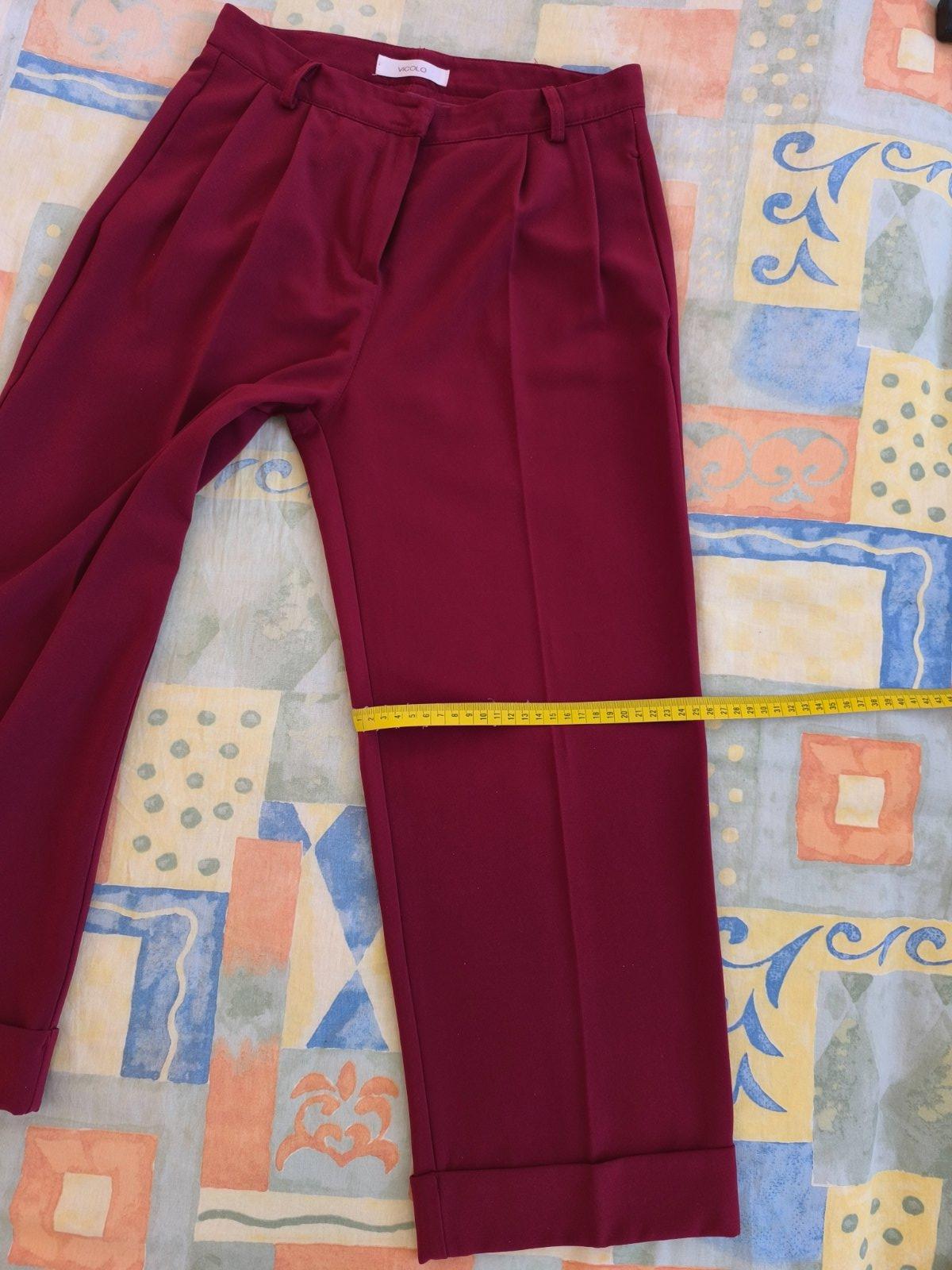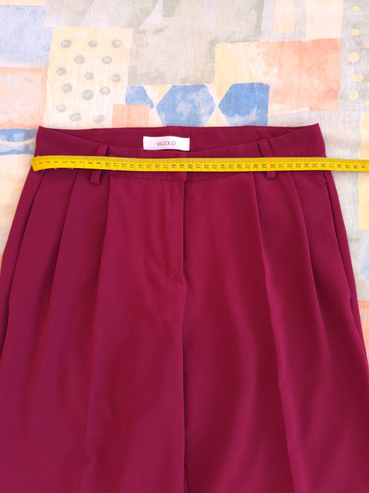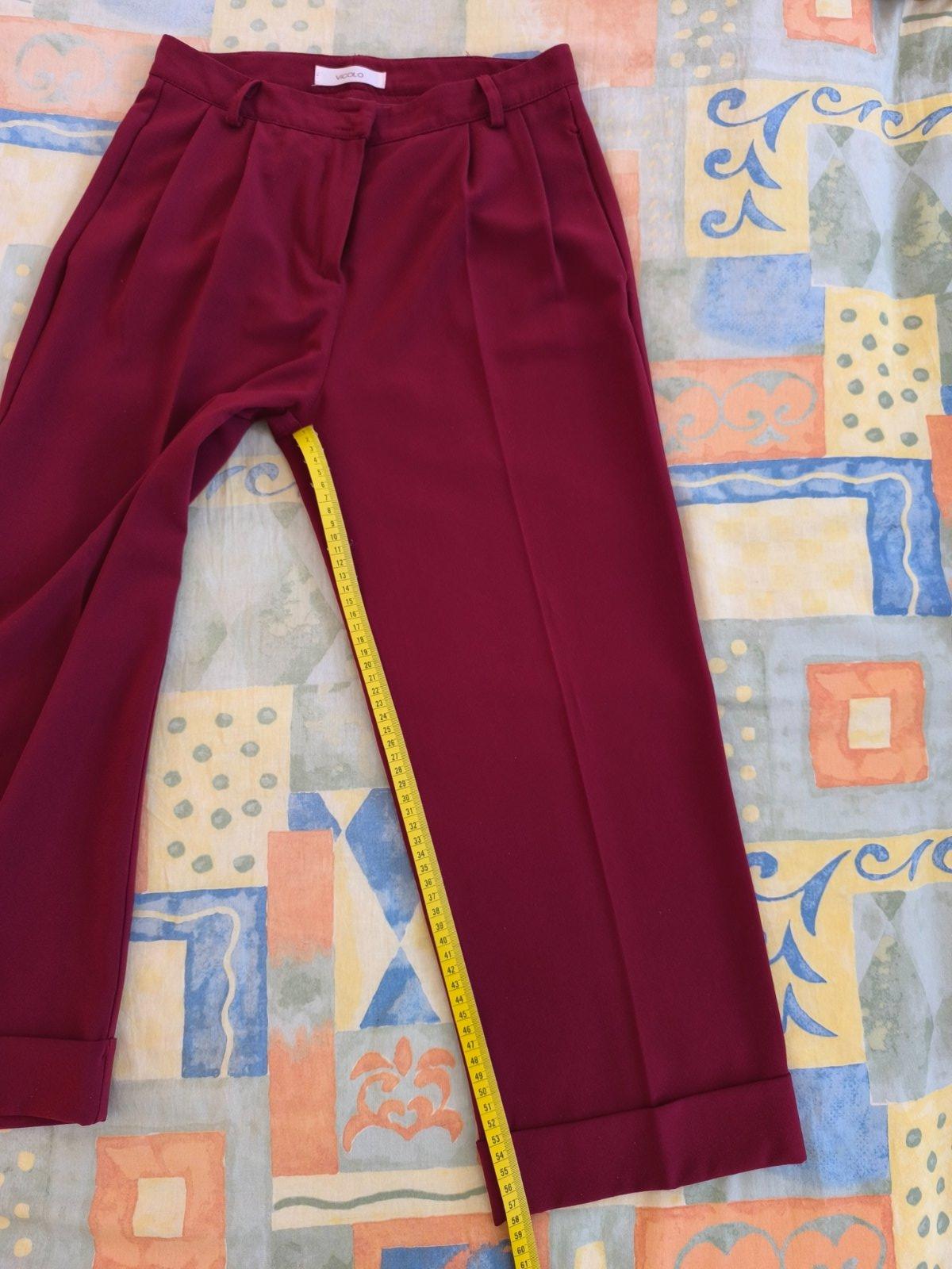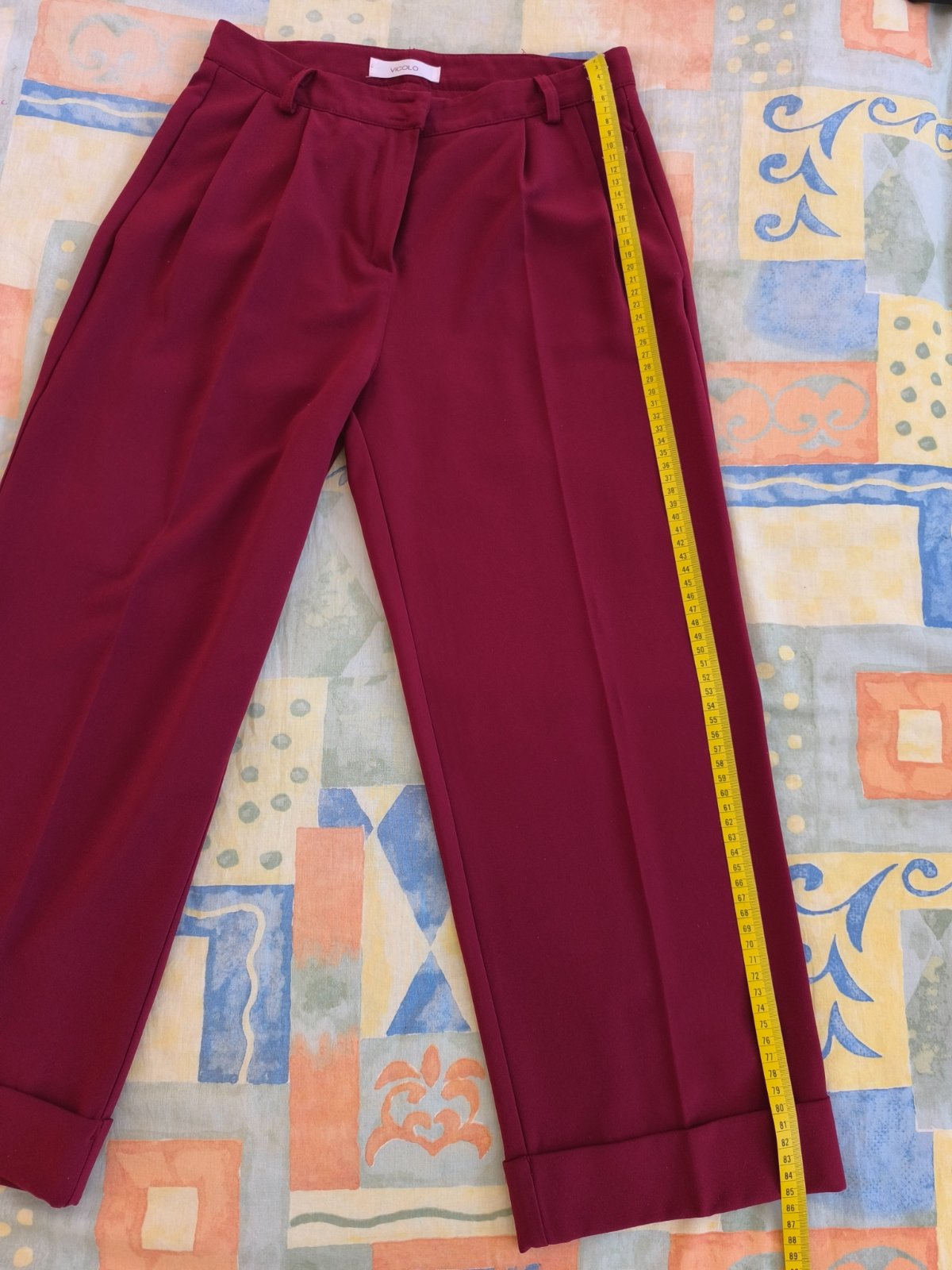 Široke nohavice voľného strihu so zažehlenými pukmi z hladkej látky, s vačkami. Sýta bordová farba.