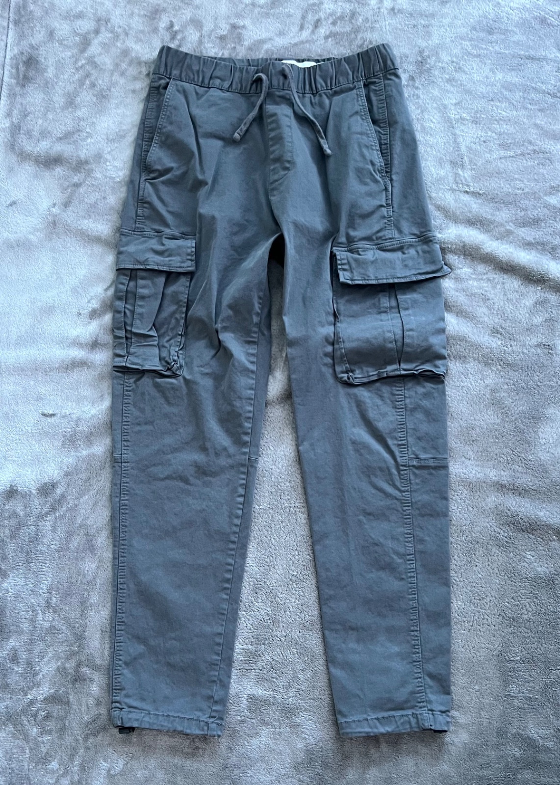V dobrom stave bez poškodenia. Vačky vpredu na zips, na bokoch, vzadu. V páse na gumičku a šnúrku. Celková dĺžka 92 cm, dĺžka od rozkroku 62 cm, šírka v páse v klude 37 cm.