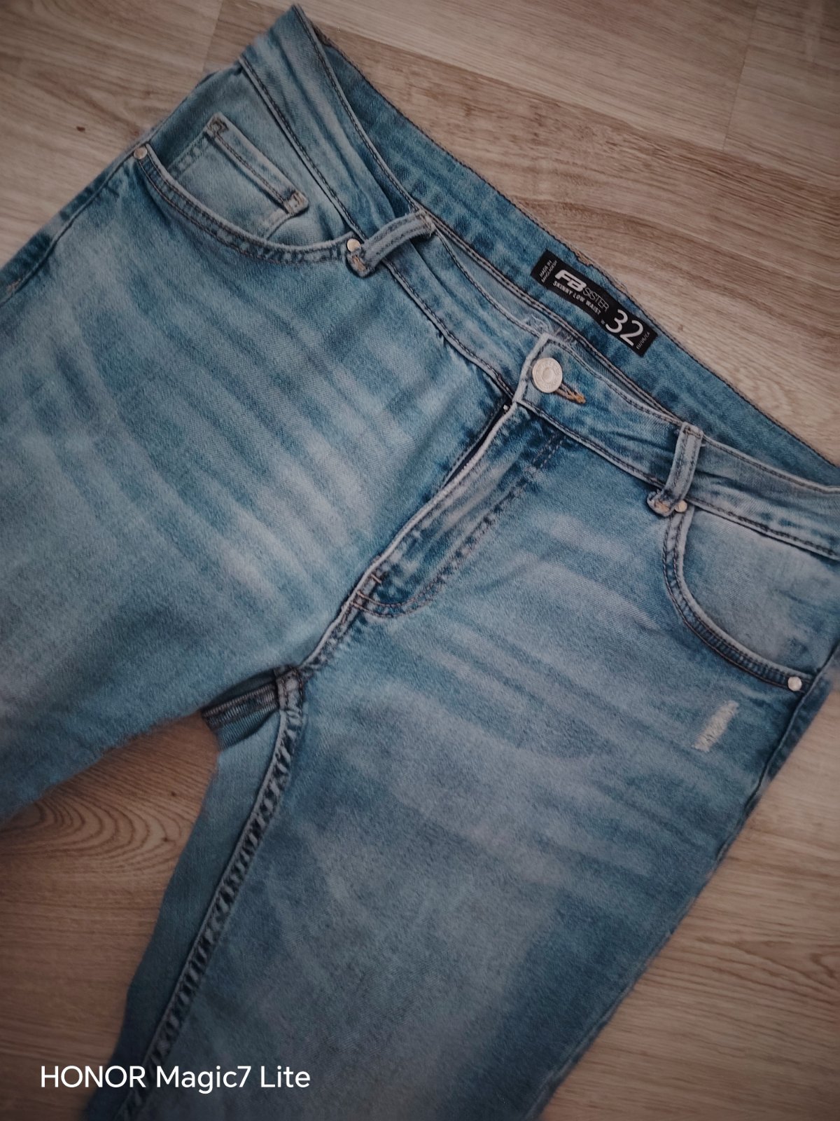 Bledomodré dámske rifle vo výbornom stave (bez akýchkoľvek poškodení; minimálne nosené). Rifle majú klasický rovný strih; 2 predné a 2 zadné vrecká; zapínanie na zips a na gombík. Značka: John Bane...