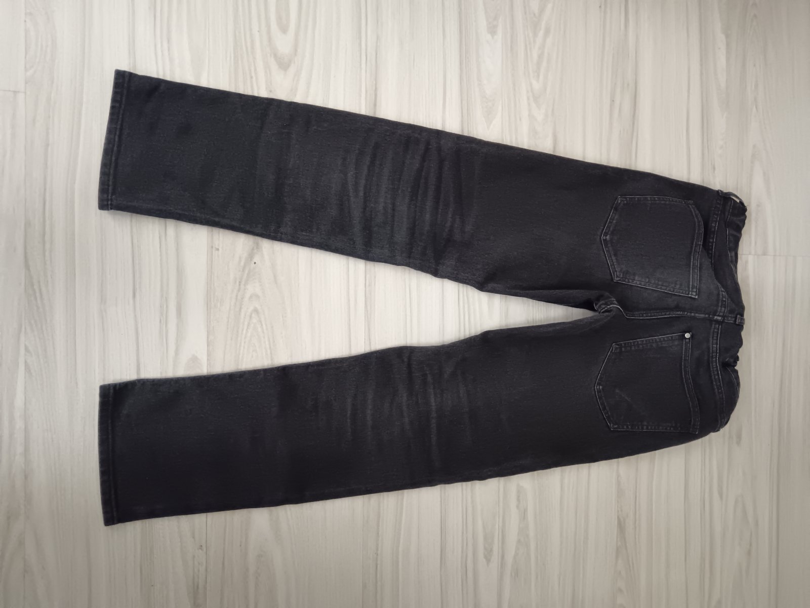 Čierne rifle dole rozšírené - flared, raz oblečené, 100% stav. Dĺžka 95 cm, šírka pás 34 cm, šírka na spodnom okraji nohavice 21 cm. V páse sú gumičky na nastavenie šírky.