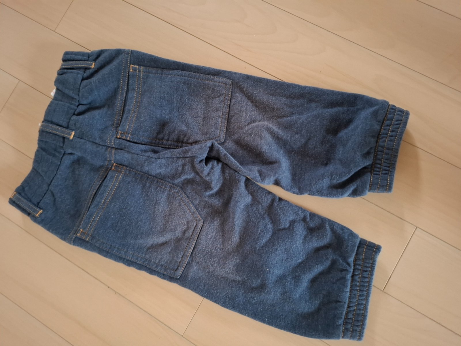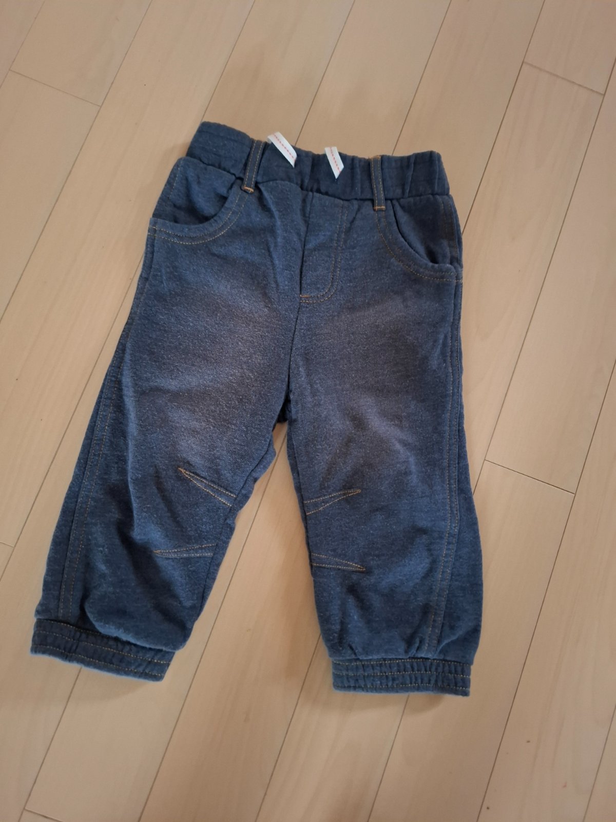 Určite ešte poslúžia pre menej náročnú maminku. 100% bavlna. Hranim sme prešúchali kolienka, no zaplata niečo ešte znesie. Okrem kolienok, nemaju iné poškodenia.