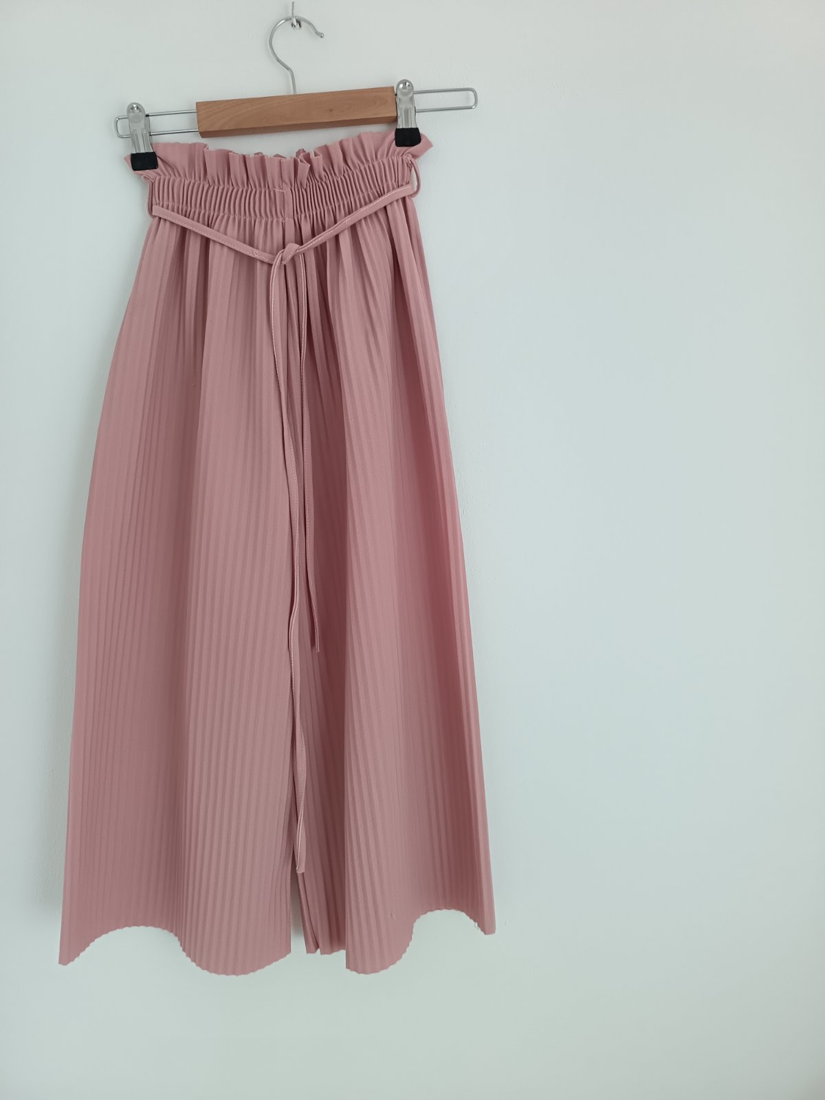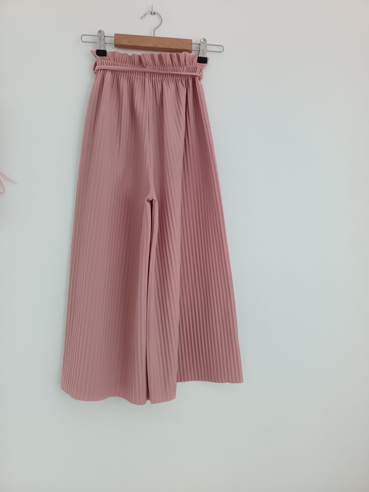 Plisovane bledoružové nohavice, z padavej látky, v páse na gumičku, nad gumičkou v páse sú volaniky, ktoré ich robia ešte krajšie, v páse putka a opasok z tej istej latky, ktory sa viaže na mašličku, bez poškodenia, vhodné aj na slávnostnú príležitosť.
