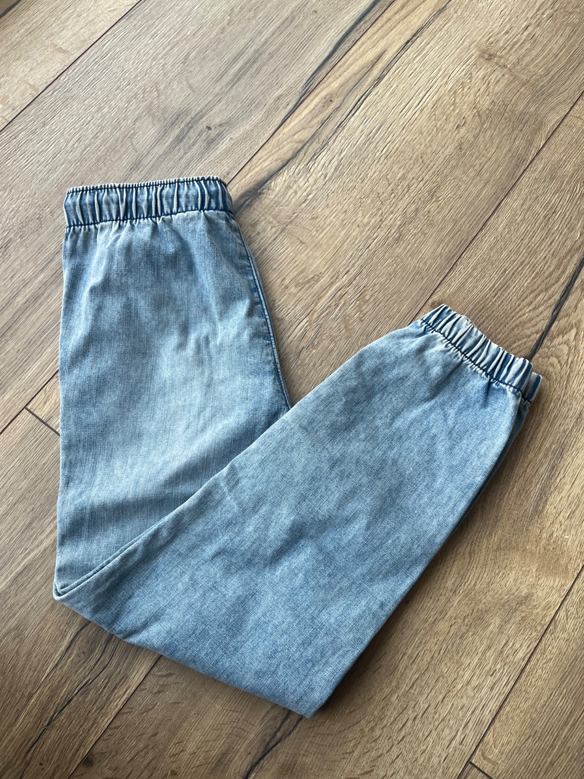 Predám perfektne džínsy z mäkkej rifloviny - velkost 140 - nosenie na striedačku len v škole v super stave - pas na gumu s šnúrku - dve bočné vrecka