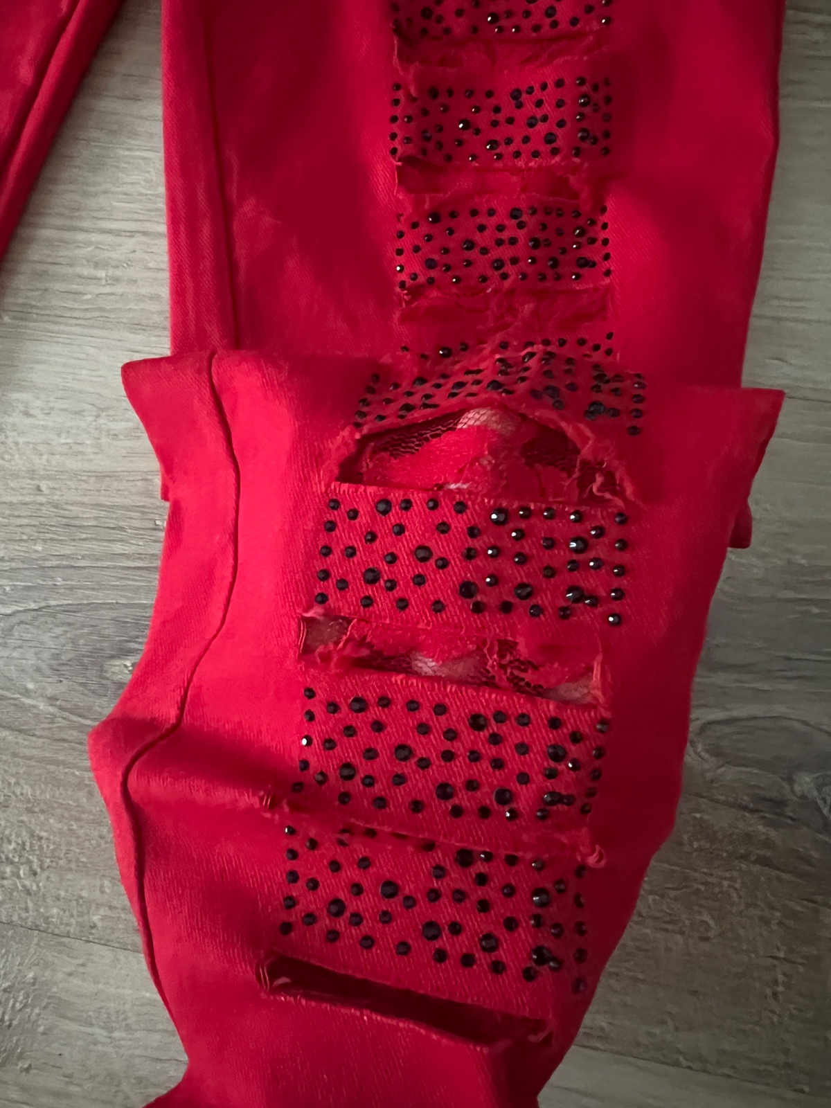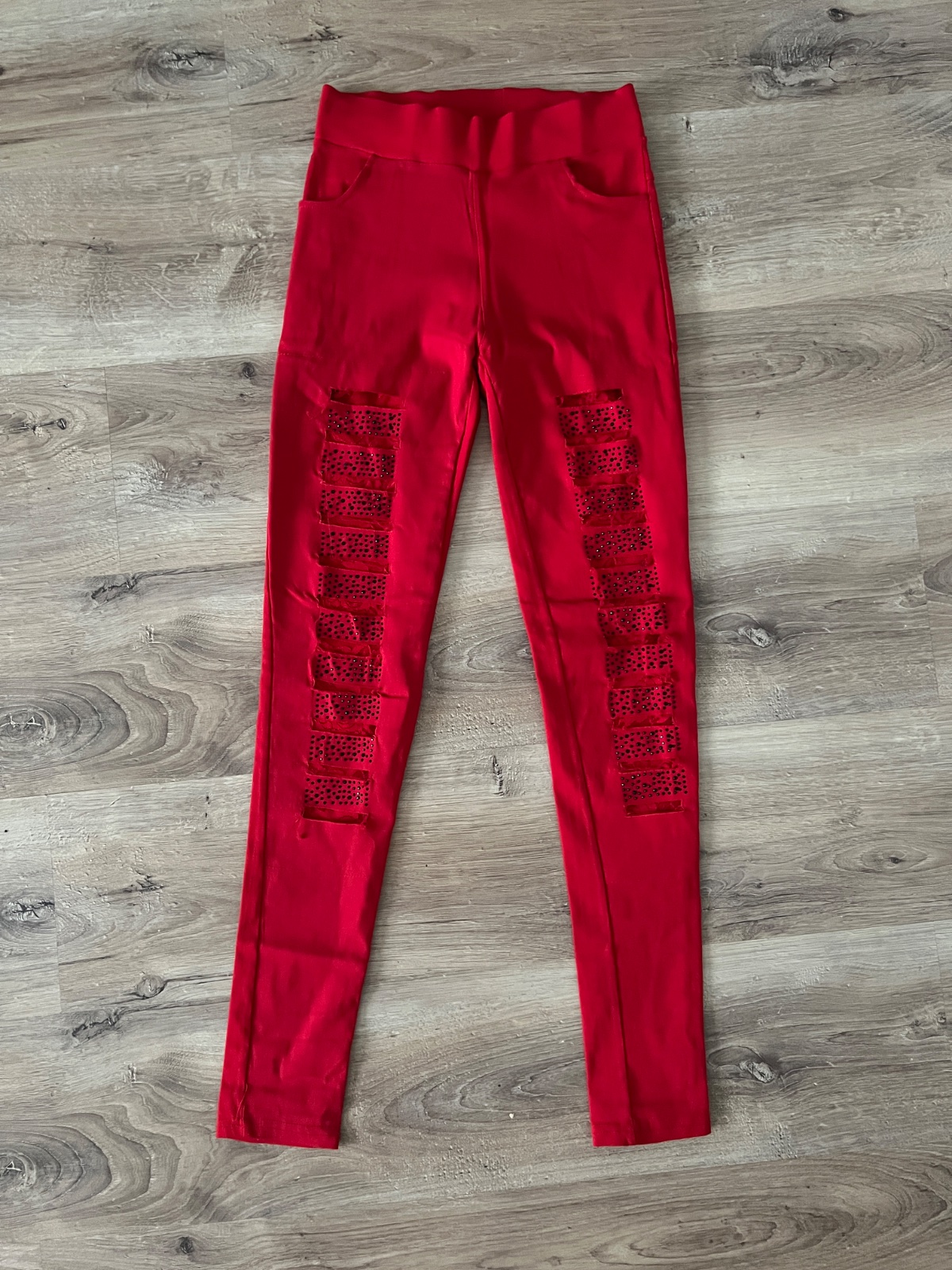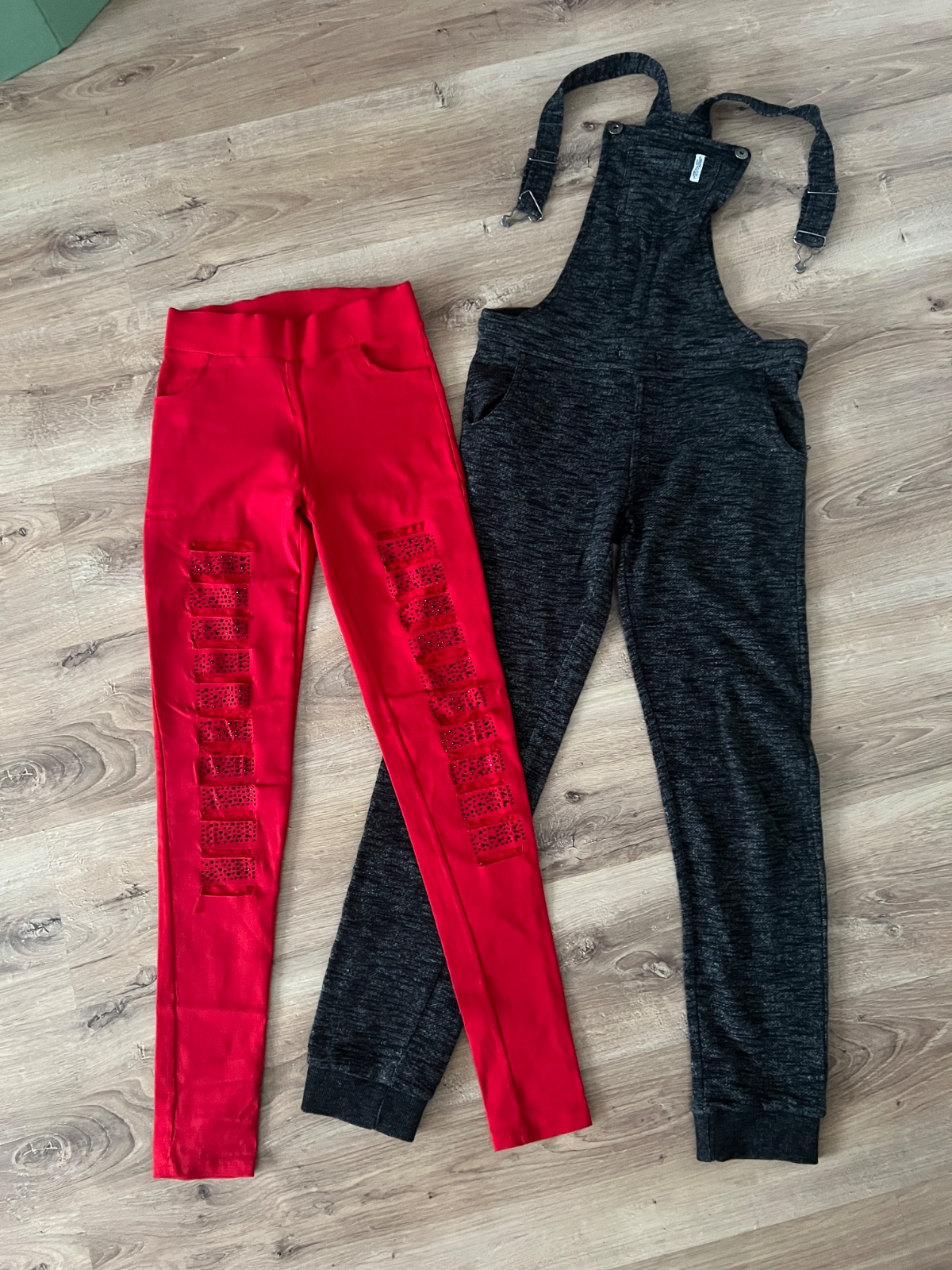 Červené nohavice s čipkou a tepláky na traky. Sadnú tak na XS.