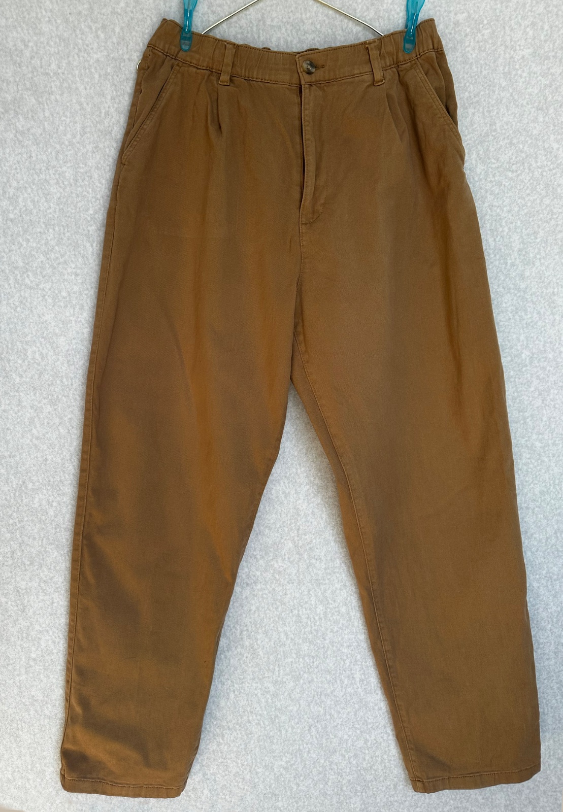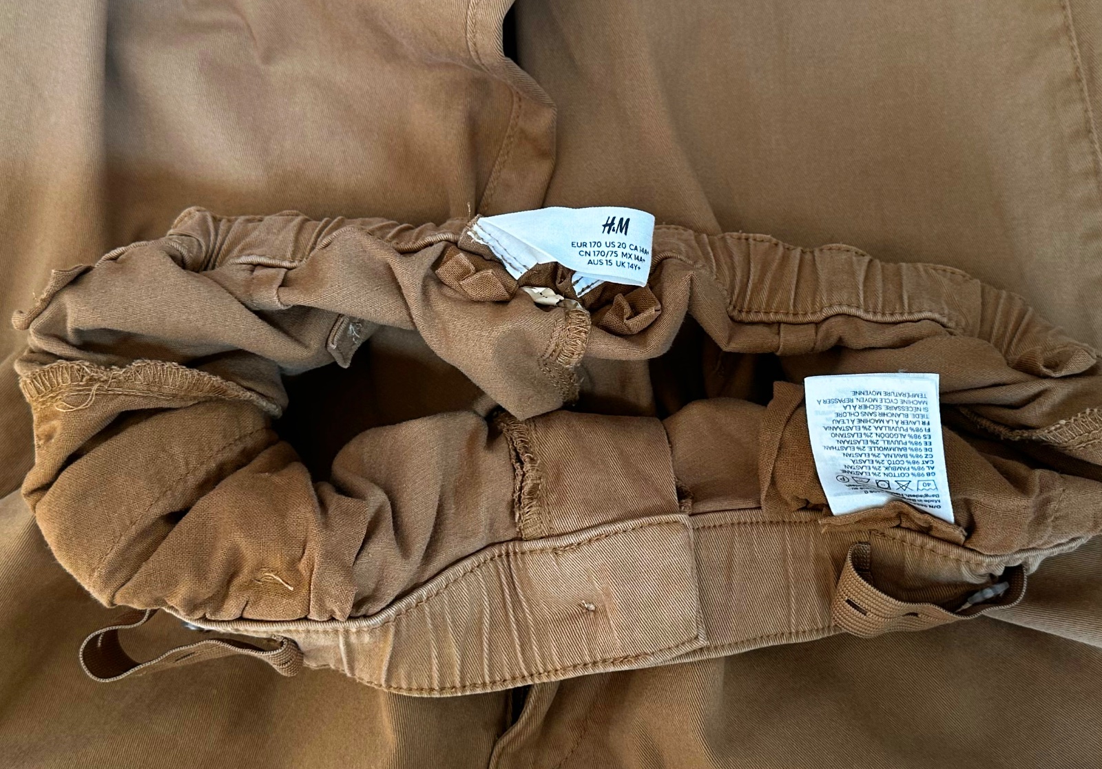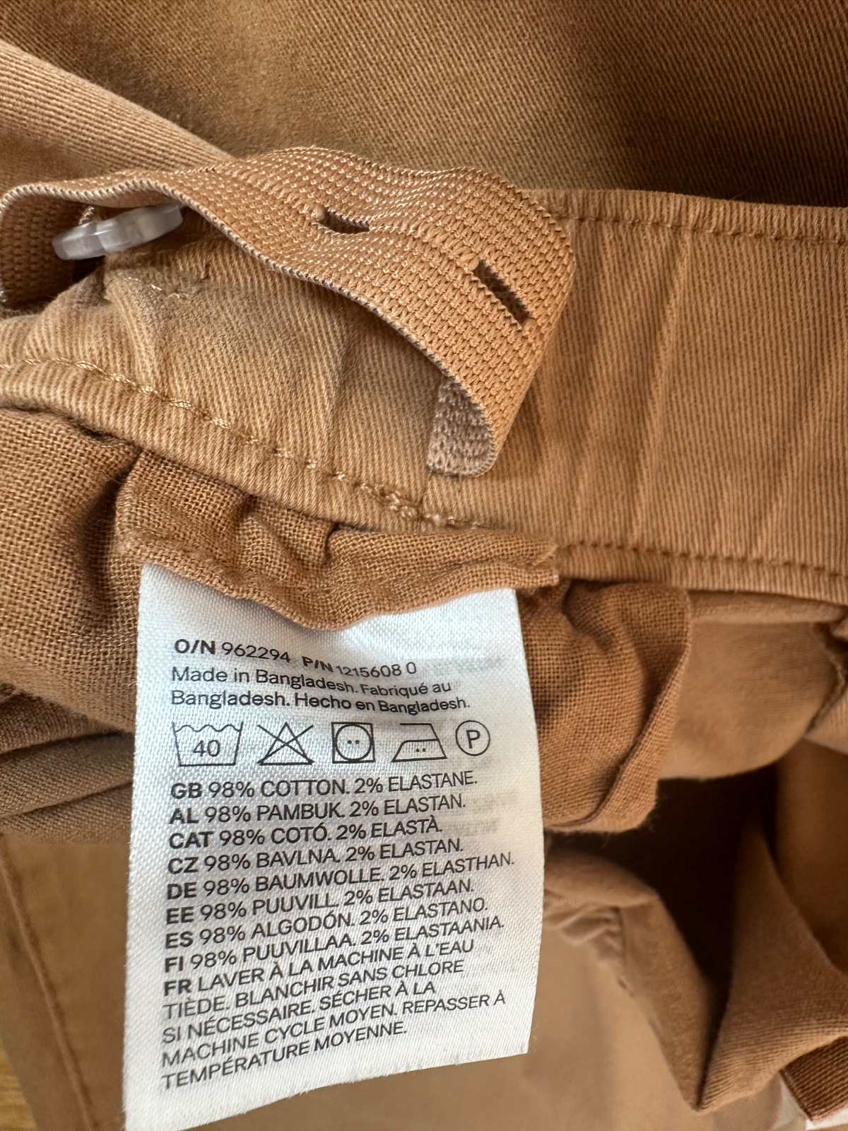 Pohodlné ležérne štýlové nohavice vo farbe ťavej srsti. Nosené jednu sezónu na striedačku s ďalšími pármi nohavíc. V páse je nastaviteľná uťahovacia guma. 98% bavlna, 2% elastan. Pranie v pračke 40°C. V super stave, bez poškodení.