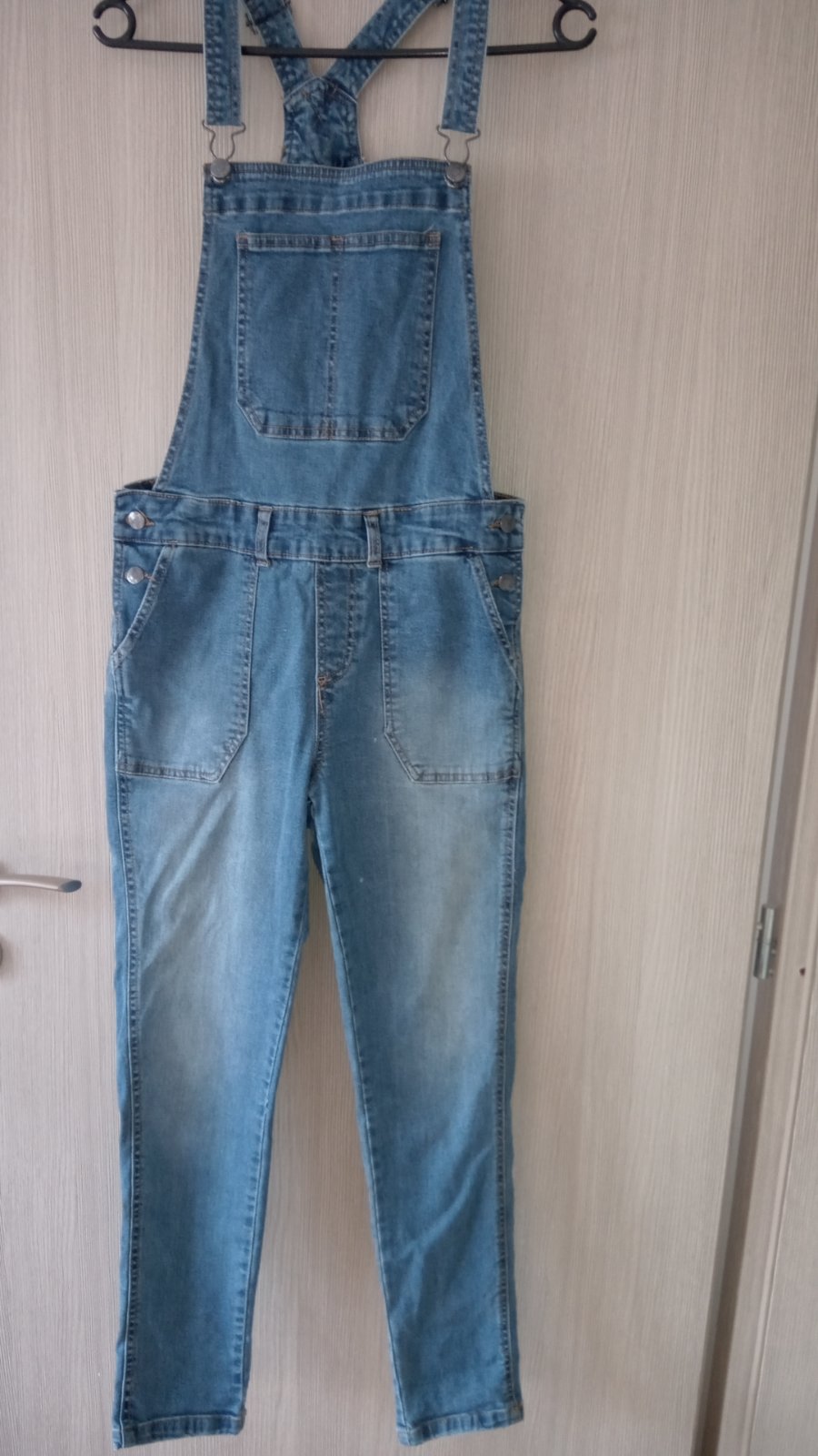 moderné úzke rifle na traky, neboli veľa nosené, na kolene sa trochu natrhla diera viď foto, makkučké, pohodlné, veľ.S celková dĺžka cca 140cm (dá sa upravovať trakmi) pás v kľude 37cm merané v tom...