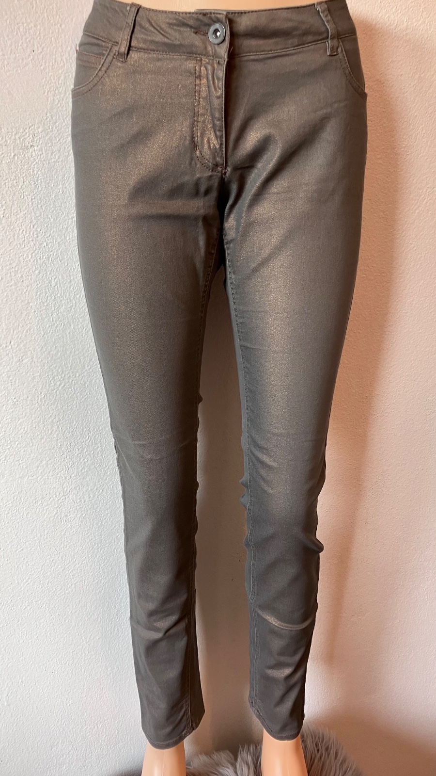 Dámske elegantné rifle s nízkym pásom, lesklé, tenké, elastické, pútka na opasok, dve predné a dve zadné vrecká, zapínanie na gombík a na zips.