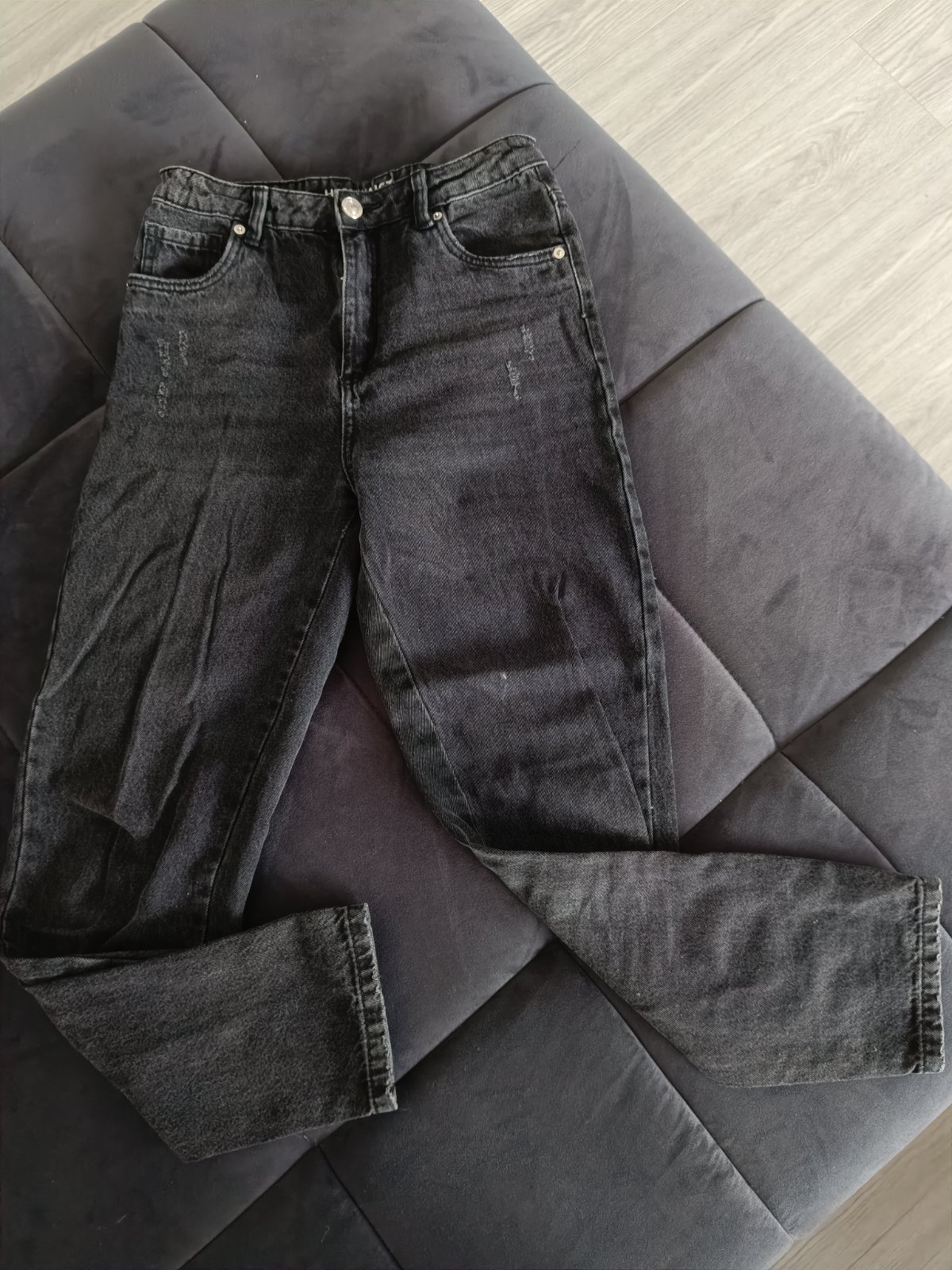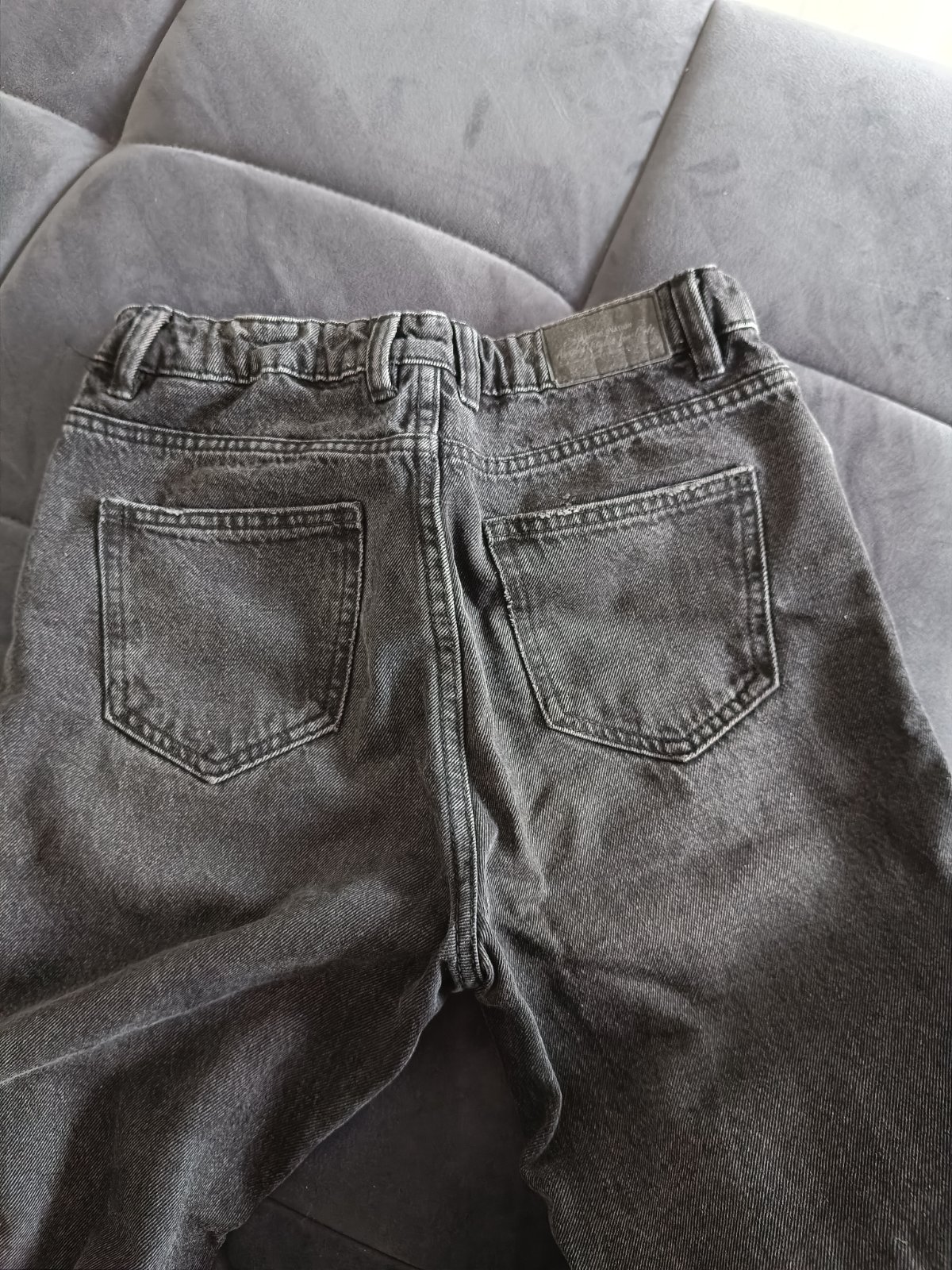 Krásne čierne rifle na gumičku s krásnymi detailami, dvakrát oblečené