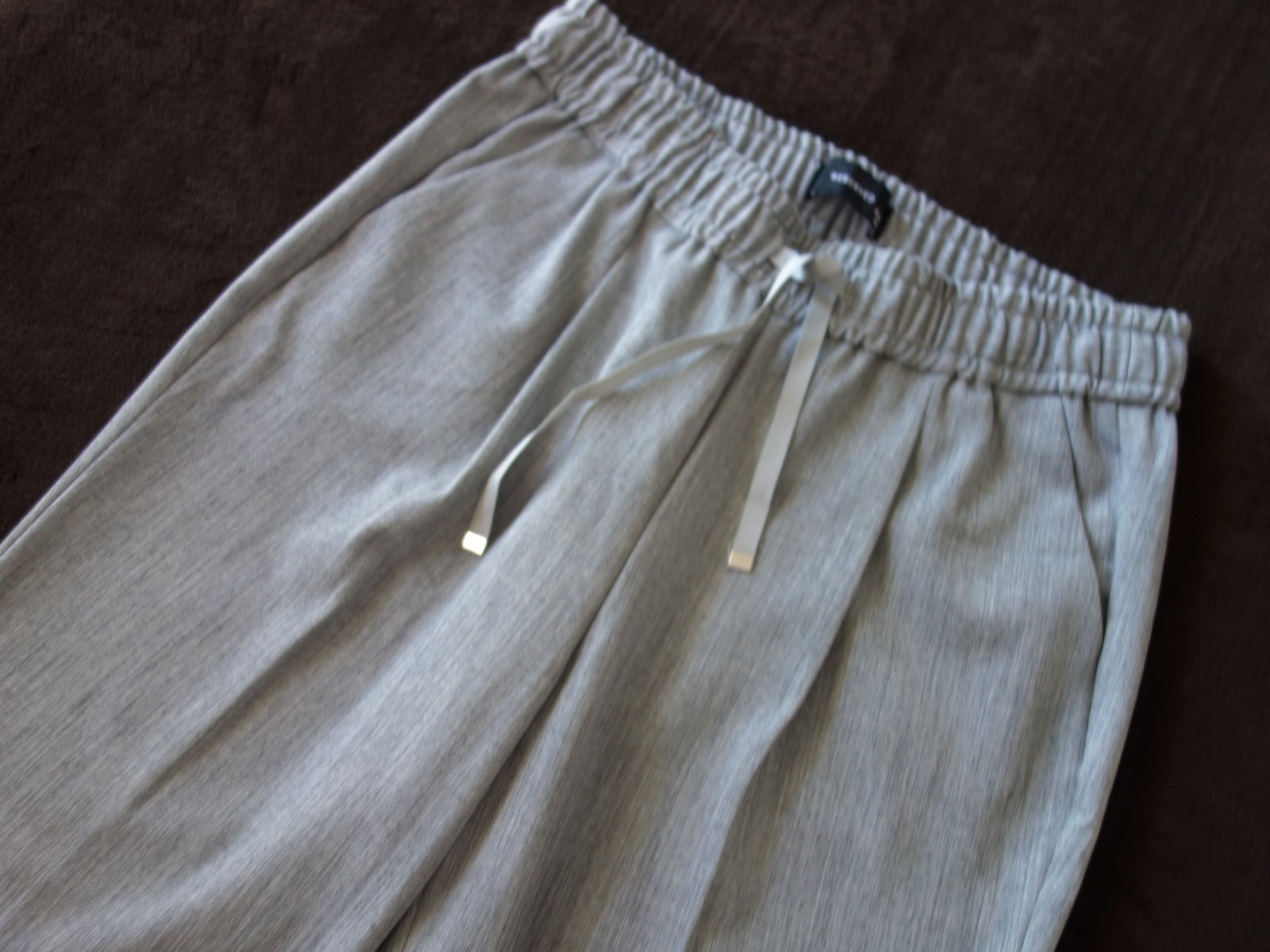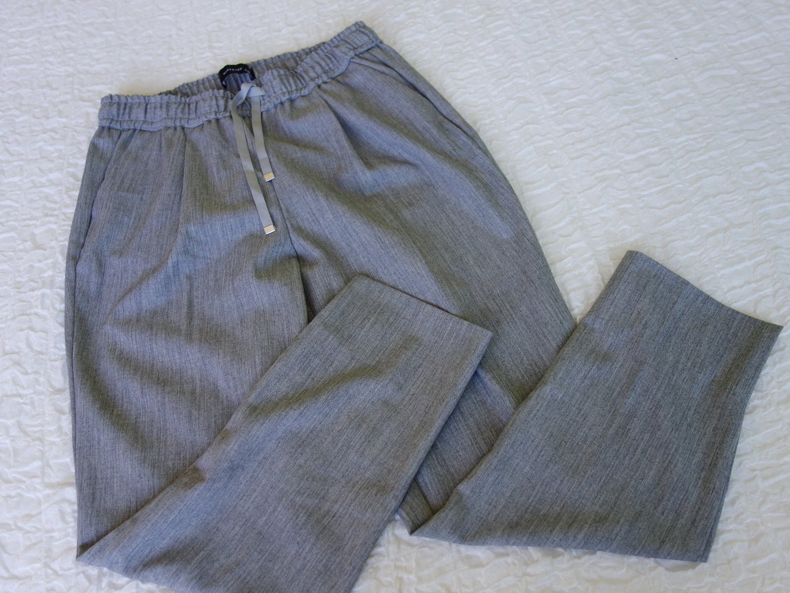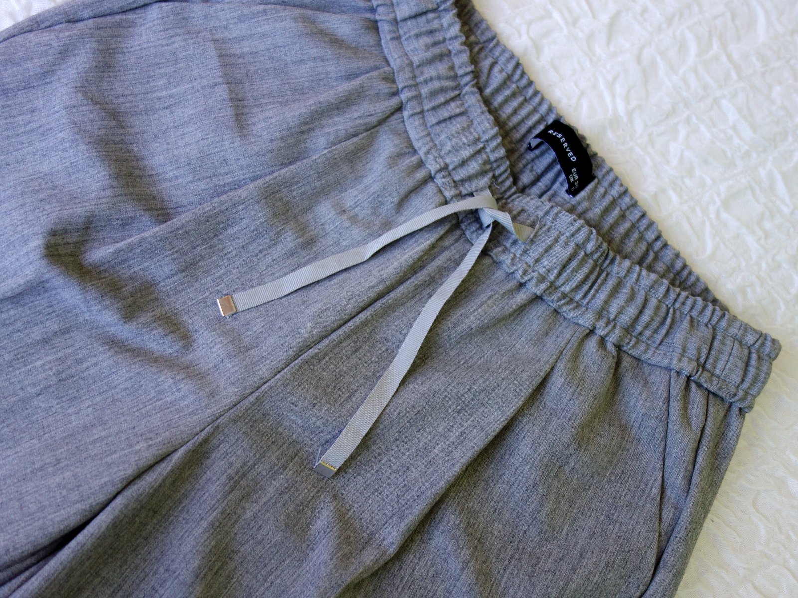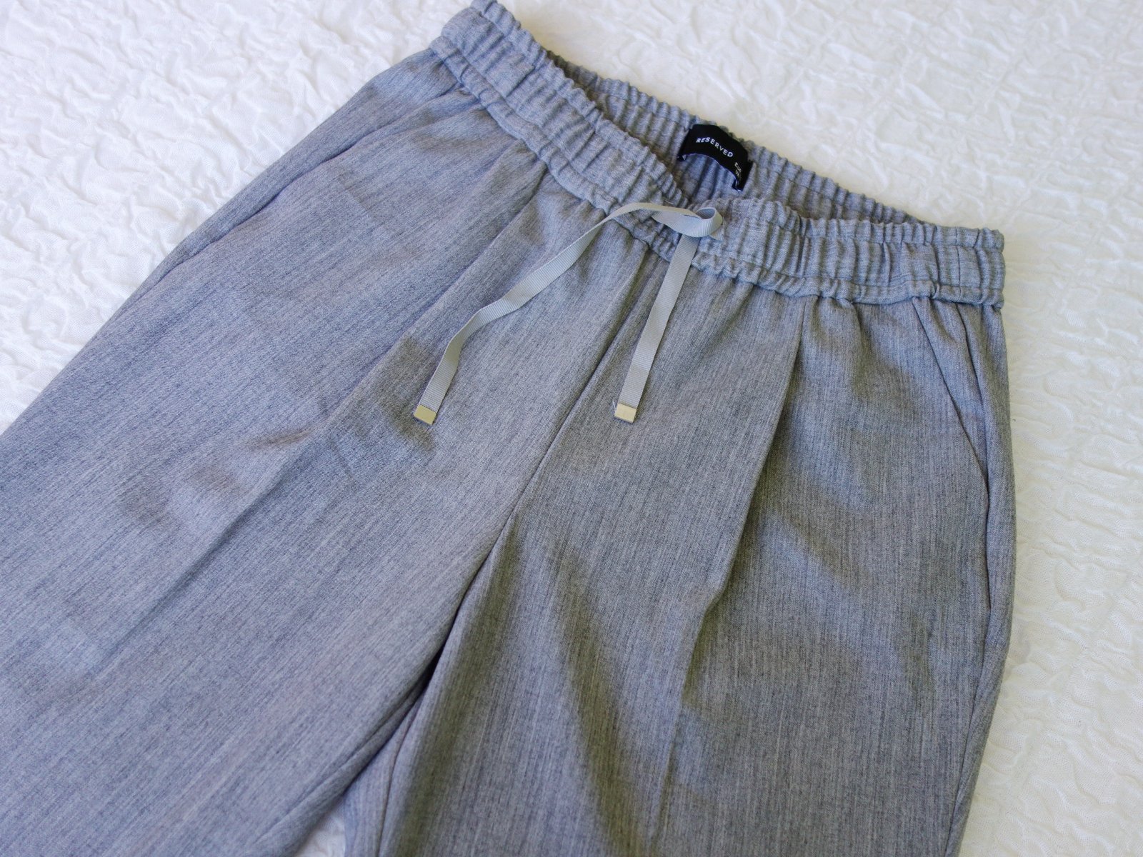 Svetlo šedé nohavice Reserved, veľ. 36, rozmery: bočná dĺžka 88/92cm, od rozkroku 61/65cm, pás je na gumu a šnúrku 2x32-40cm.