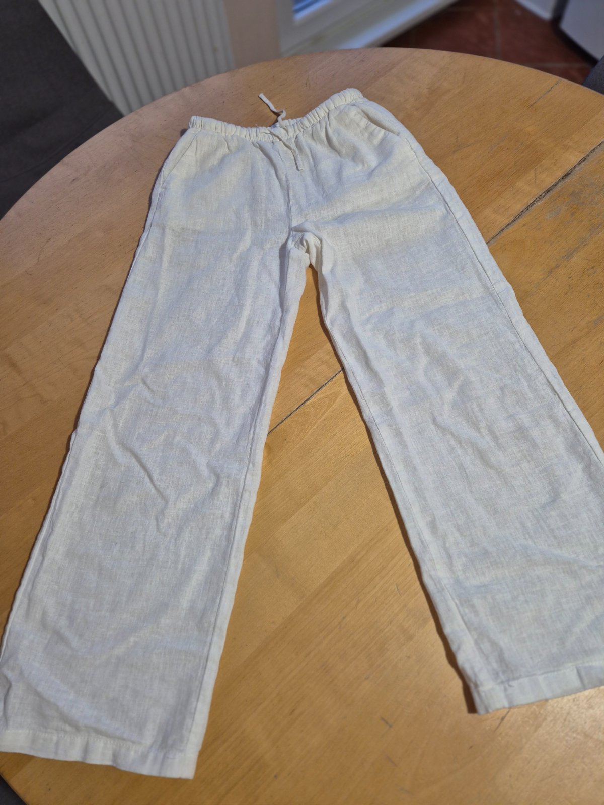 Krasne nohavice vsetky v top stave bez poskodeni, Dlzka 73 cm, biele su lahke lanove nohavice, zelienkave satenove tie su 7/8 dlzka 66cm. Vsetky v pase na gumicku takze sa pekne prisposobia. Kus 10€