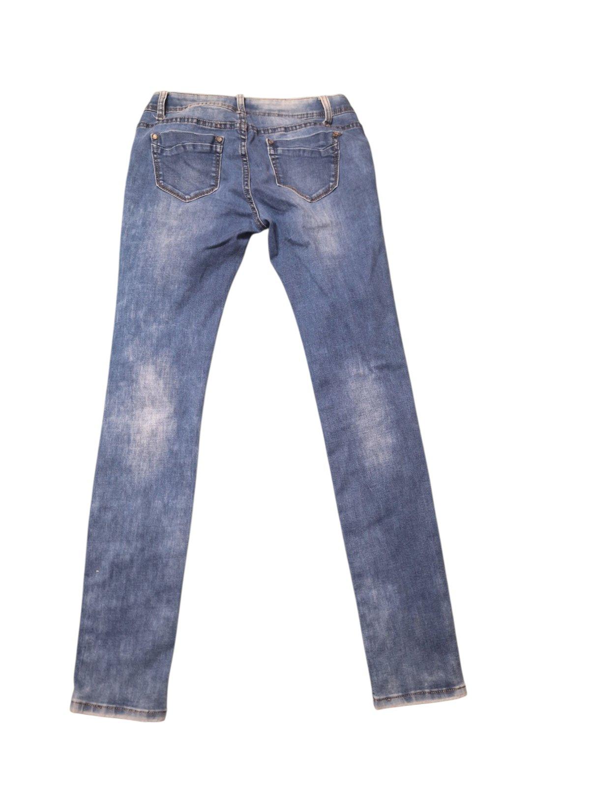 Dievčenské elastické rifle. Zapínanie je vpredu na zips a gombík. Dĺžka je 95cm,obvo dpása v kľude je 74cm,natiahnuté 86cm. kód 1537