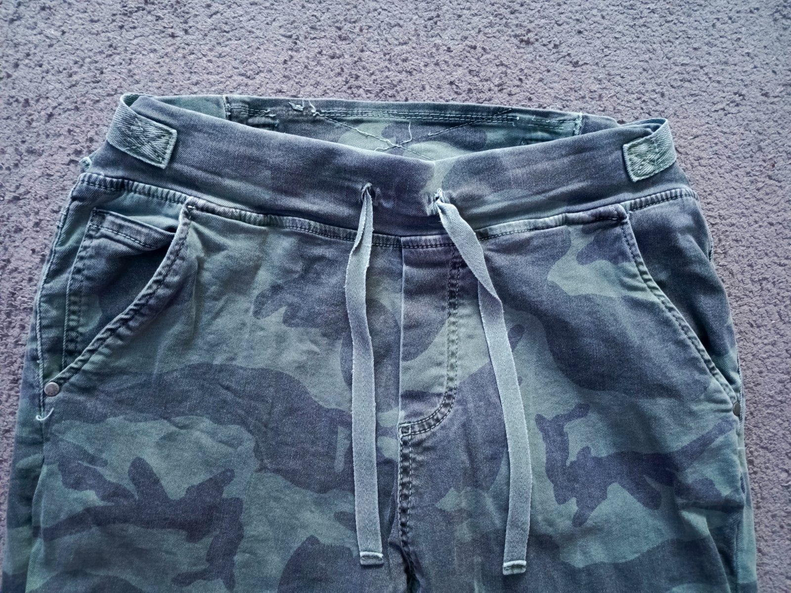 Perfektné elastické nohavice - šampiónky s aplikáciou krídiel! V skutočnosti sú trochu tmavšej zelenej farby. Mám dva kusy! Dĺžka - 96 cm po odhnutí, pás - max. 2x 53 cm, boky - 48/62 cm.